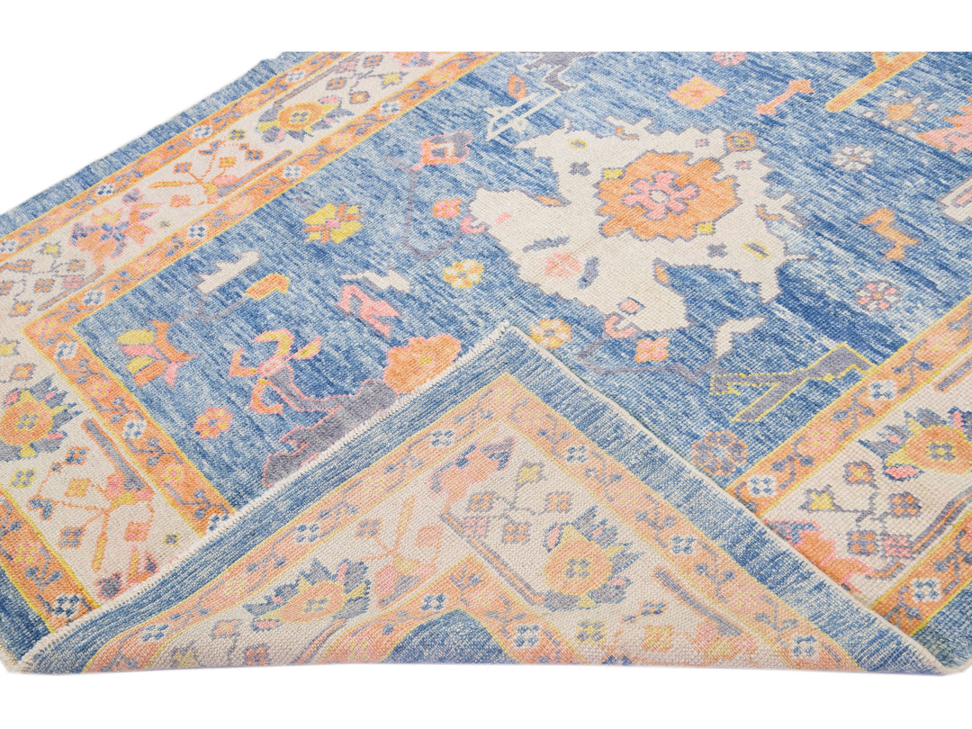 Beautiful modern Oushak hand-knotted wool rug with a navy blue color field. This Turkish Piece has a beige frame with yellow, orange, pink, and green accent colors in a gorgeous all-over floral design.