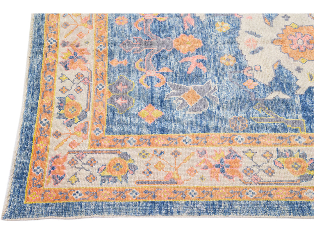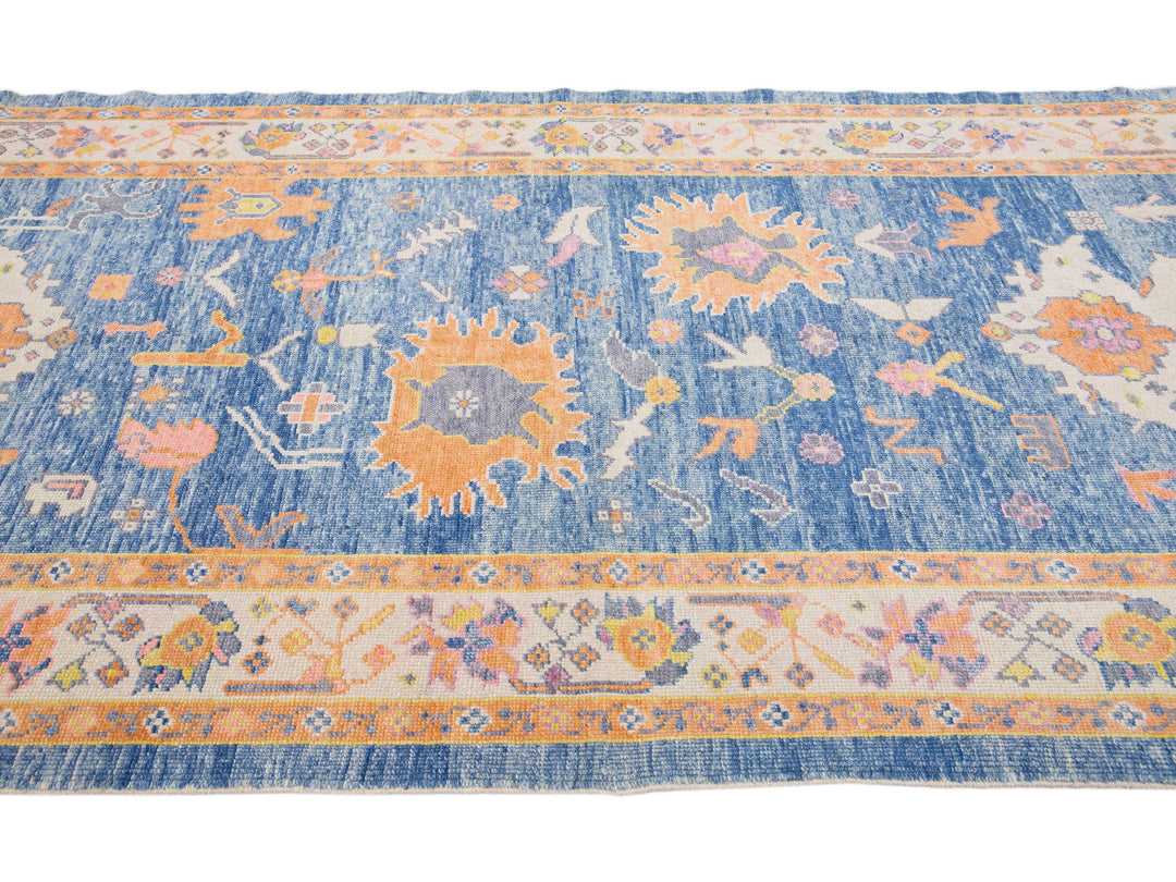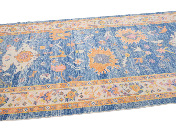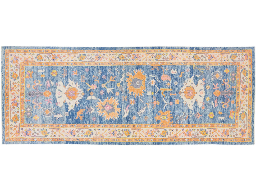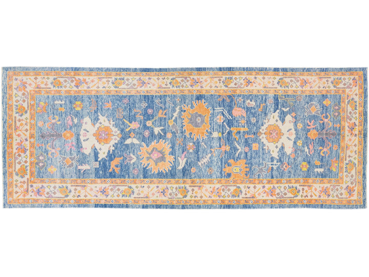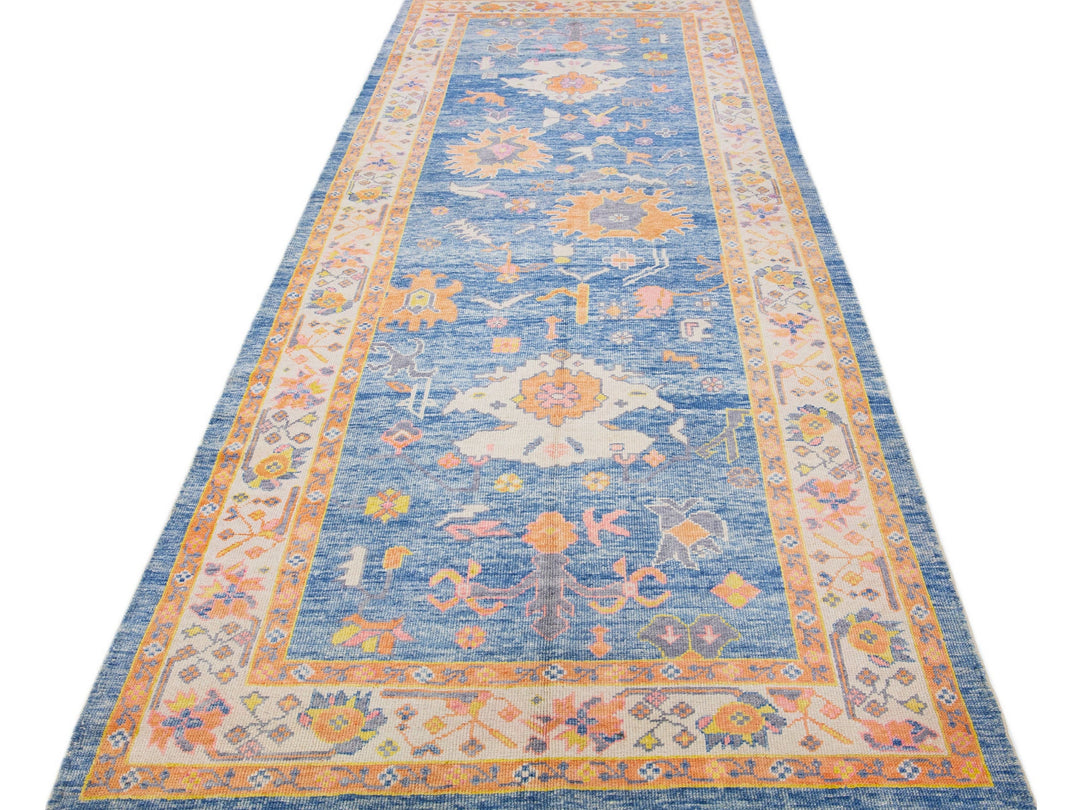 Modern Turkish Oushak Blue & Orange Handmade Designed Wool Runner
