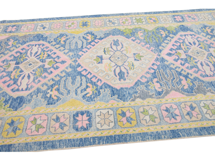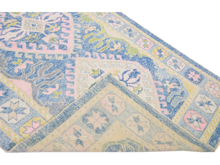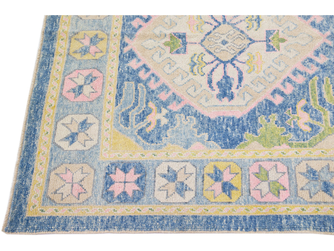 Beautiful modern Oushak hand-knotted wool rug with a blue color field. This Turkish Piece has yellow, gray, and pink accent colors in a gorgeous tribal design.