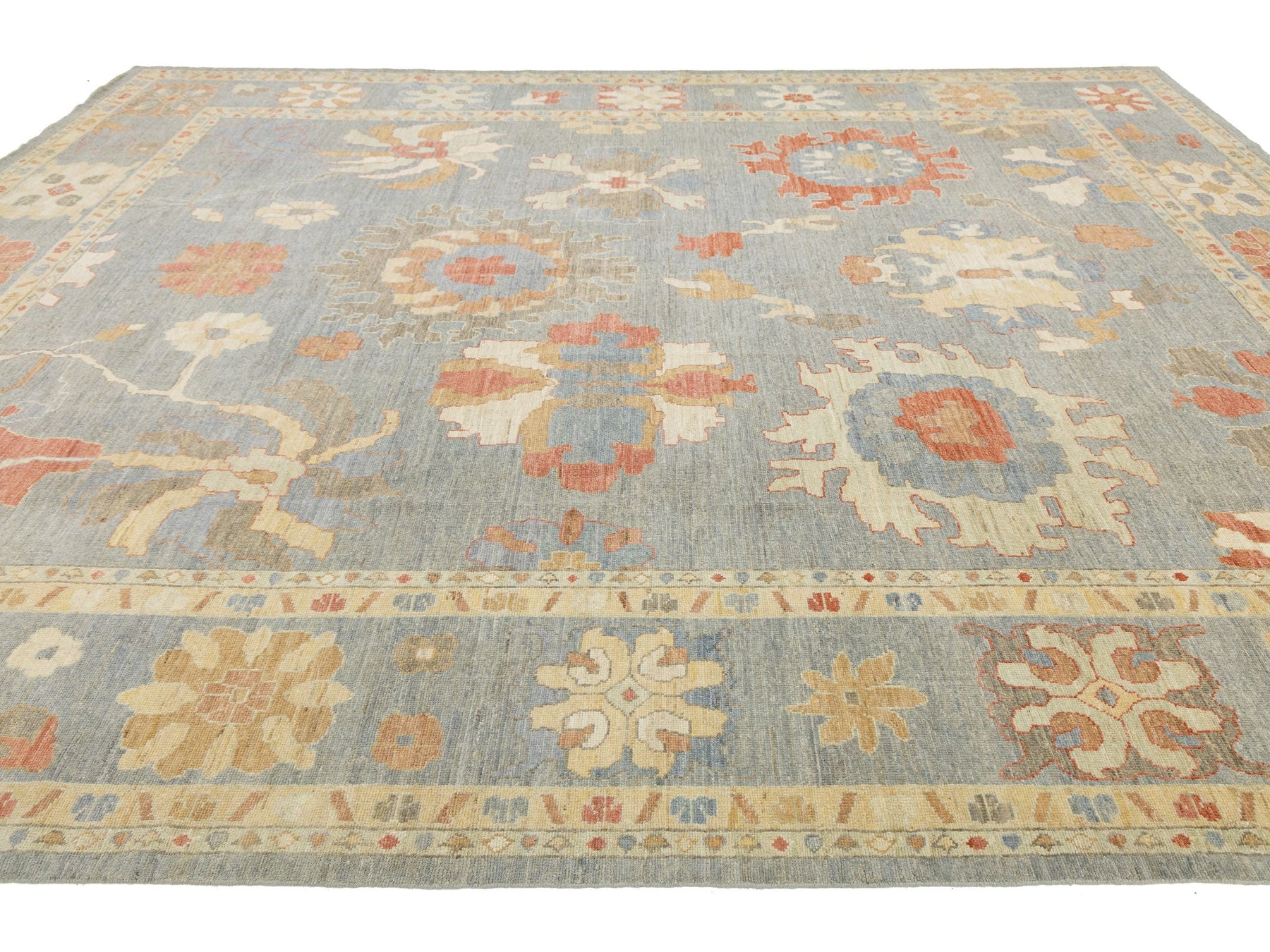 Elevate your space with this Modern Oushak Style Wool Rug, featuring a slate blue field and oversized palmettes. Hand-knotted from high-quality wool, it blends traditional Turkish design with a muted color palette of terracotta, cream, sage, and ochre. Its low-pile texture and soft color transitions make it perfect for Transitional, Coastal, or Modern Farmhouse aesthetics. The wide border frames the whimsical floral motifs beautifully. This rug measures 12'2" x 15'6".