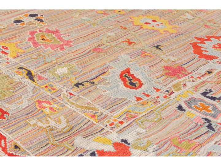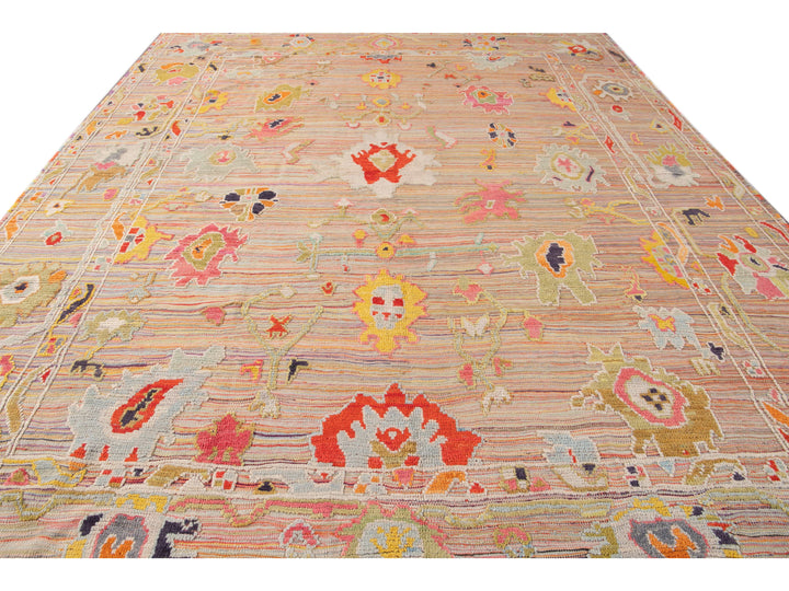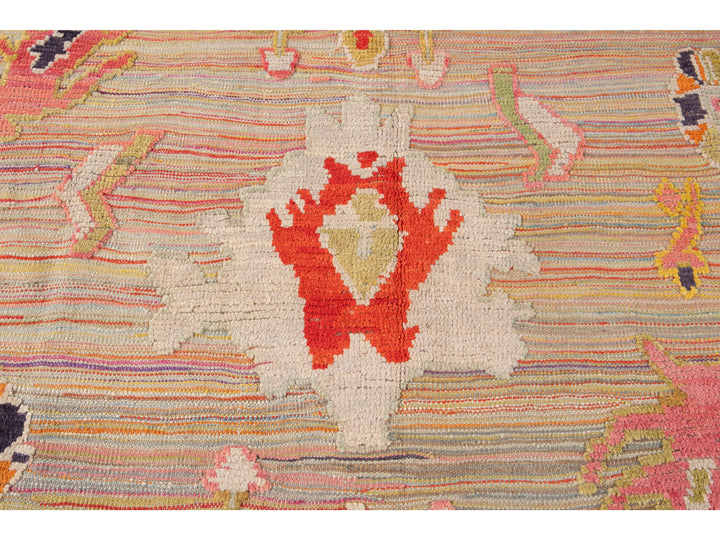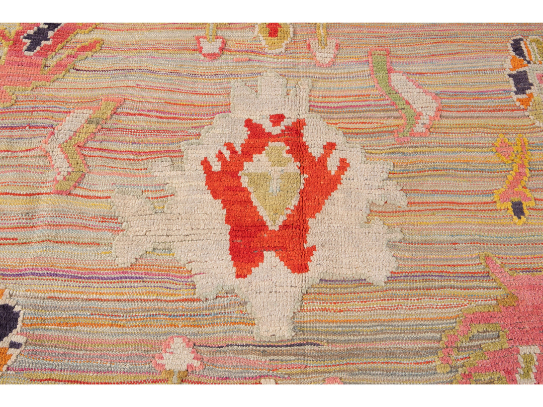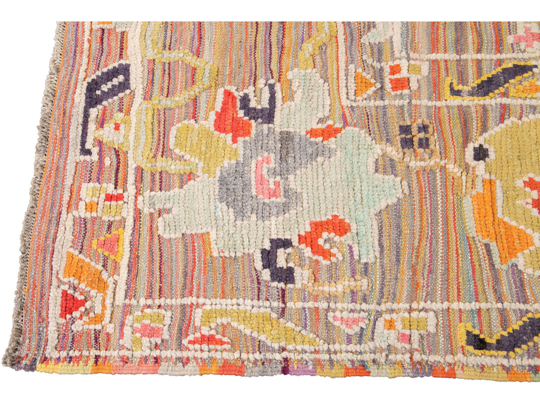 Beautiful modern Tulu hand-knotted wool rug with a multicolor field. This Tulu rug has blue, pink, green, yellow, and gray accents layout a gorgeous all over floral design.