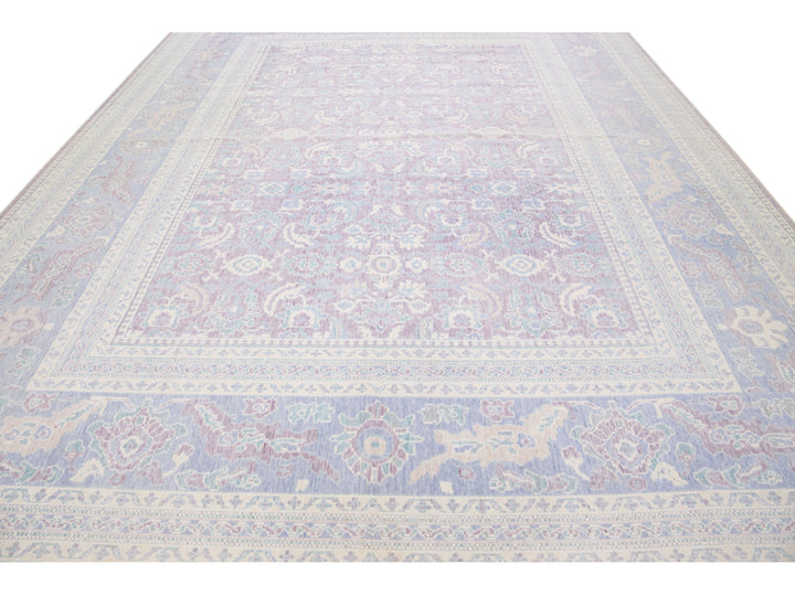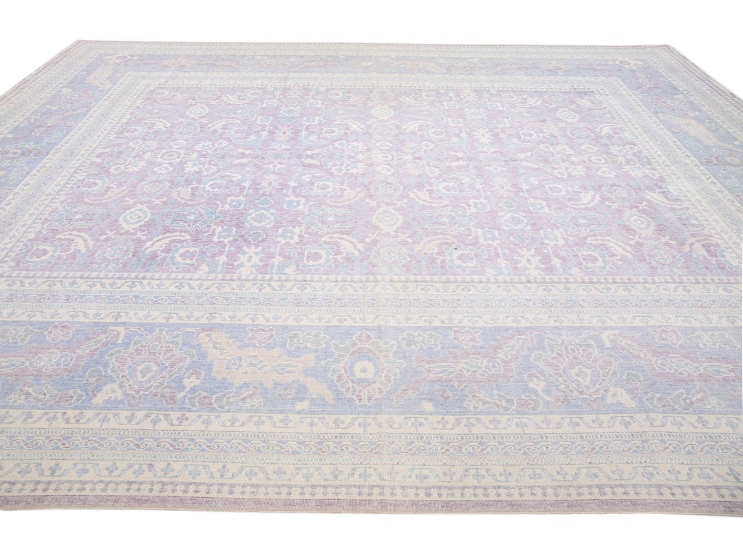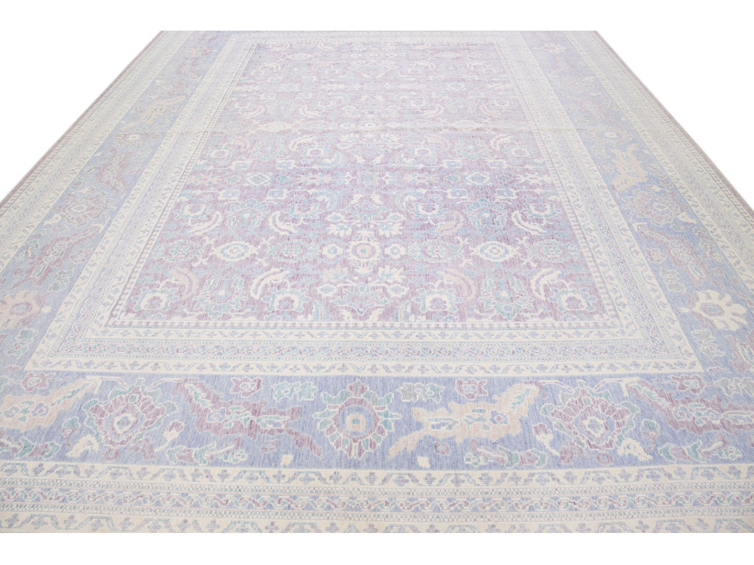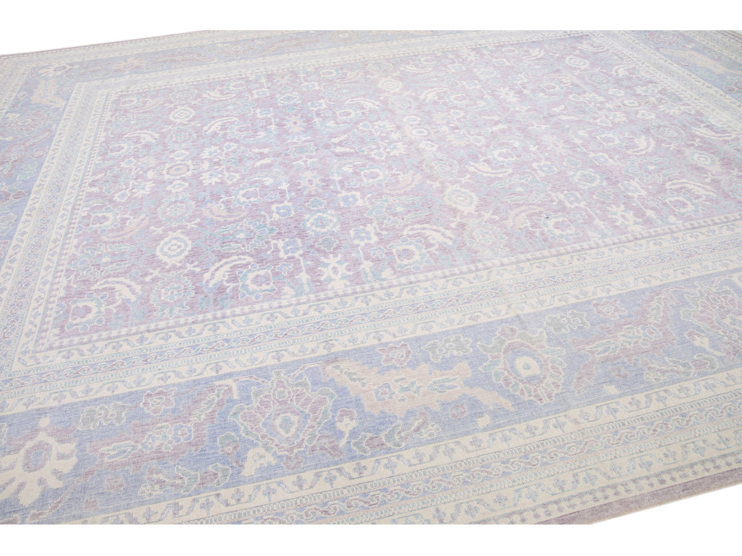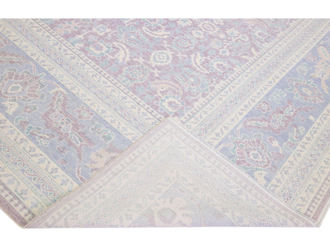 Beautiful modern Turkish hand-knotted wool rug with a light purple field. This piece has blue and beige accents in a gorgeous all-over floral pattern design.