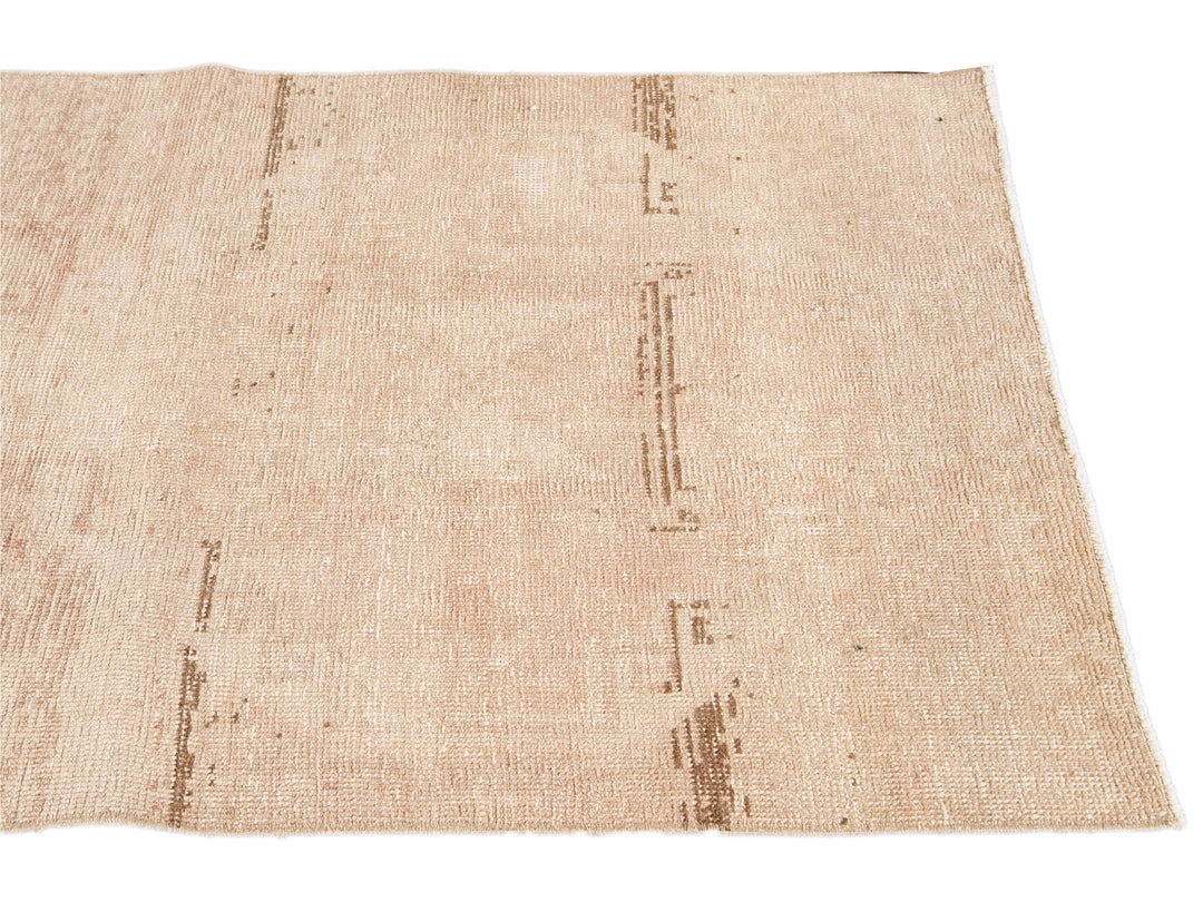 Beautiful vintage Turkish hand knotted wool rug with a tan field. This rug has beige accents in a gorgeous all-over geometric tribal design,
