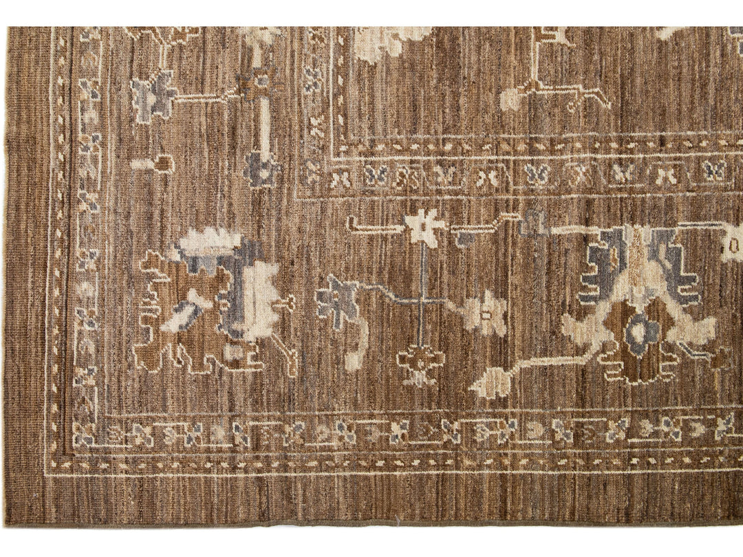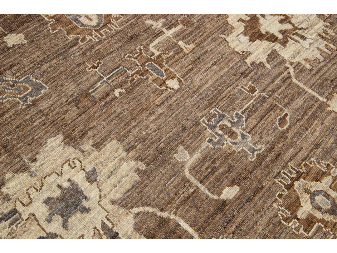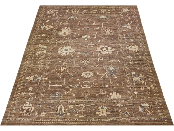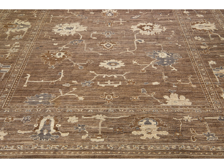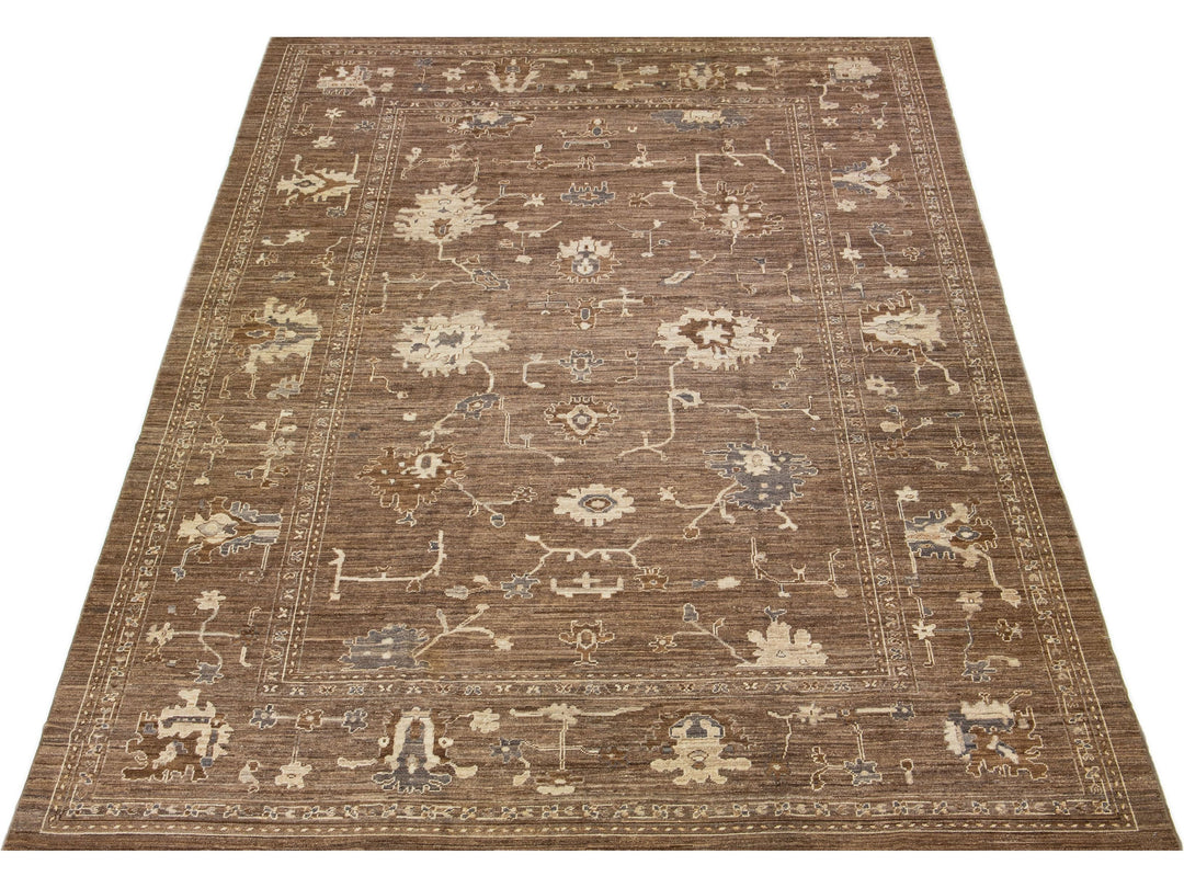 Beautiful contemporary Oushak hand-knotted wool rug with a brown color field. This Oushak rug has a scattered beige and gray spray of vine scroll designed frame and an all-over floral design.