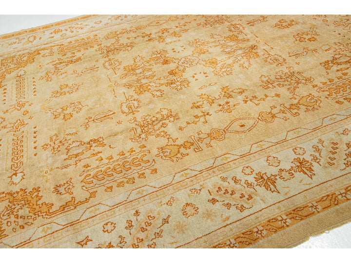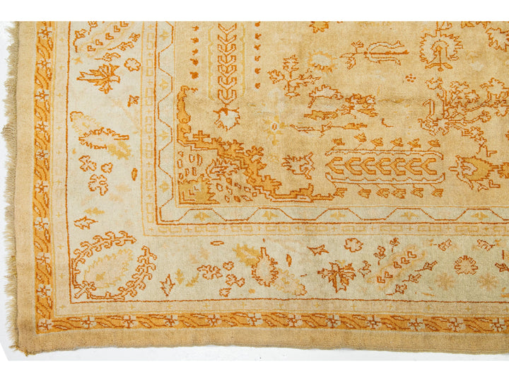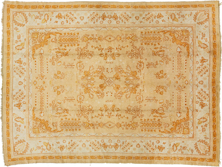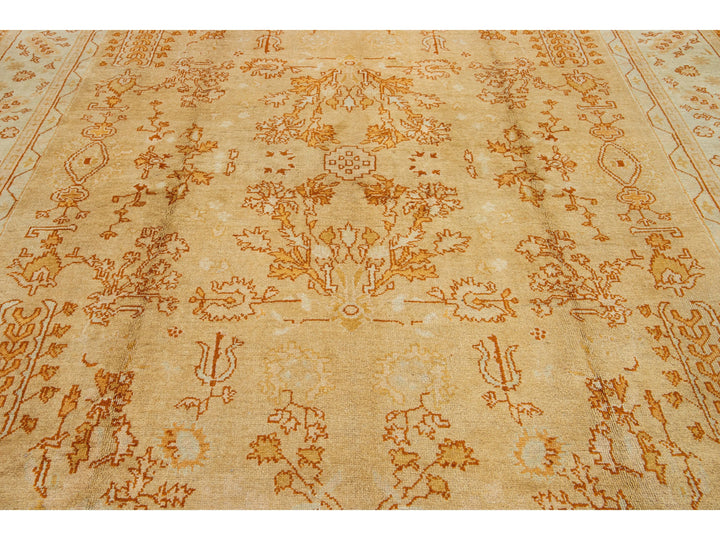 Elegant Turkish Oushak area rug. Handmade with premium wool. Tan beige background, light blue border, vibrant floral pattern with orange and golden details. Measures 9'5'' x 12'8''.