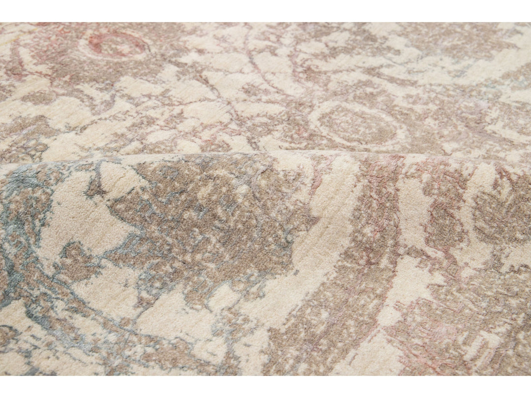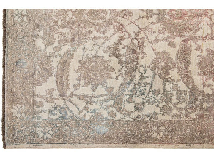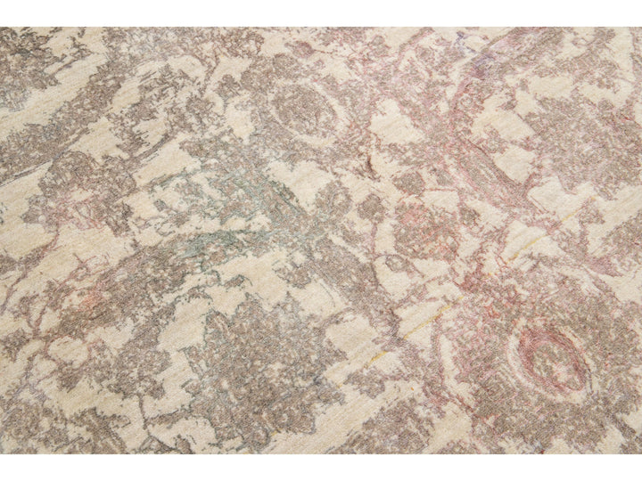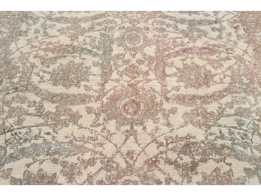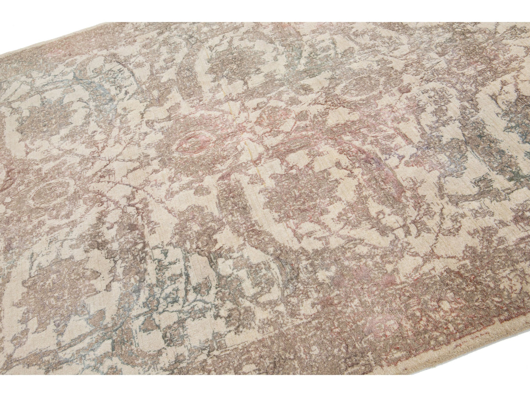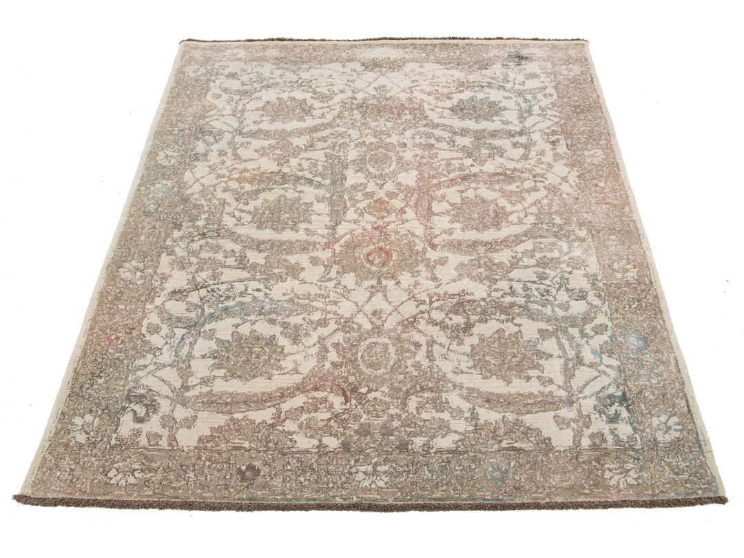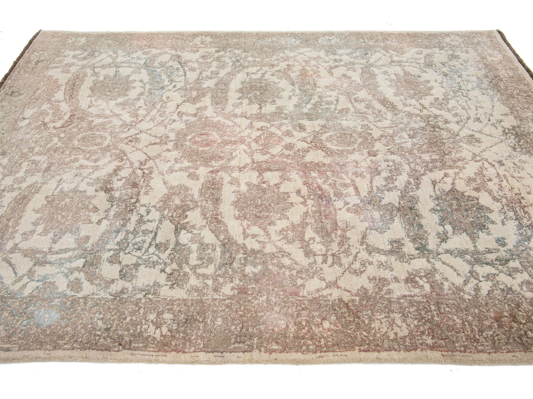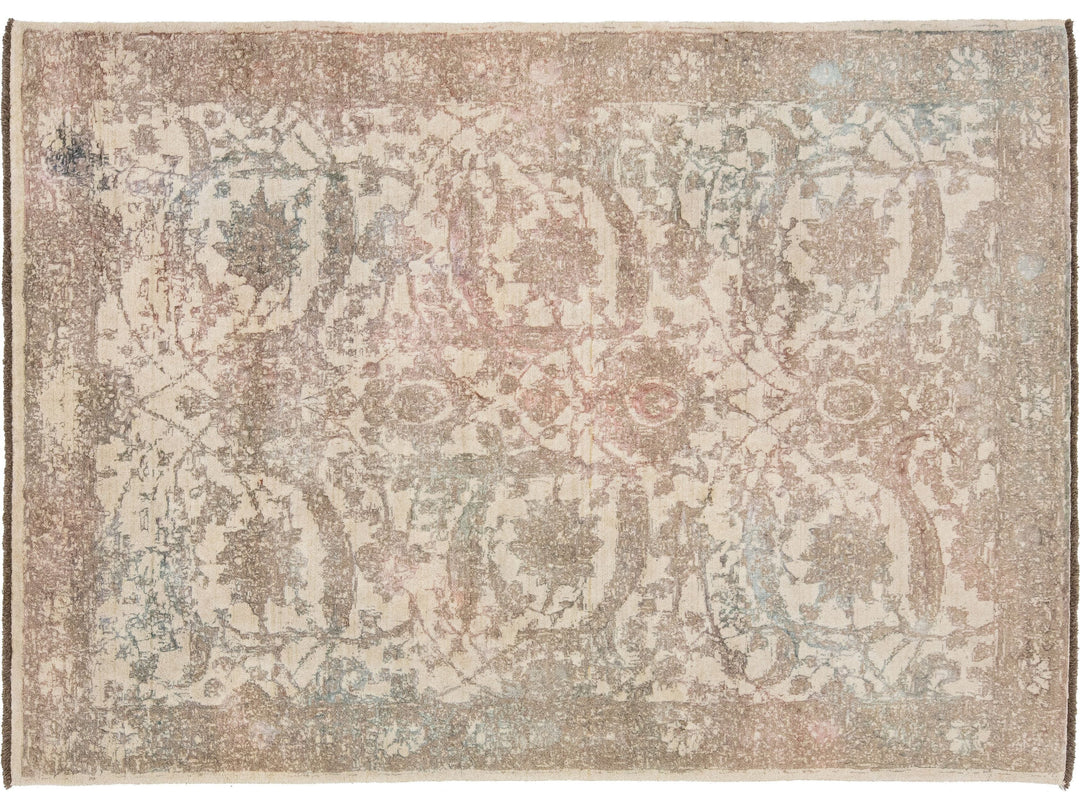 A beautiful modern Oushak rug made of hand-knotted wool. The rug features a beige field with brown, green, and peach accents in a stunning floral design. This rug measures 5'7" x 7'11".