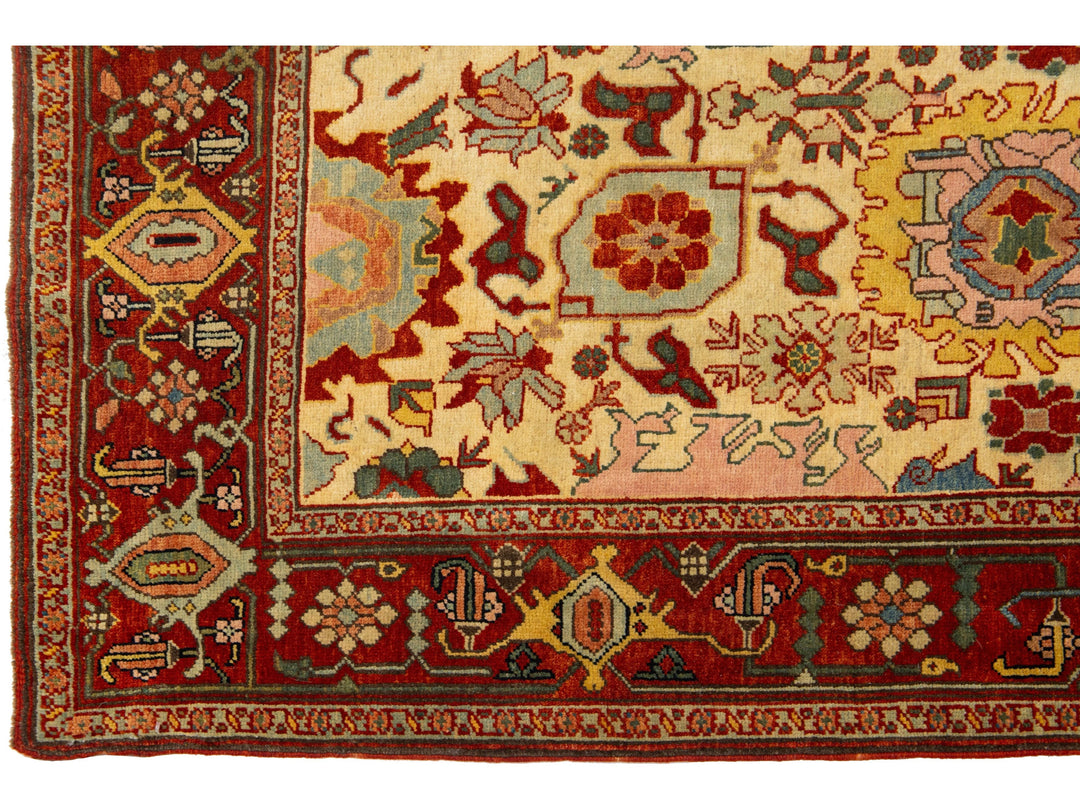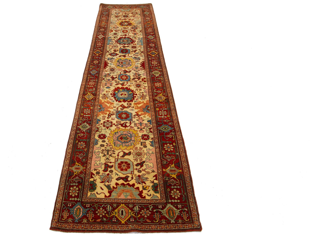 This beautiful modern Oushak hand-knotted wool rug features a beige color field. It is a Turkish piece with a red frame and stunning accent colors of blue, yellow, green, and pink, all woven into a gorgeous all-over floral design. This rug measures 2'9" x 12'6".