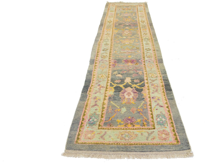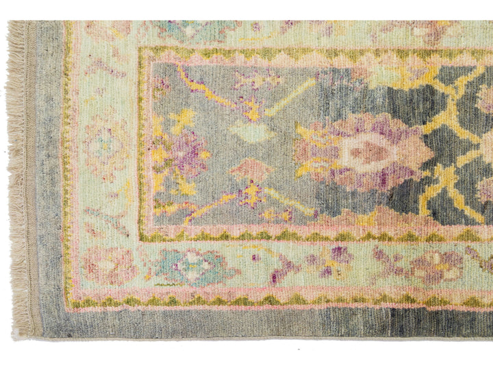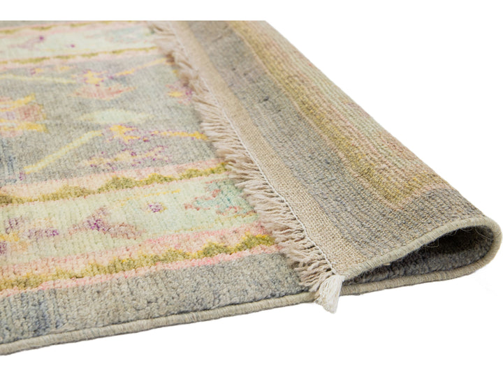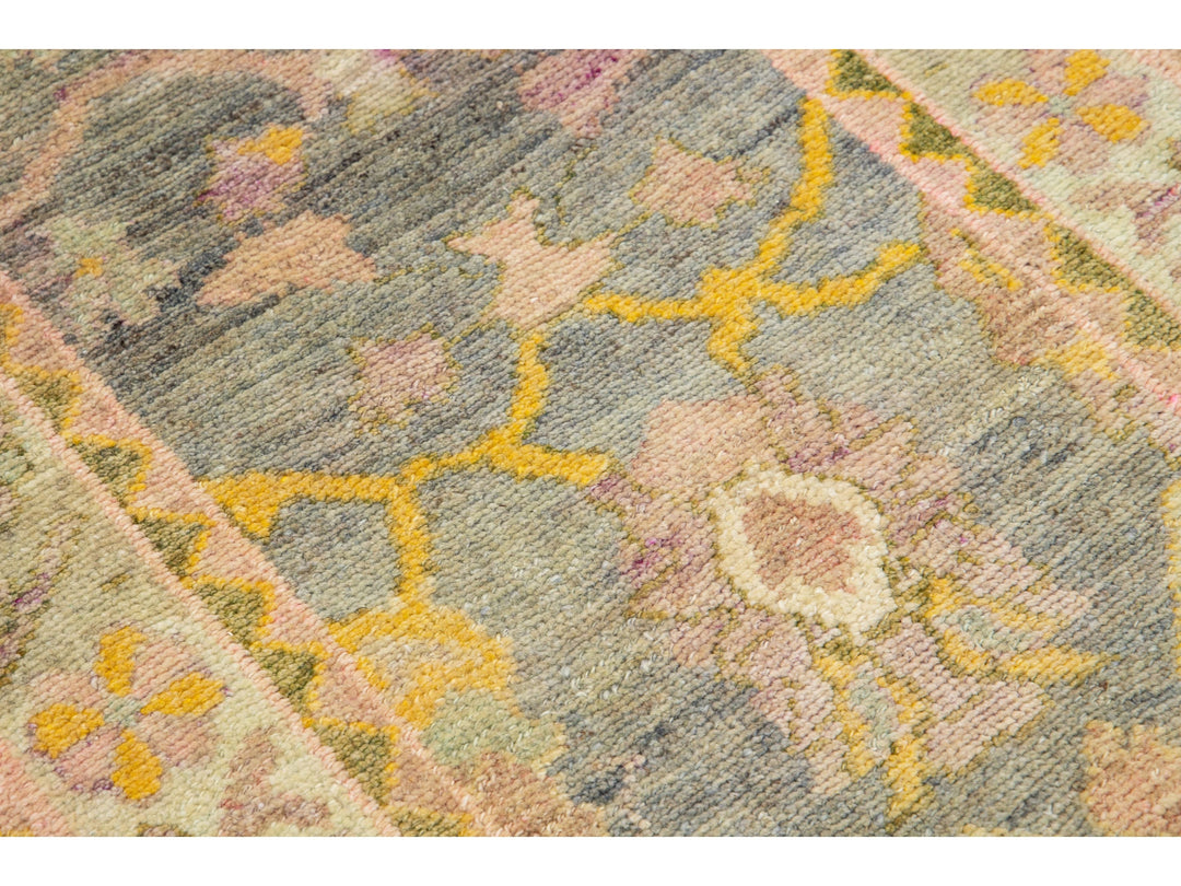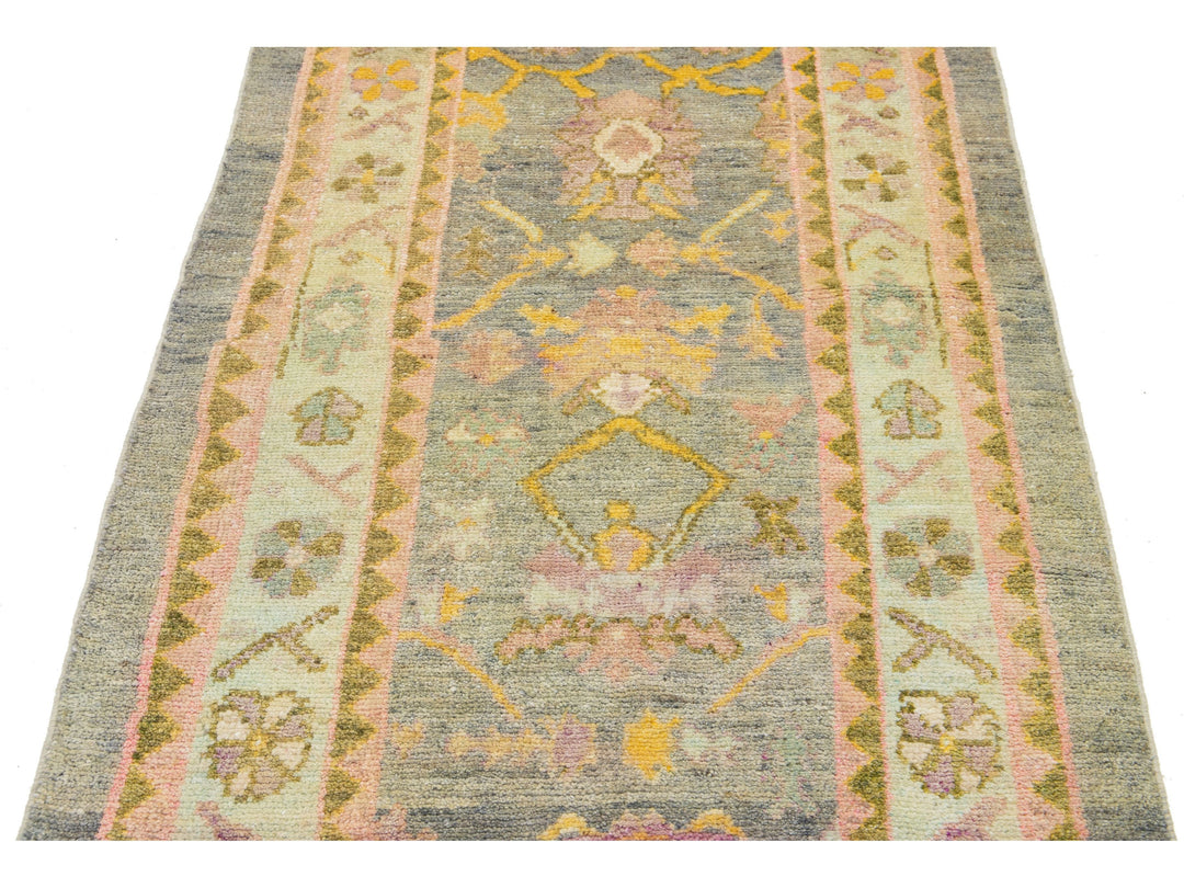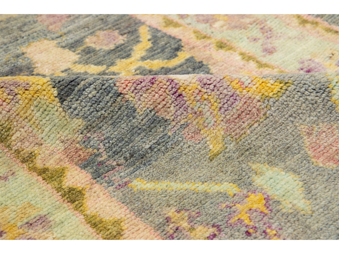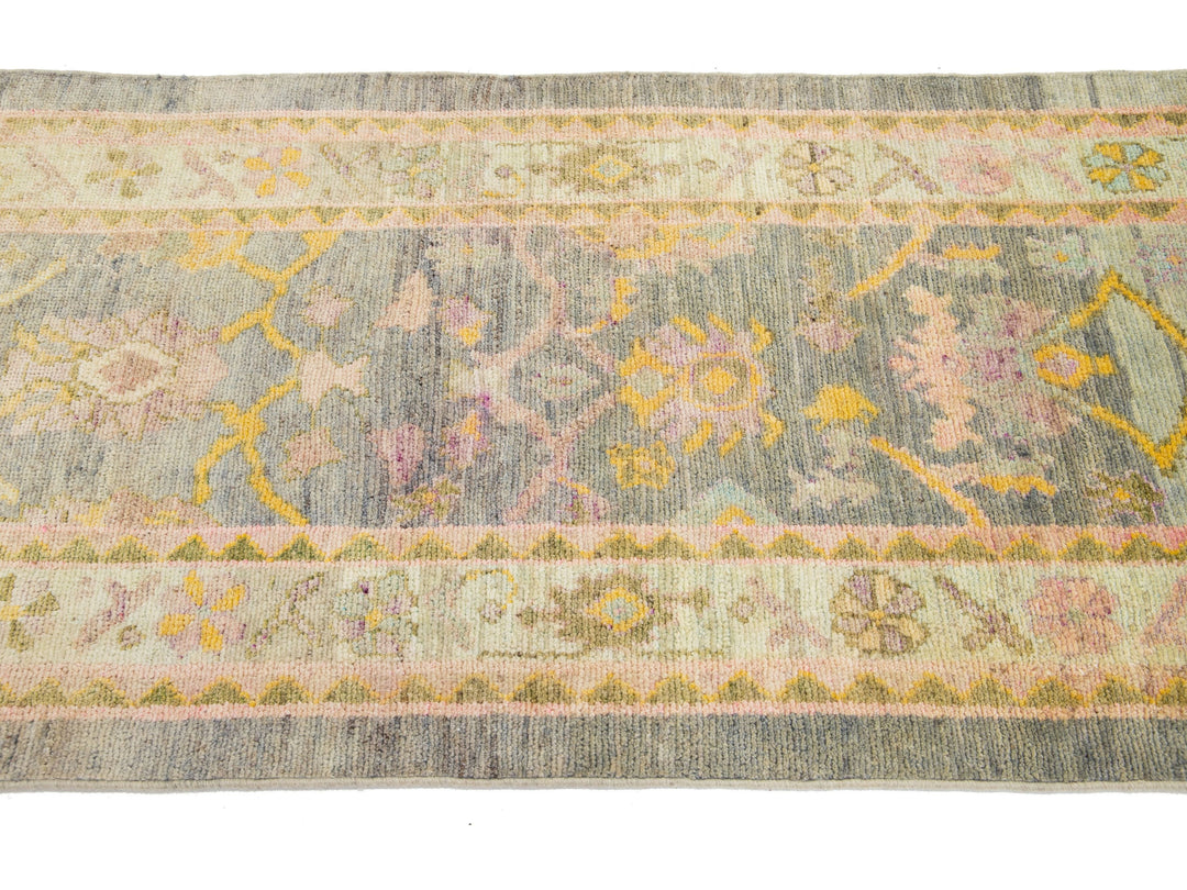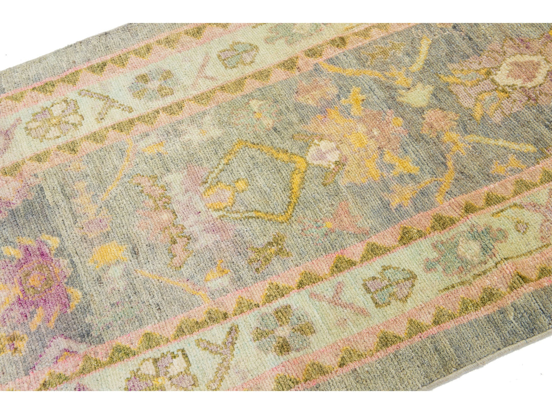 This beautiful modern Oushak hand-knotted wool rug features a gray color field. It is a Turkish piece with stunning accent colors of blue, yellow, pink, and brown, all woven into a gorgeous all-over floral design. This rug measures 3' x 13'1".