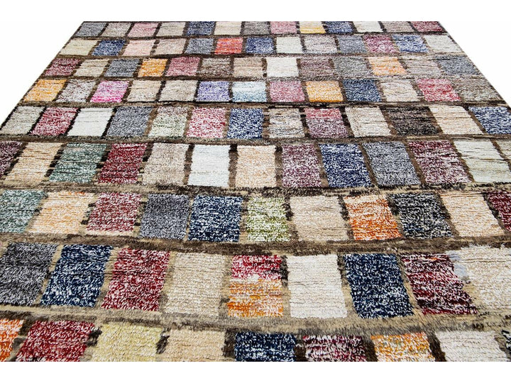 Brown Modern Turkish Tulu Handmade Multicolor Square Designed Pattern Wool Rug