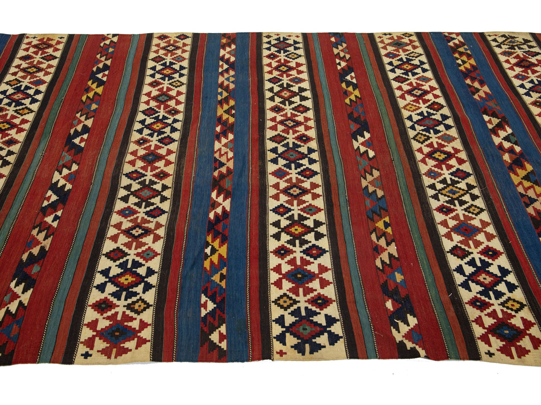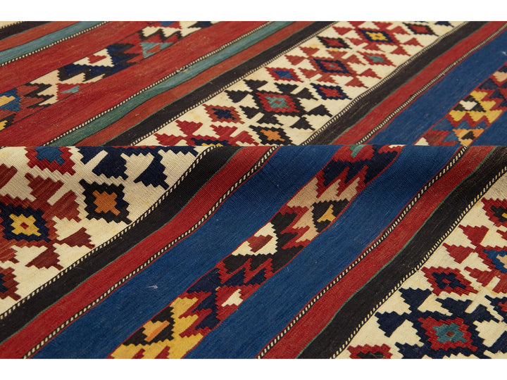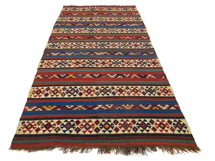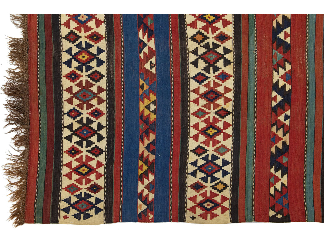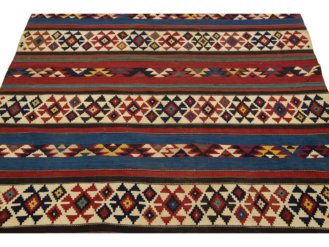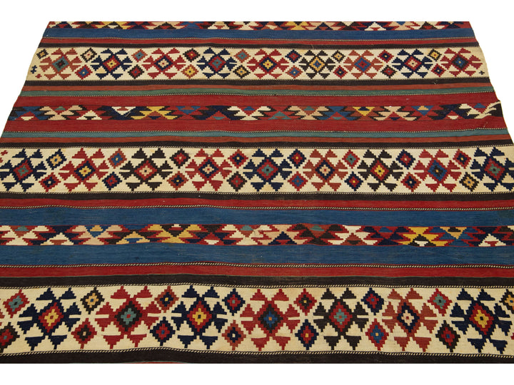 Introducing a stunning vintage kilim wool rug, meticulously hand-woven with a captivating geometric design set against a striking beige, blue, and red backdrop. This rug measures 4'11" x 10'11".