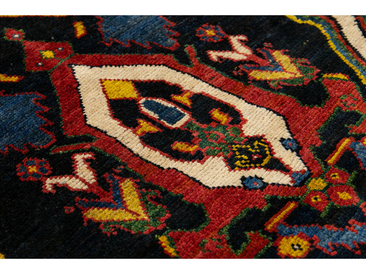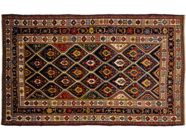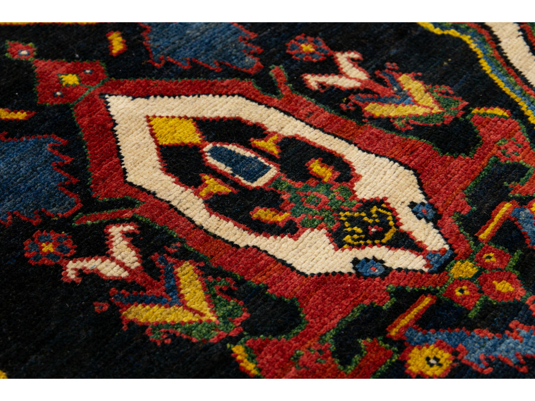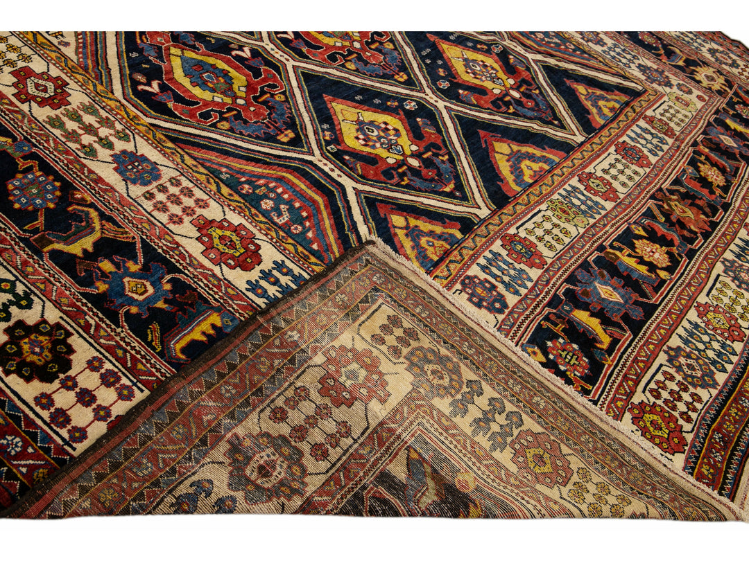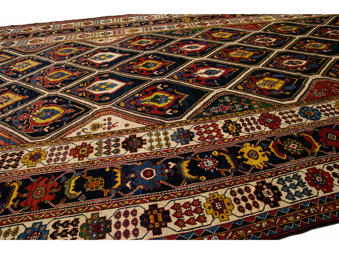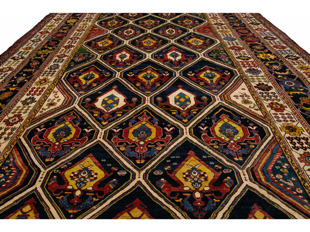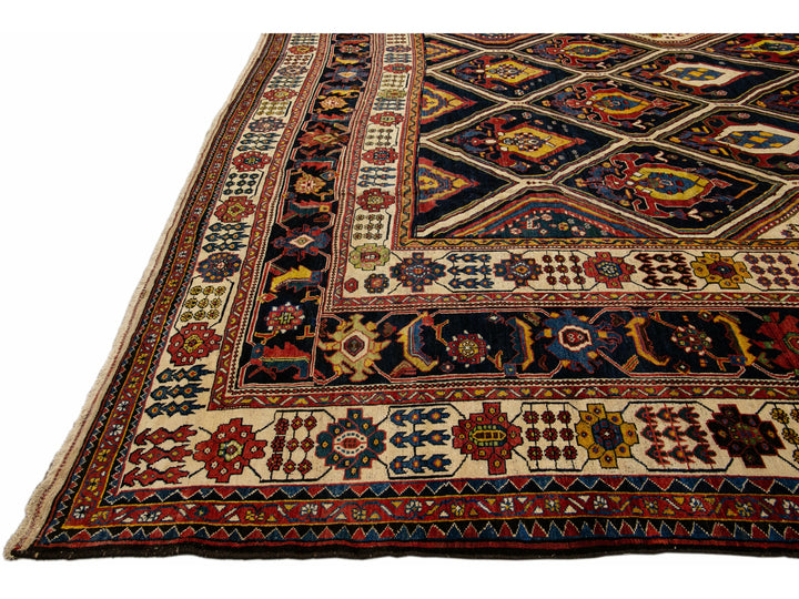Beautiful antique Bakhtiari hand-knotted wool rug with a navy-blue field. This piece rug has a beige-designed frame and multi-color accents on a gorgeous Classic geometric floral pattern design.