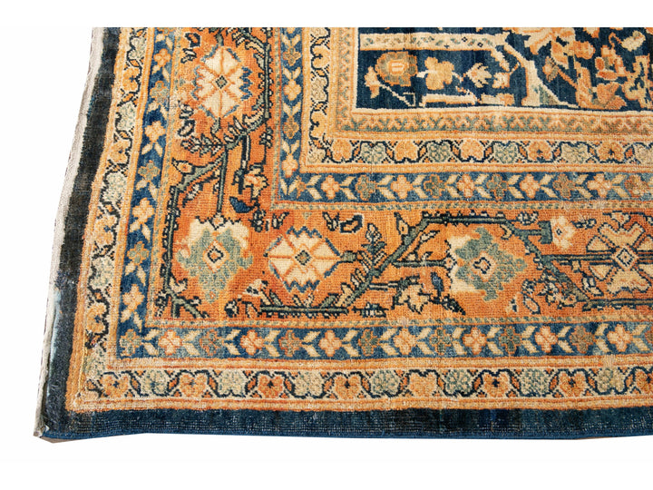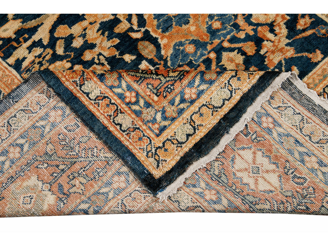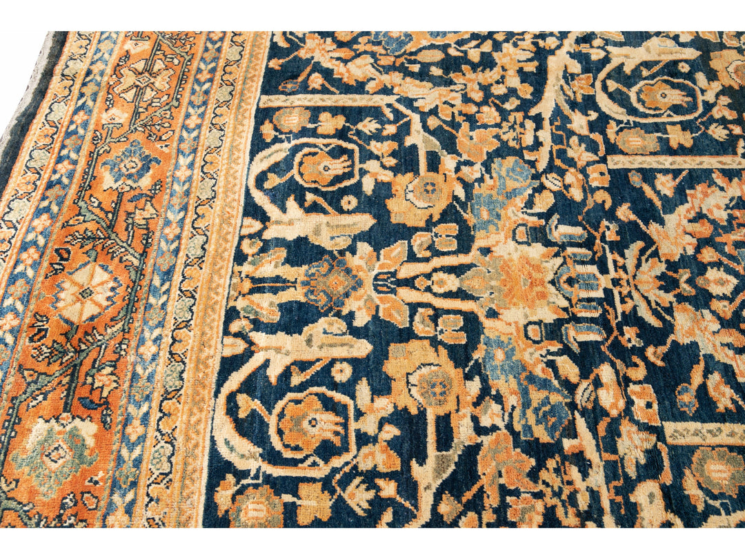 Beautiful hand-knotted antique Mahal wool rug with the blue field. This Persian rug has an orange-peach frame and beige and brown accents featuring an allover floral pattern design.
