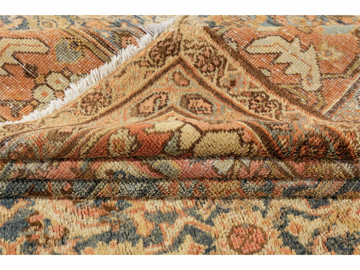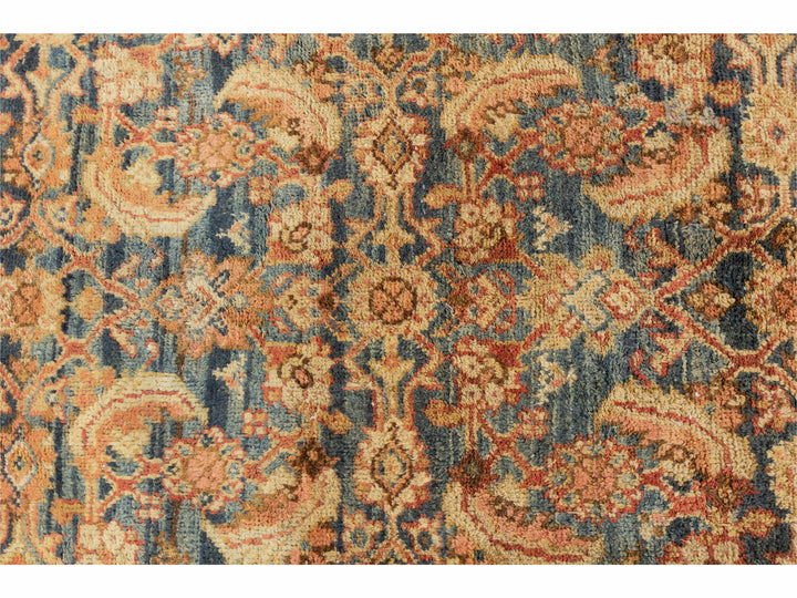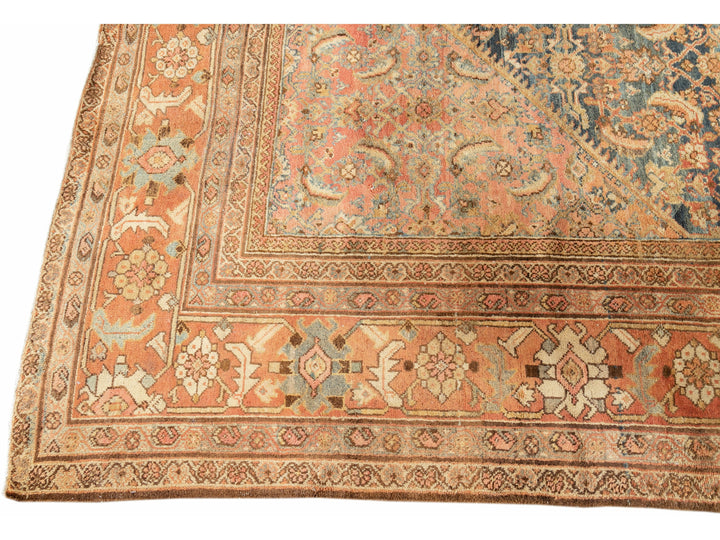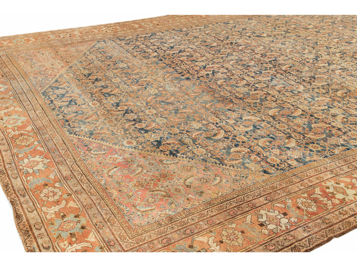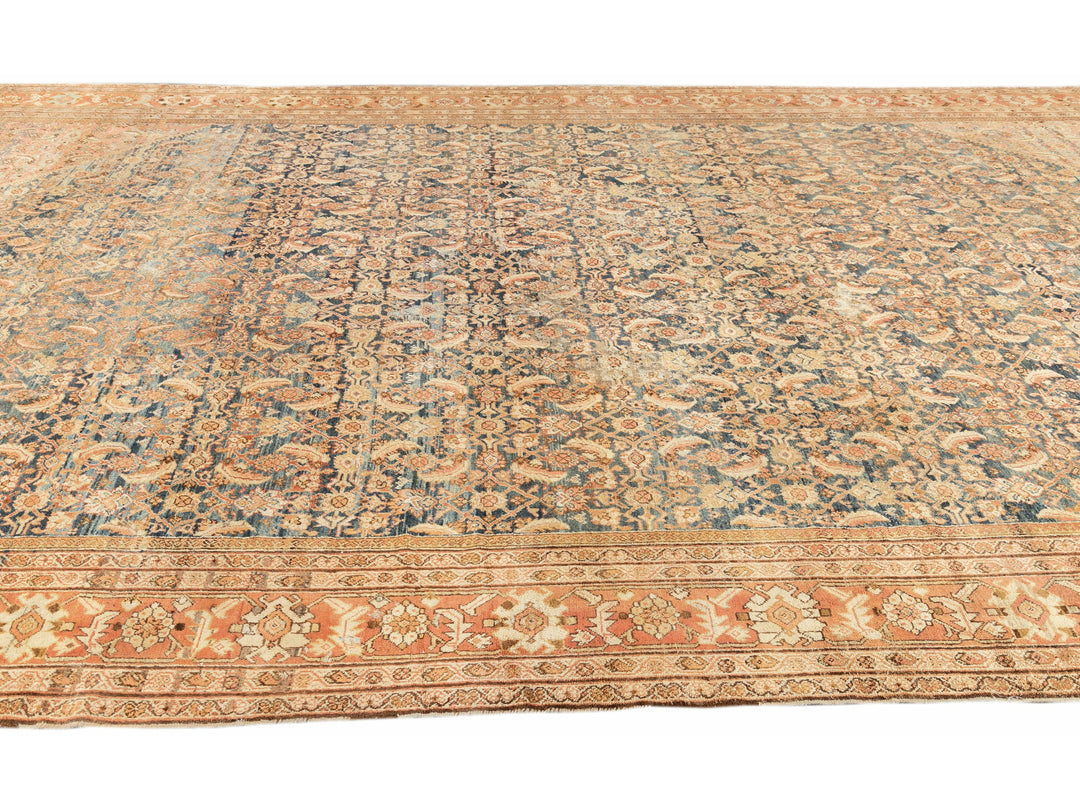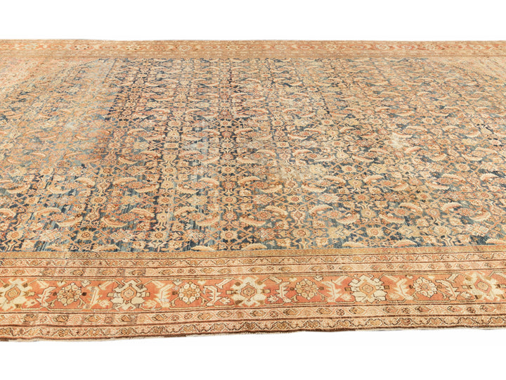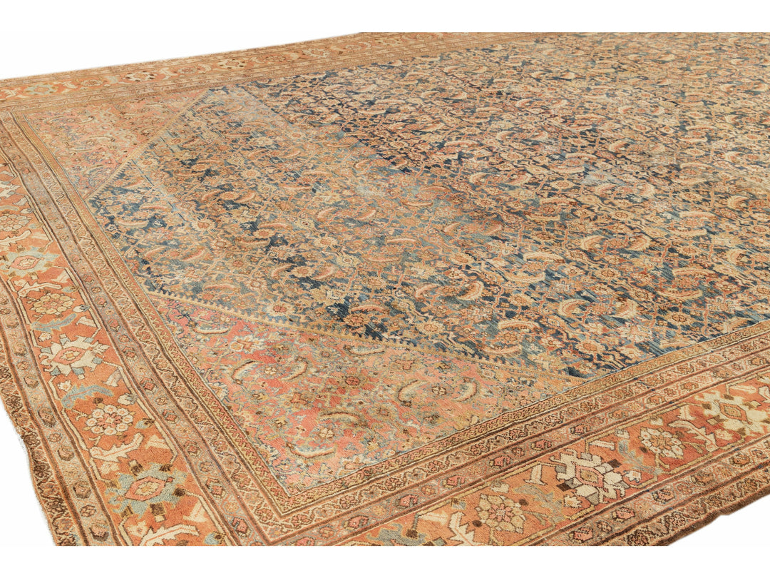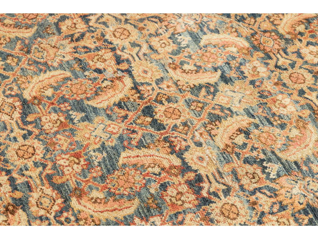 Beautiful hand-knotted antique Mahal wool rug with the blue field. This Persian rug has an orange-peach frame and beige and brown accents featuring an allover floral pattern design.