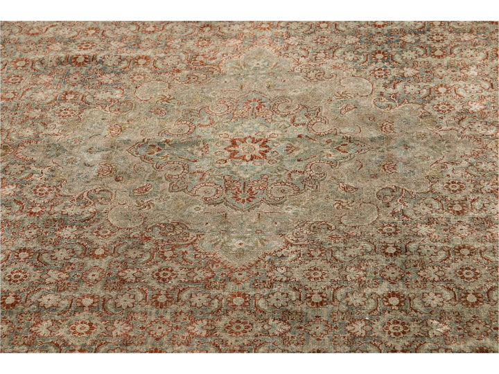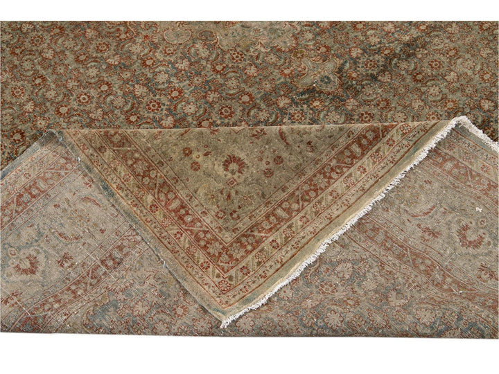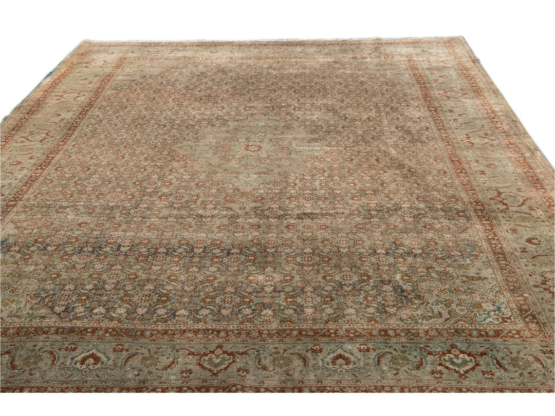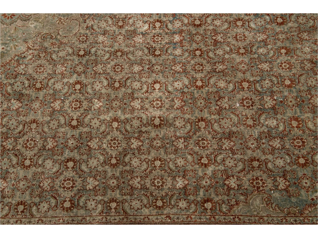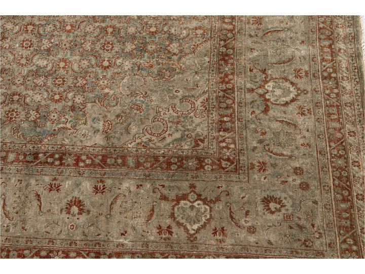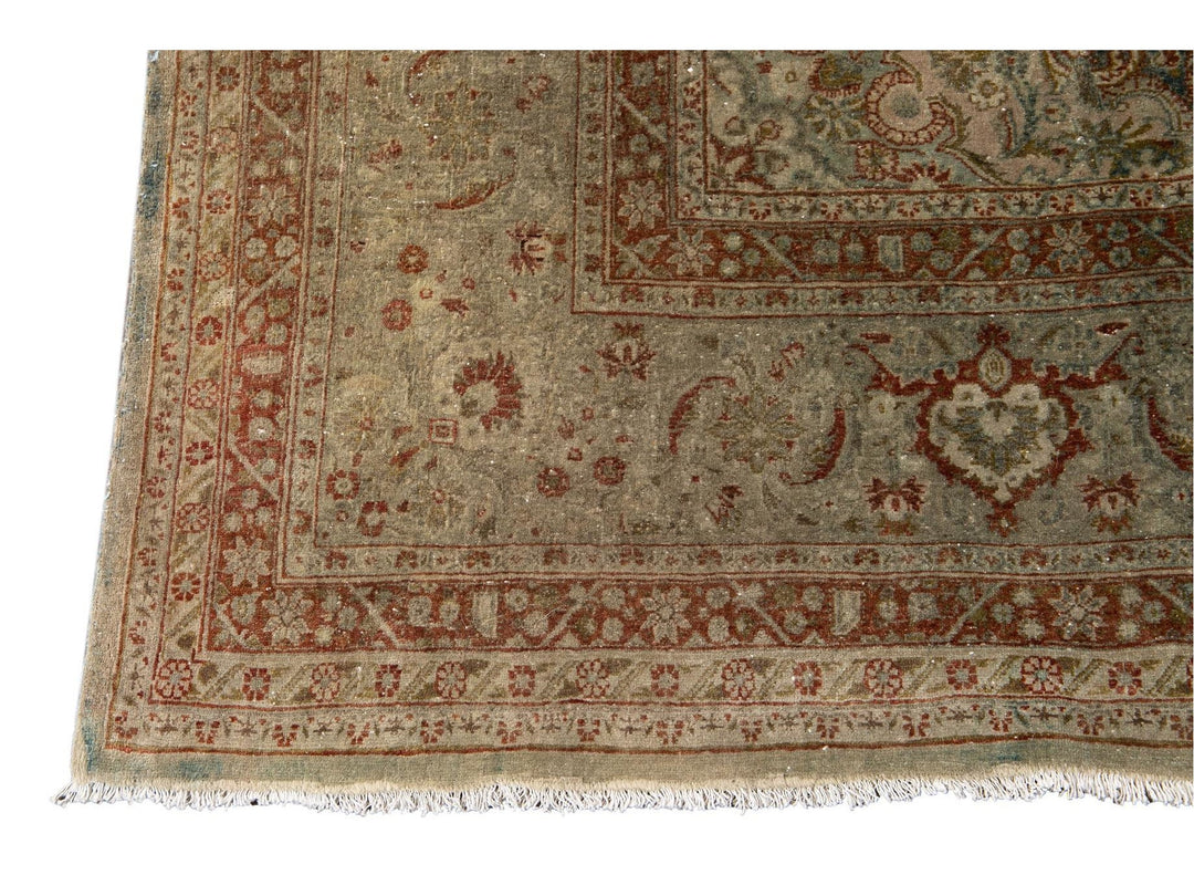 Beautiful Antique Persian Tabriz rug, hand knotted wool with a pale green field, rust and tan accents in an all-over Classic motif.