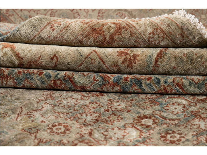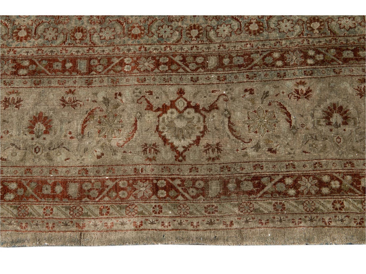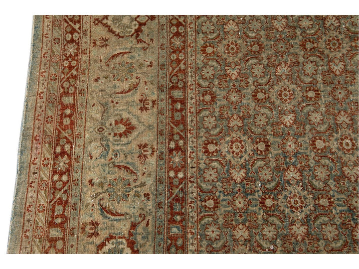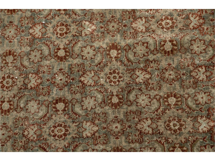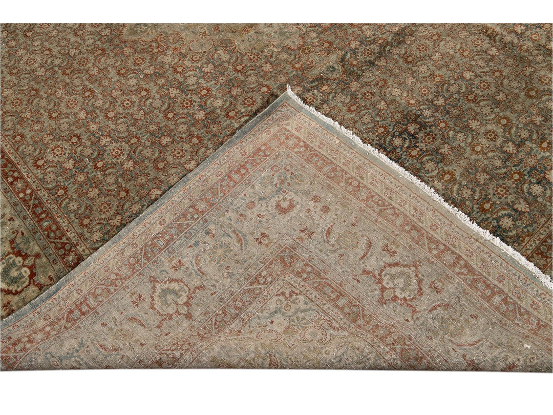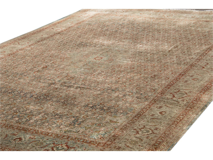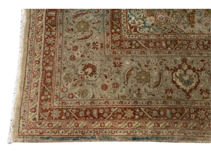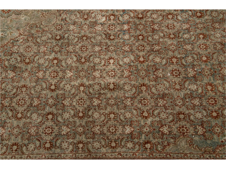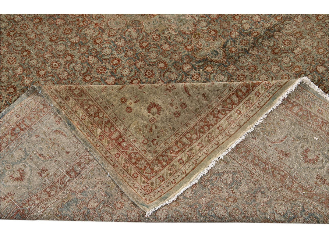 Beautiful Antique Persian Tabriz rug, hand knotted wool with a pale green field, rust and tan accents in an all-over Classic motif.