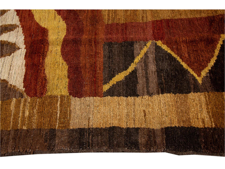 Beautiful vintage Art Deco style wool rug with a brownfield, and multi-color accents in an all-over geometric design.