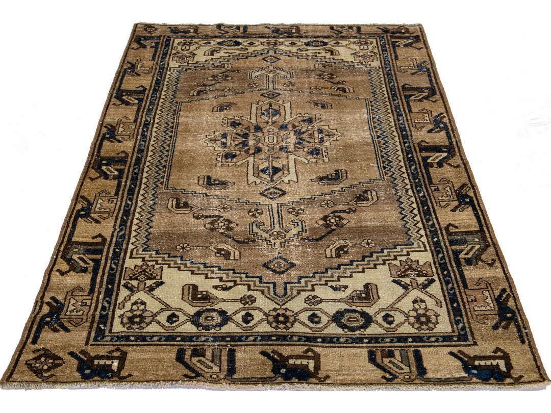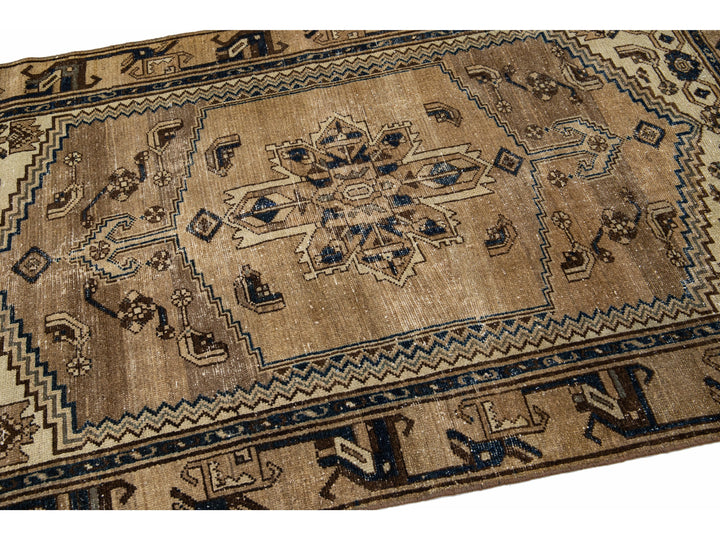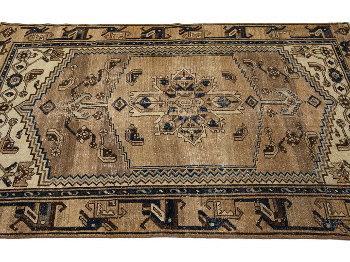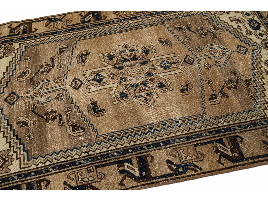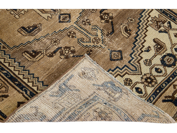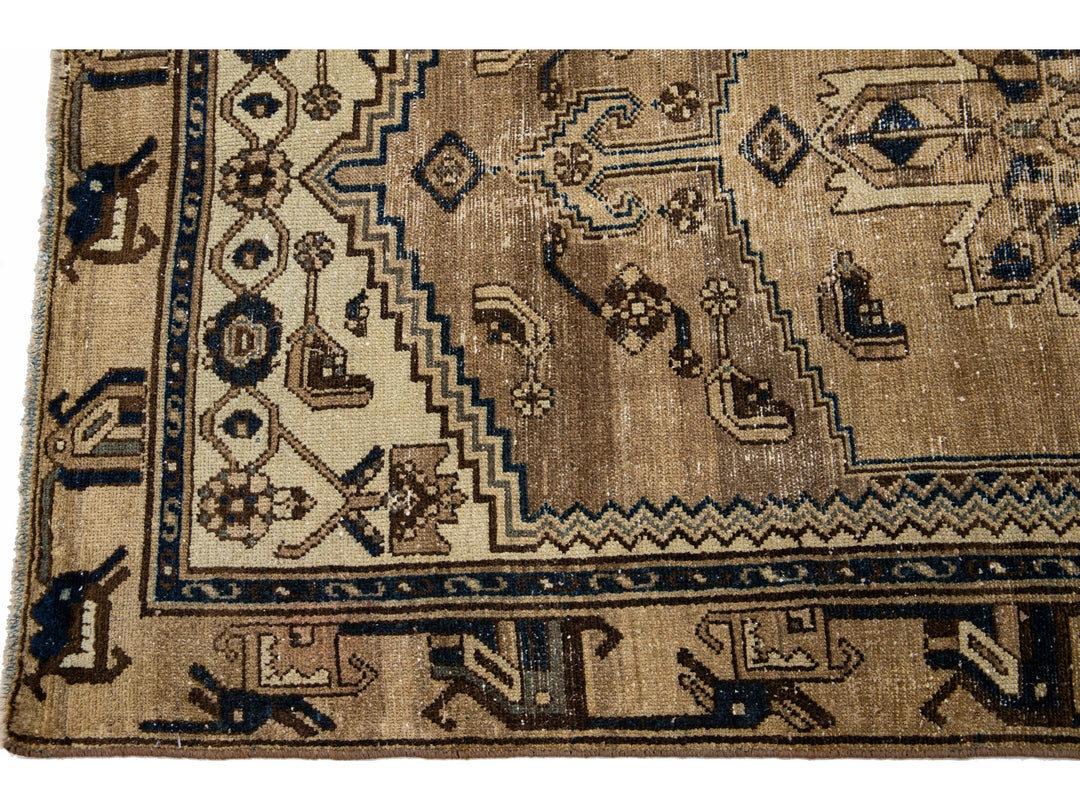 Beautiful Vintage Distressed hand-knotted wool rug with a brown field. This Persian rug has black and beige accents in an all-over geometric medallion design.