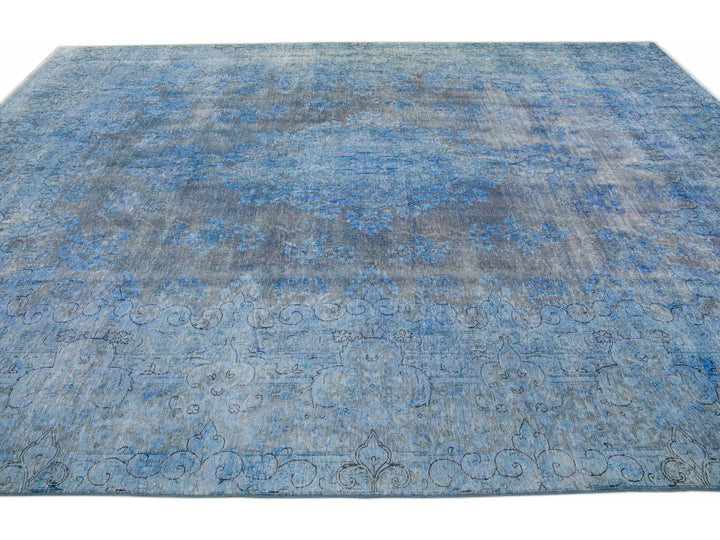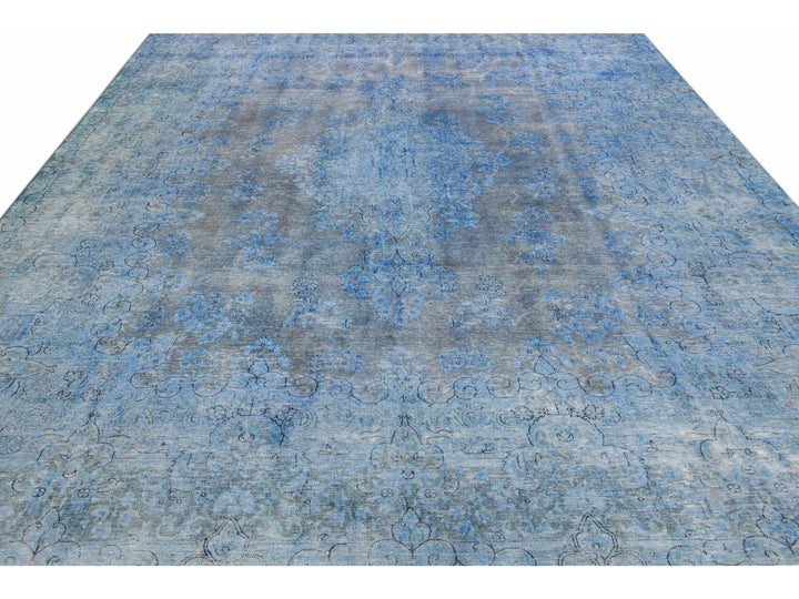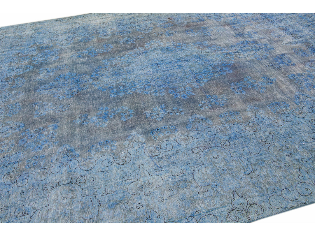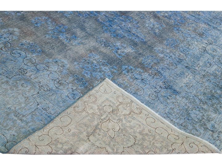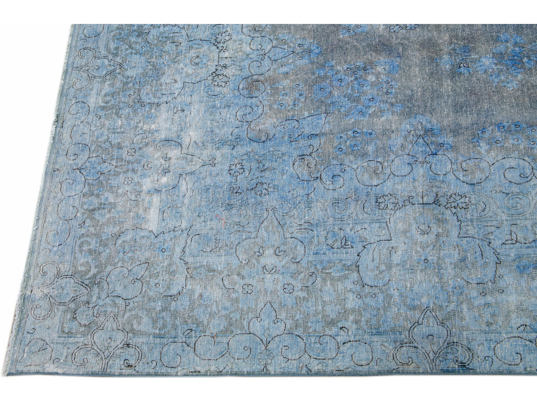 Beautiful Vintage overdyed hand-knotted wool rug with a blue field. This persian rug has gray accents in an all-over medallion floral design.
