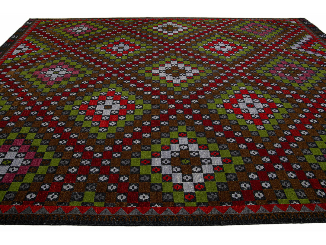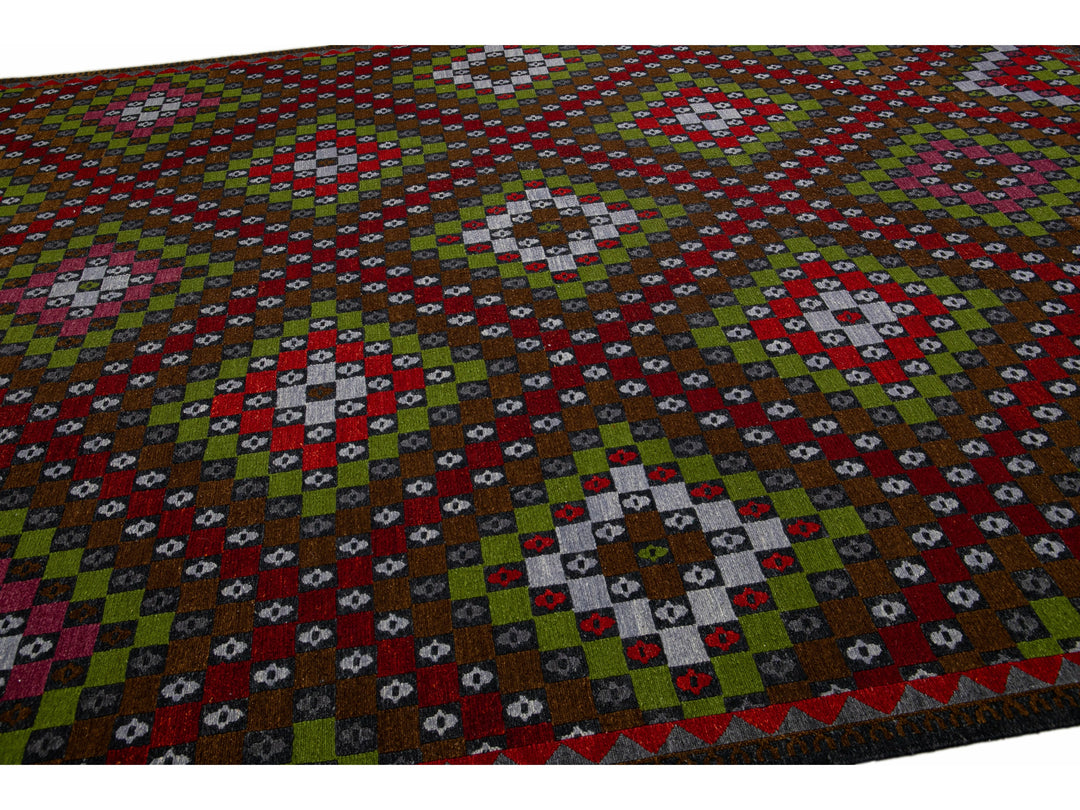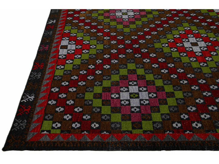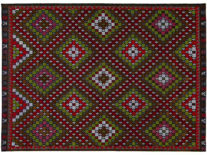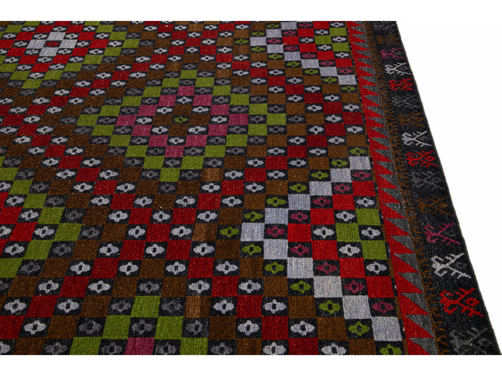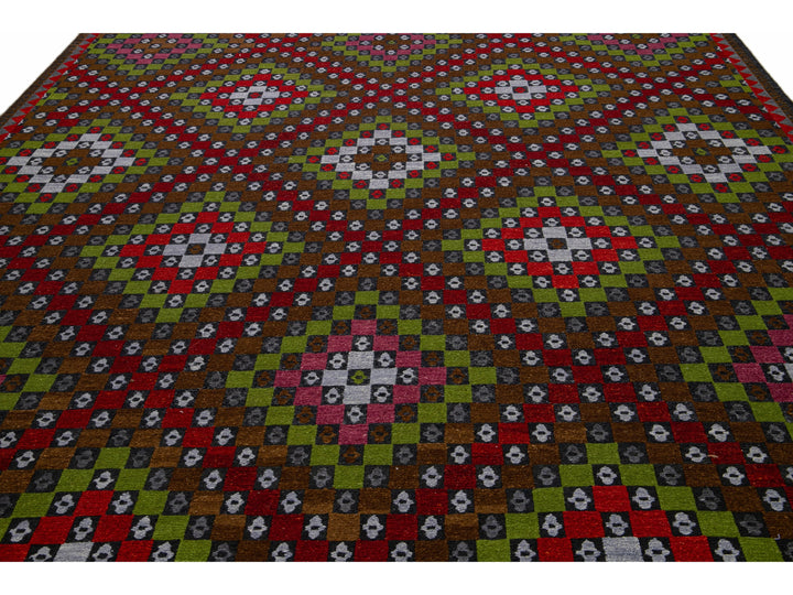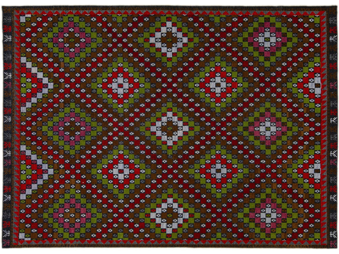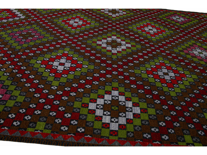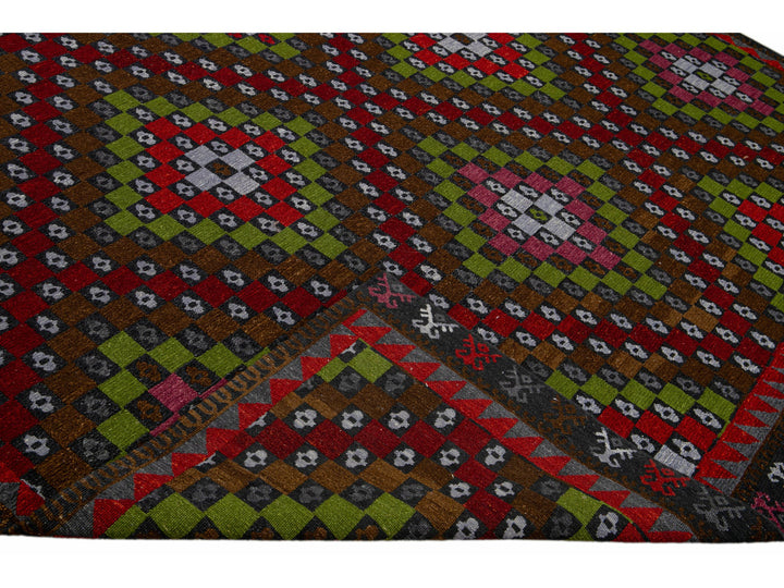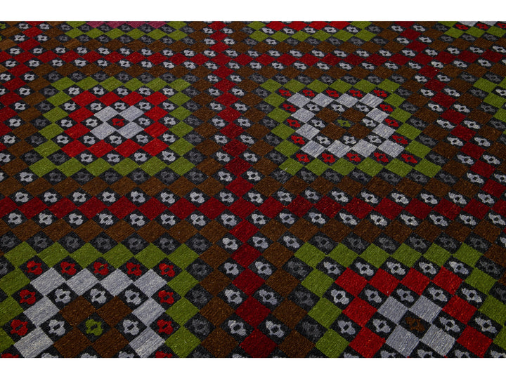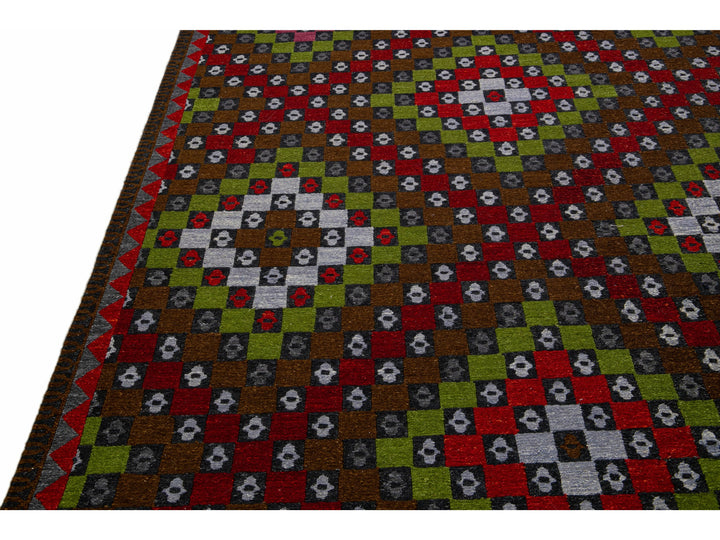 Beautiful Modern Soumak hand-knotted wool rug with a brown field. This piece has red, green, pink, and white accents in a gorgeous all-over geometric design.