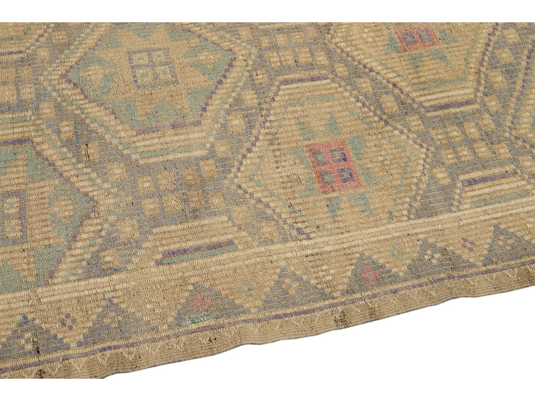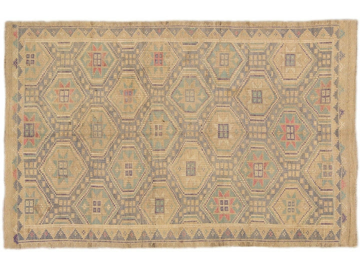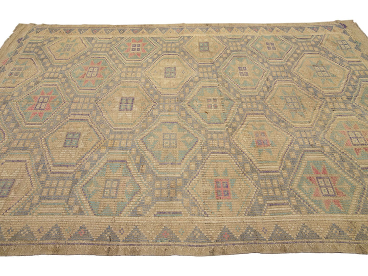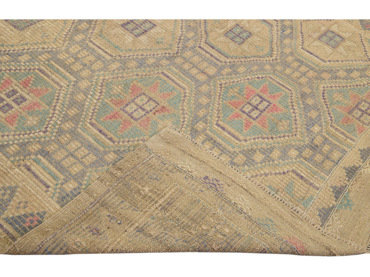 Vintage Soumak Handmade Geometric Designed Tan Wool Rug