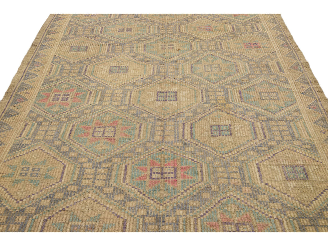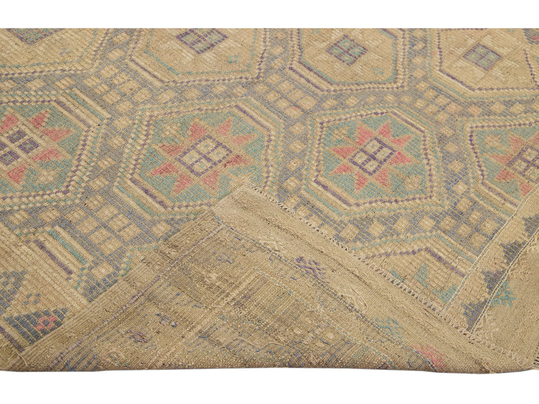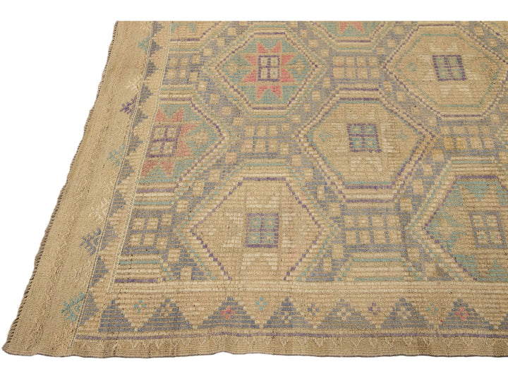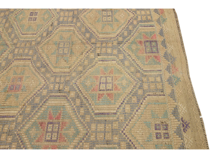Beautiful vintage Soumak hand-knotted wool rug with a tan field. This piece has purple, blue, and pink accents in a gorgeous all-over geometric medallion motif design with tan fringes.