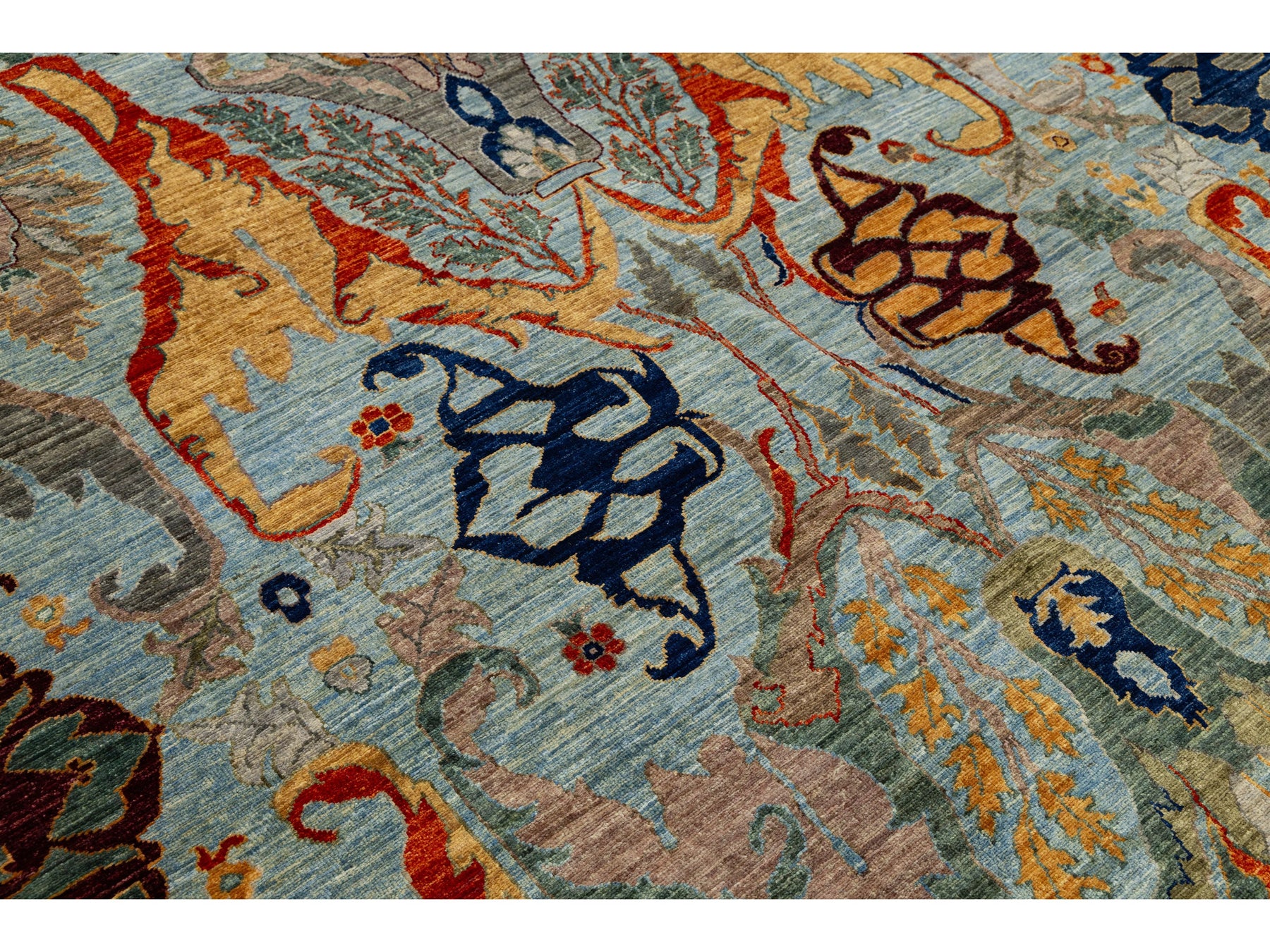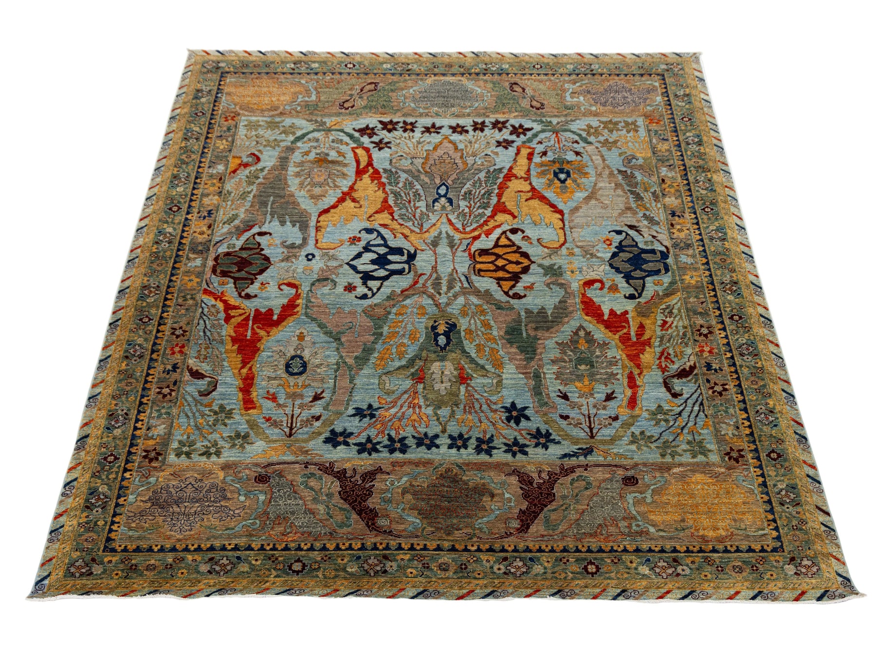 A contemporary take on Persian Bidjar tradition, this wool rug features a central medallion and mirrored floral designs in sapphire, ruby, and emerald tones. Its dense weave and mythical accents evoke timeless craftsmanship, ideal for collectors and interiors seeking bold elegance and lasting quality. This rug measures: 9' x 11'9".