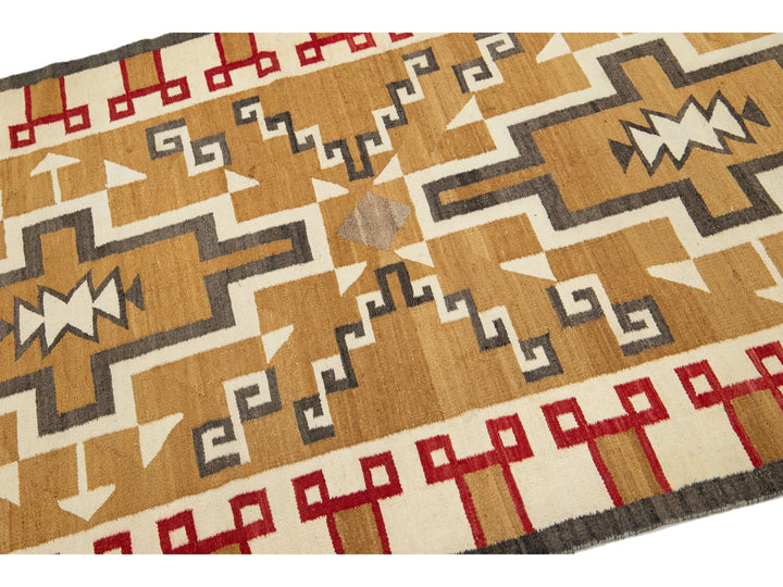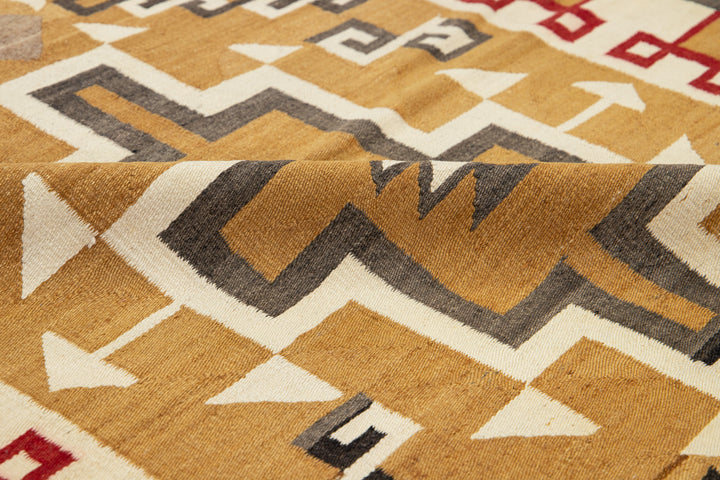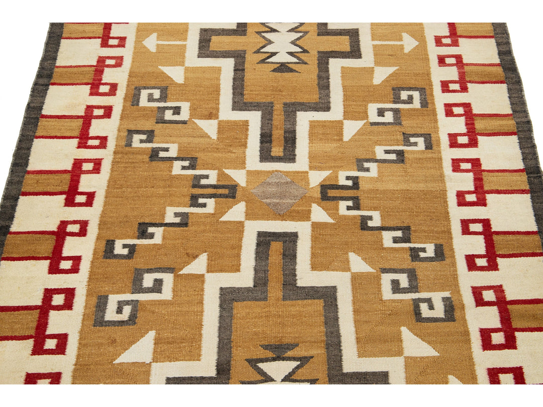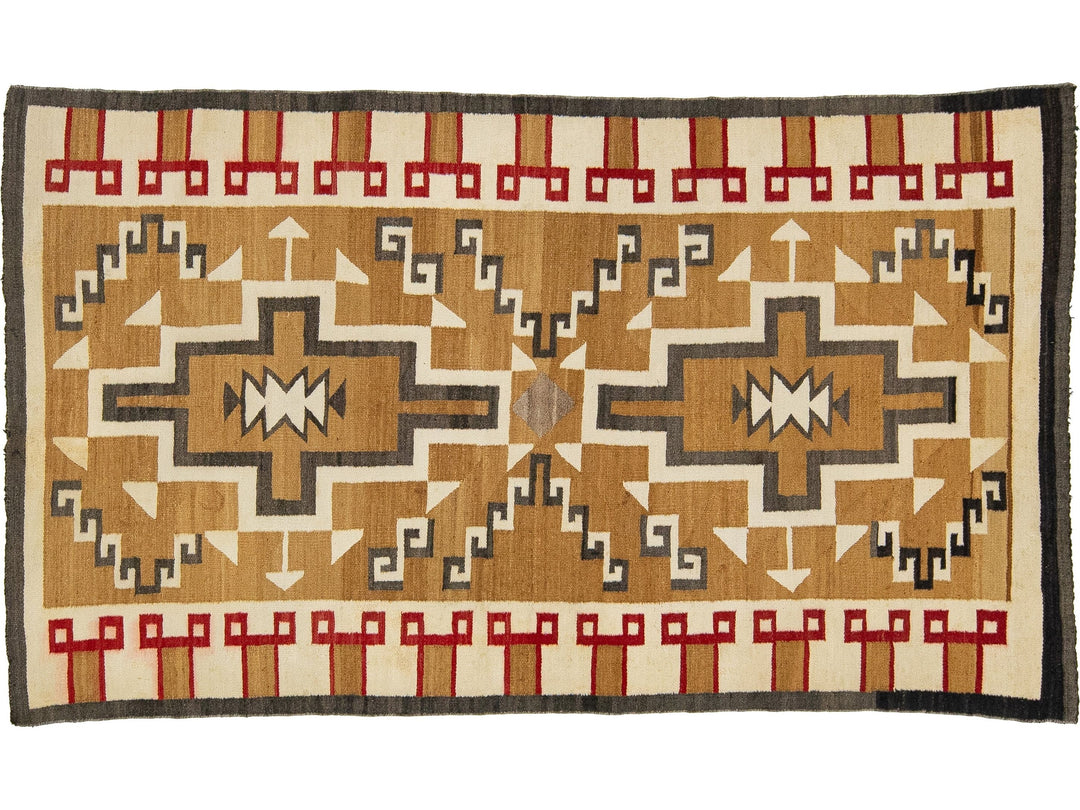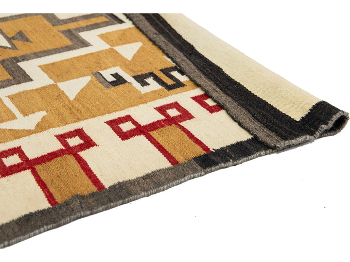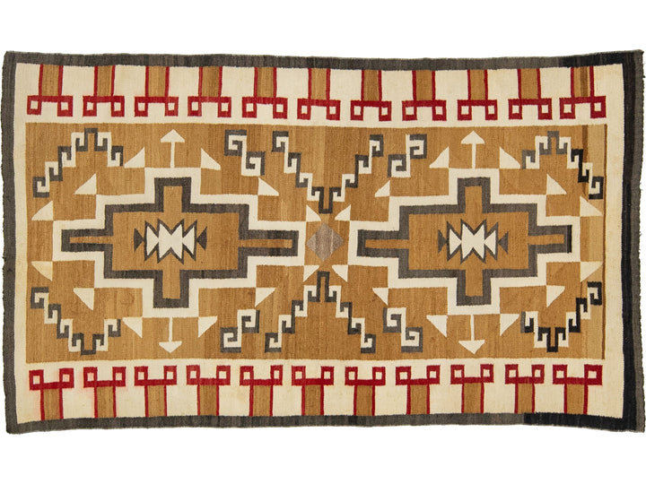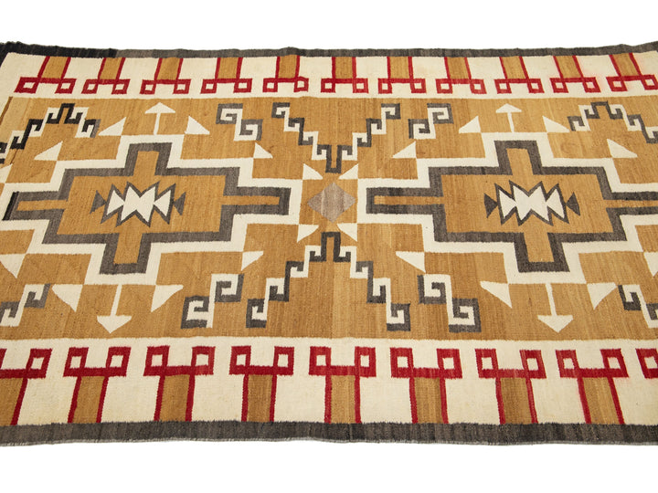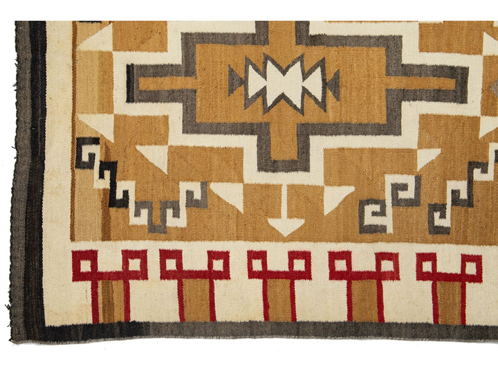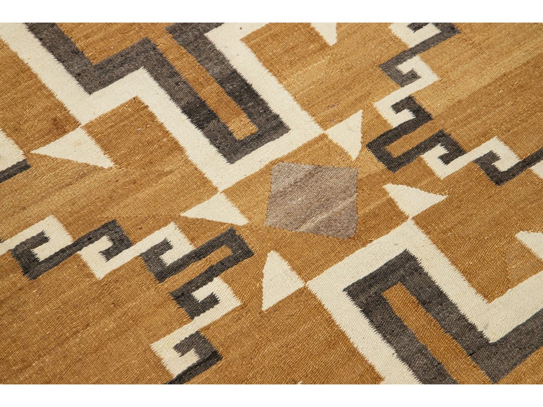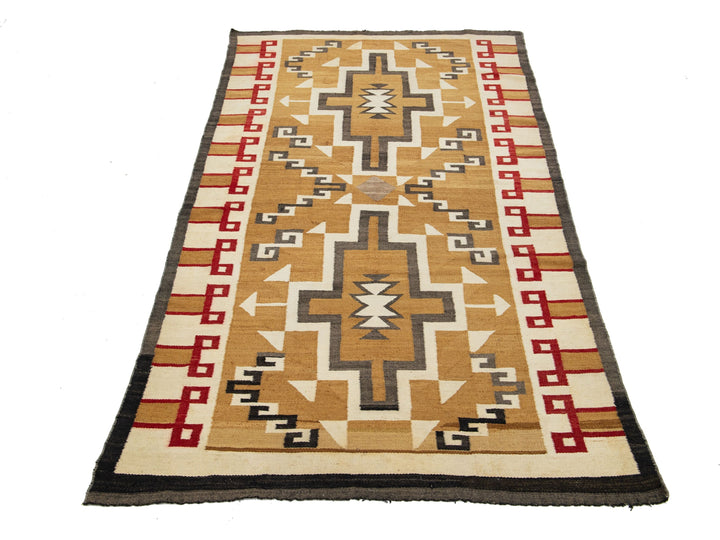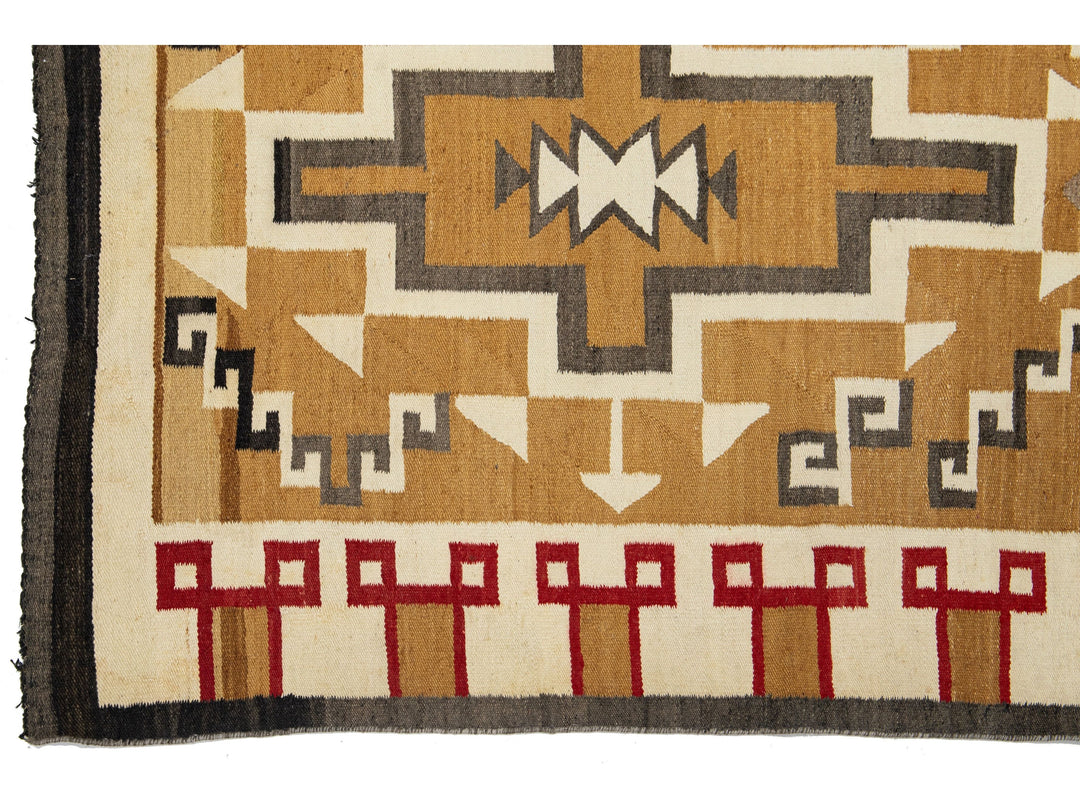 This Antique Navajo Native American Indian tribal weaving rug showcases an intricate tribal design in brown, beige, and red hues with a goldenrod field. This rug measures 3'10" x 6'8".