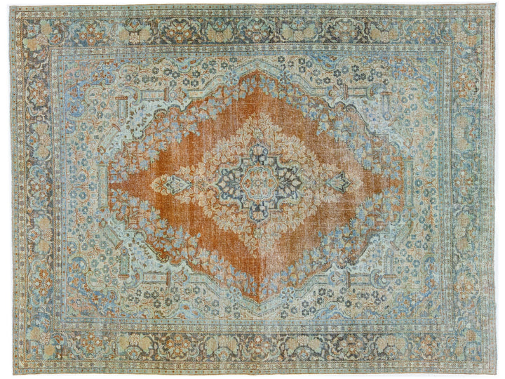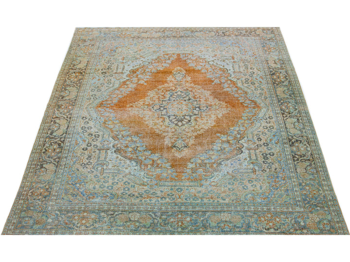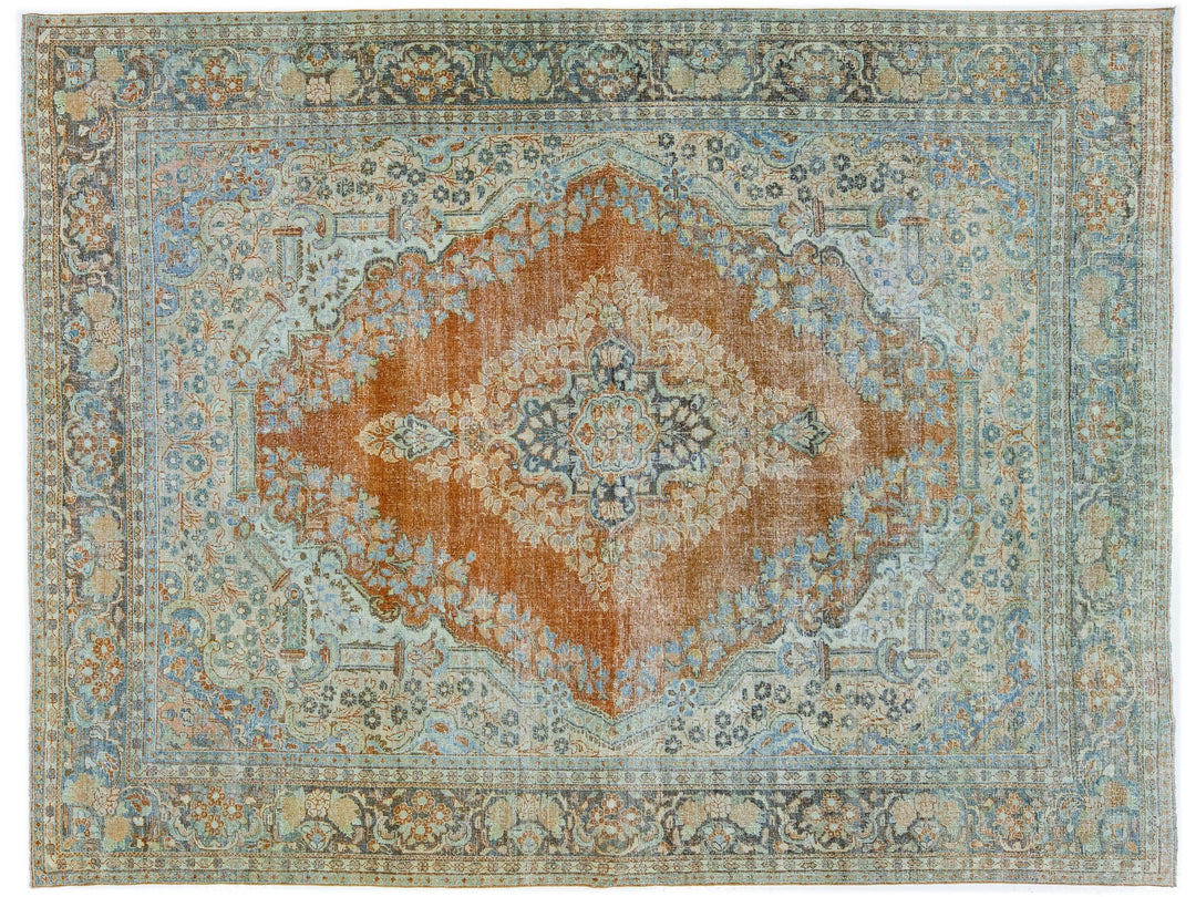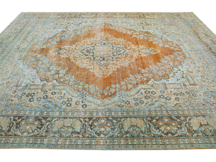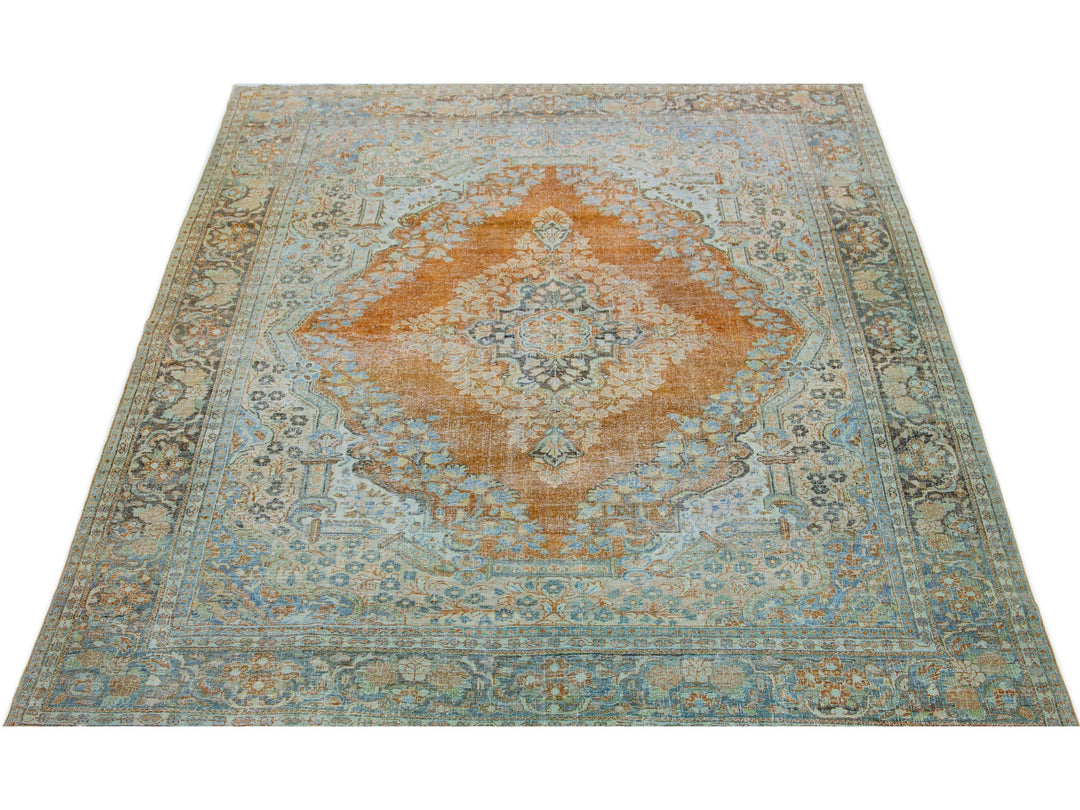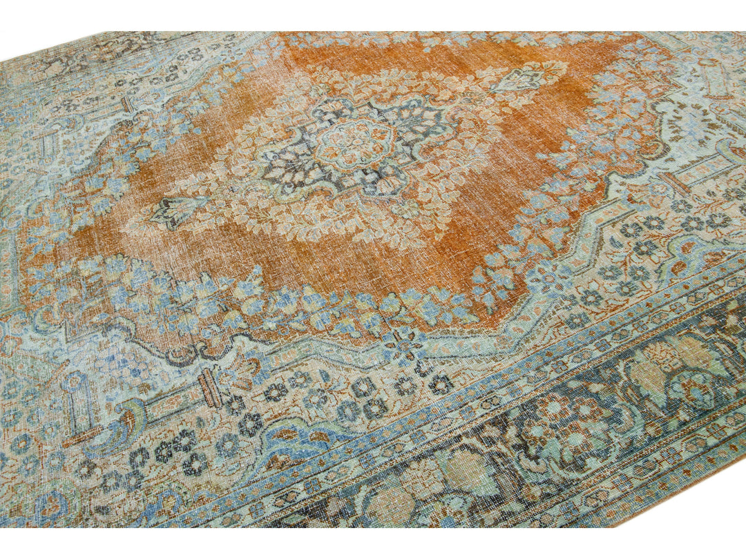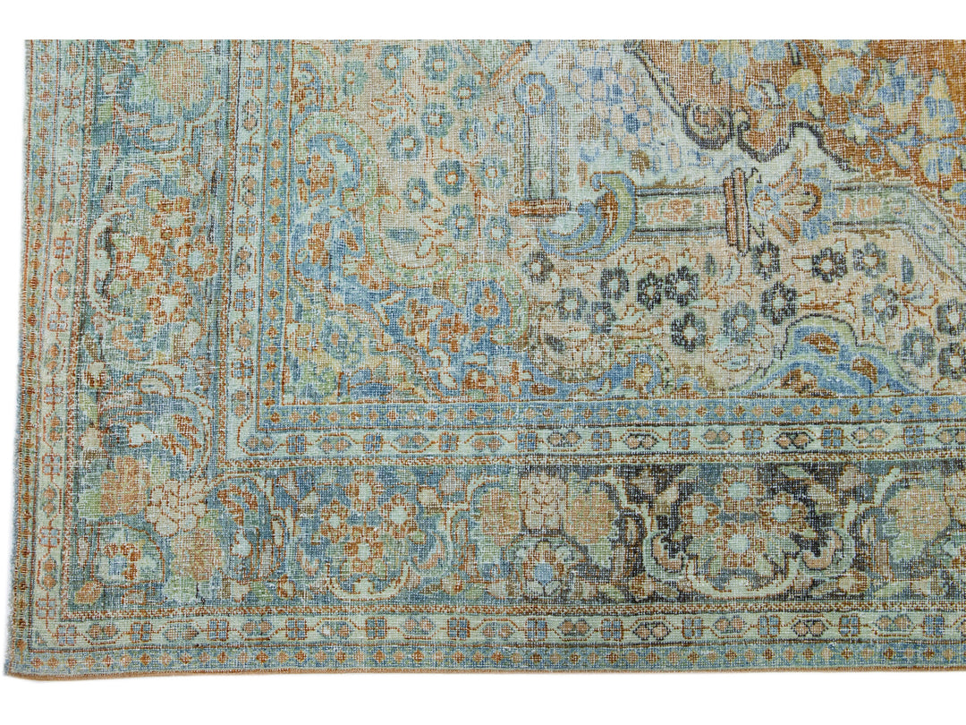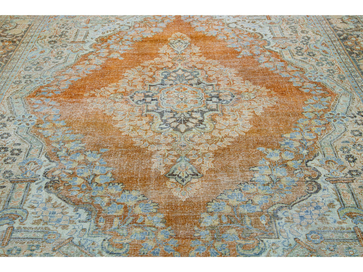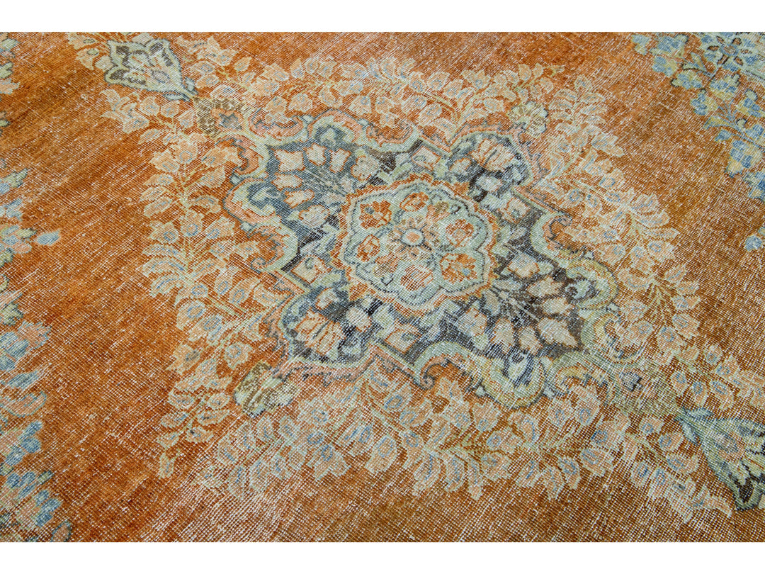 This antique wool rug from the 1920s showcases expert hand-knotted quality and boasts a medallion floral design. The primary color scheme of this rug is composed of orange and rust tones with complementary hues of blue, peach, and gray, resulting in a classic and timeless aesthetic.