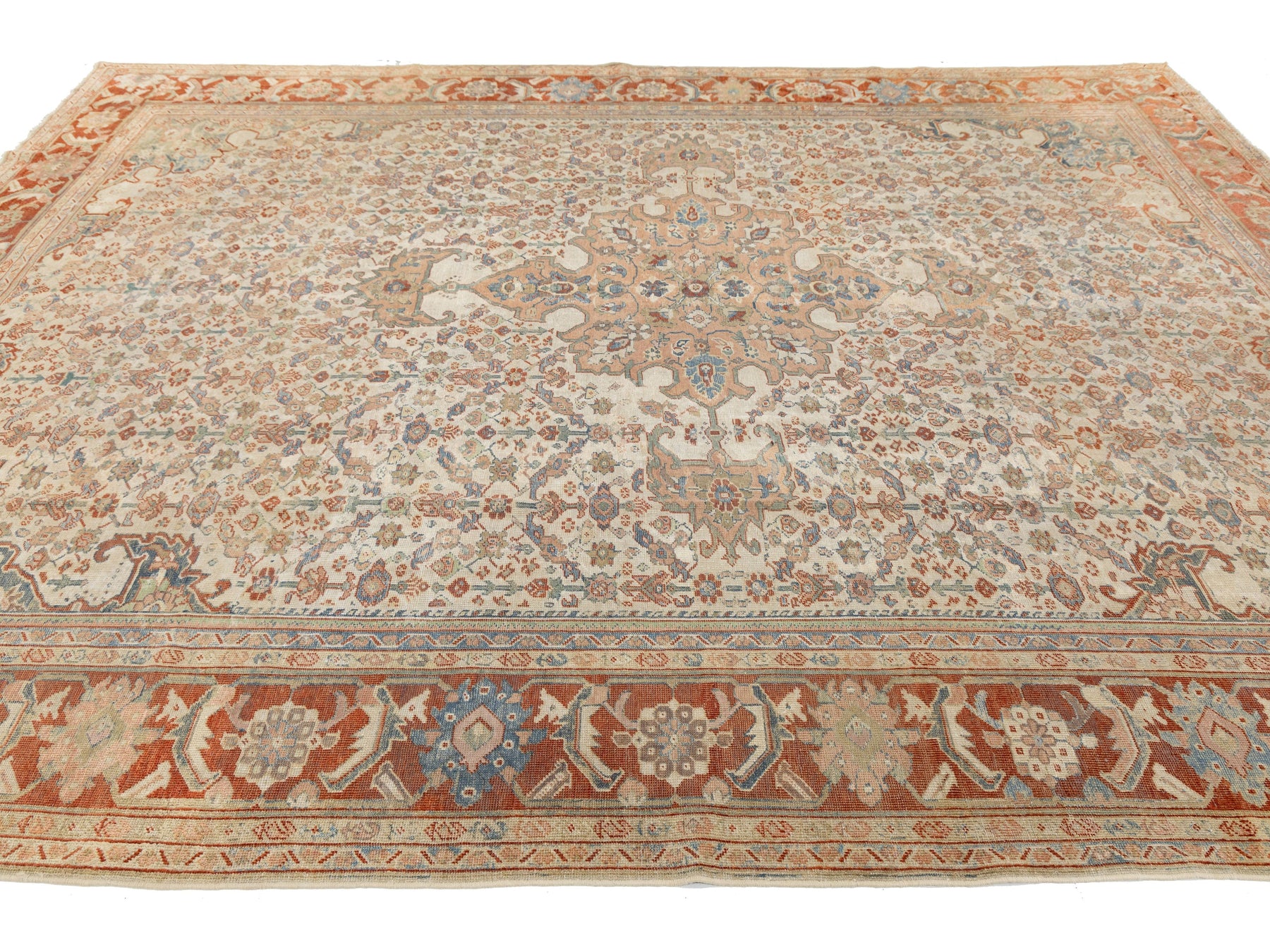 This exquisite antique Persian Mahal rug features a weathered patina that embodies "distressed luxury." Hand-knotted with high-quality wool, it showcases a classic central medallion surrounded by an intricate floral Herati pattern. The color palette has mellowed into soft tones of terracotta, indigo, and ivory, framed by a geometric border. Its low pile and soft handle make it ideal for grand living rooms, dining areas, or master suites, adding historical charm to both traditional and modern minimalist interiors. This rug measures 9'6" x 12'4".