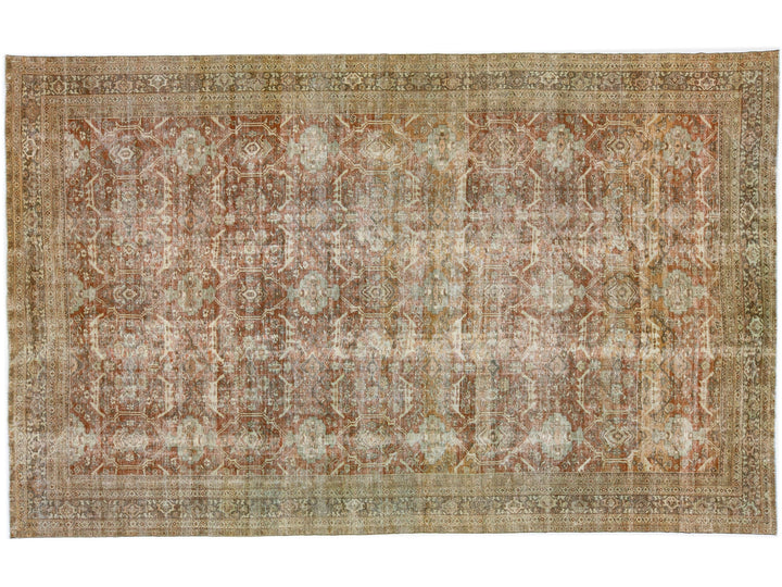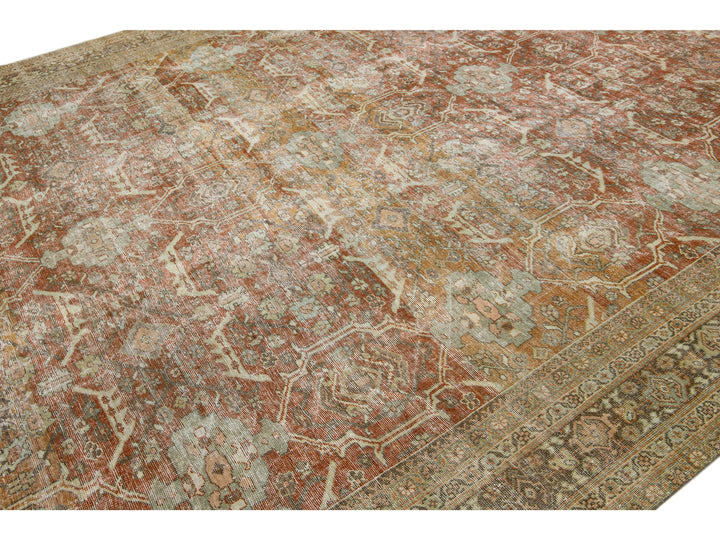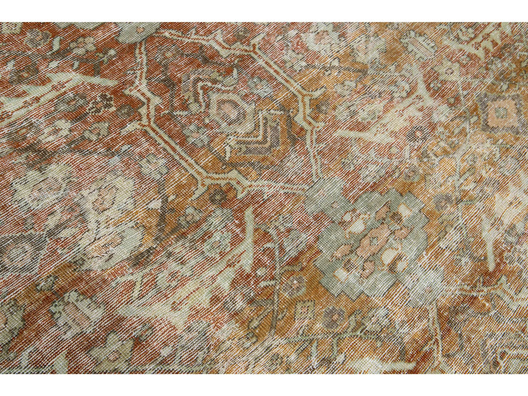 The 1920s vintage wool rug with hand-knotted craftsmanship features an All-over floral motif. Its primary color scheme consists of orange/rust complimented with blue, peach, and gray hues for a traditional appeal.