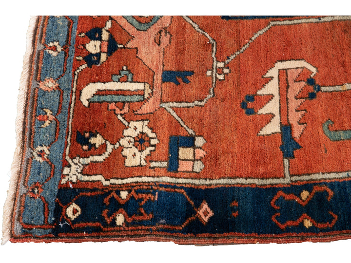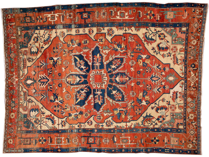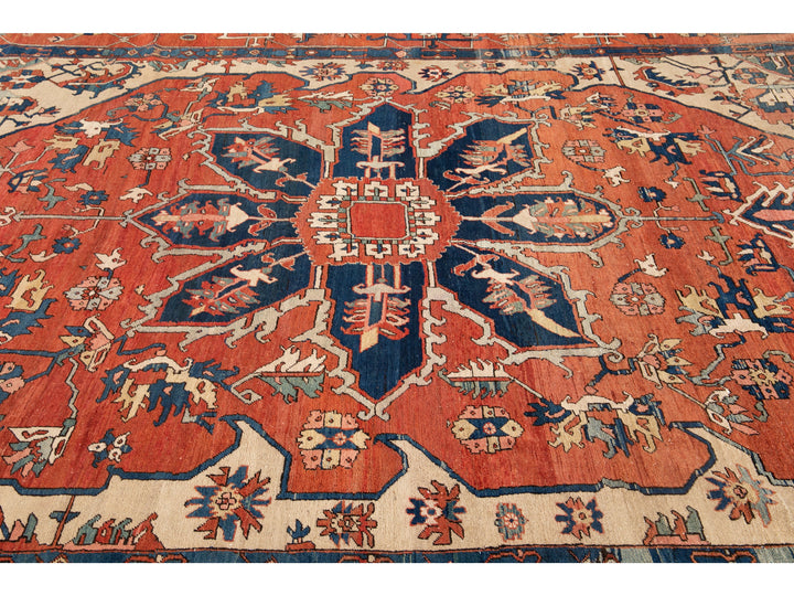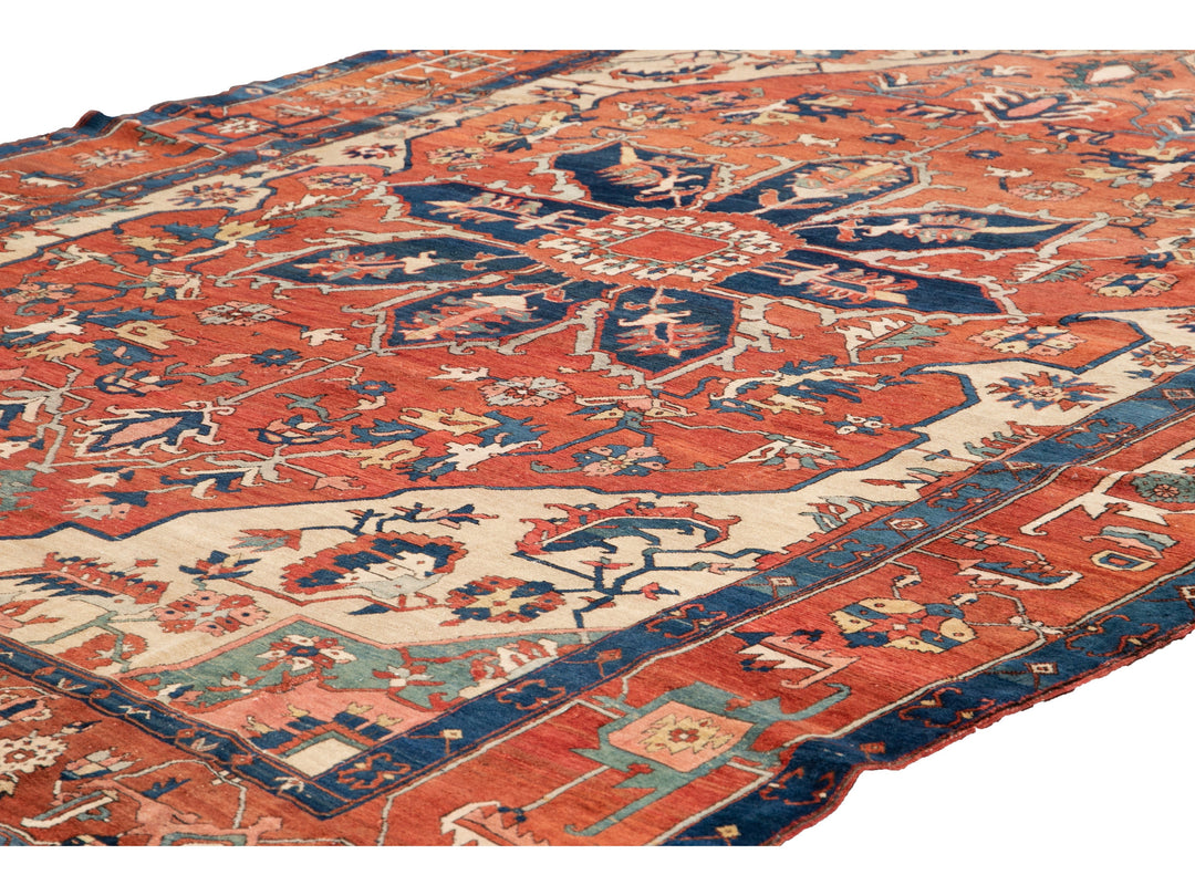 Beautiful antique Persian Serapi rug, hand knotted wool with a rust orange field, blue and ivory accents in all-over center medallion design.