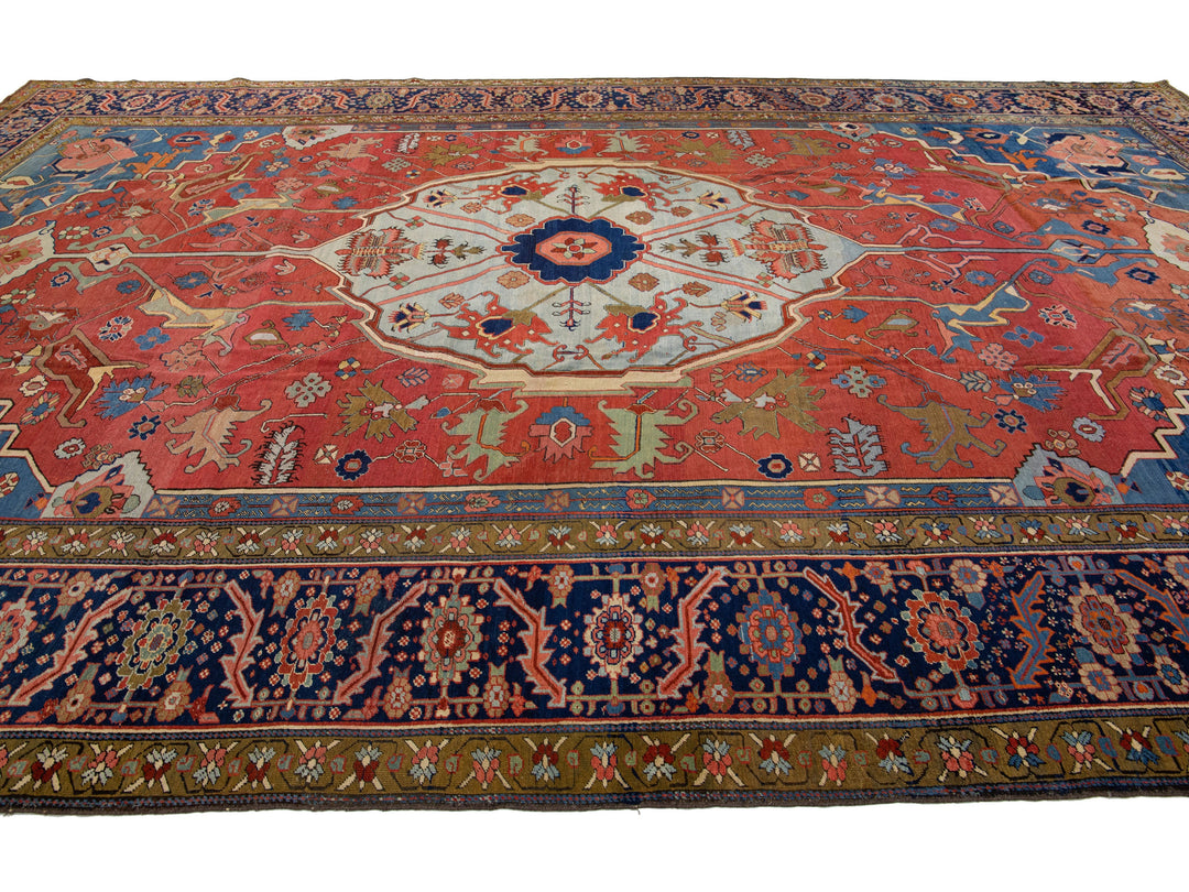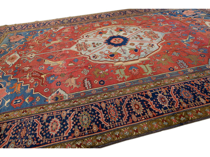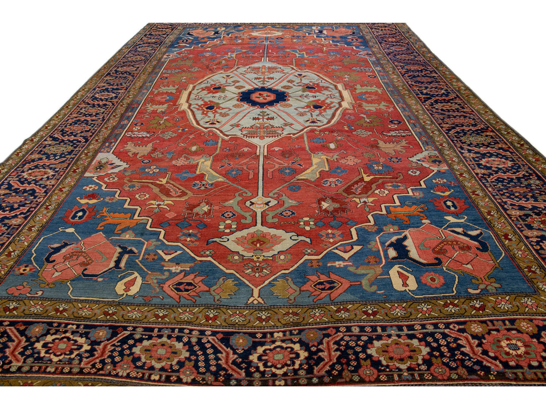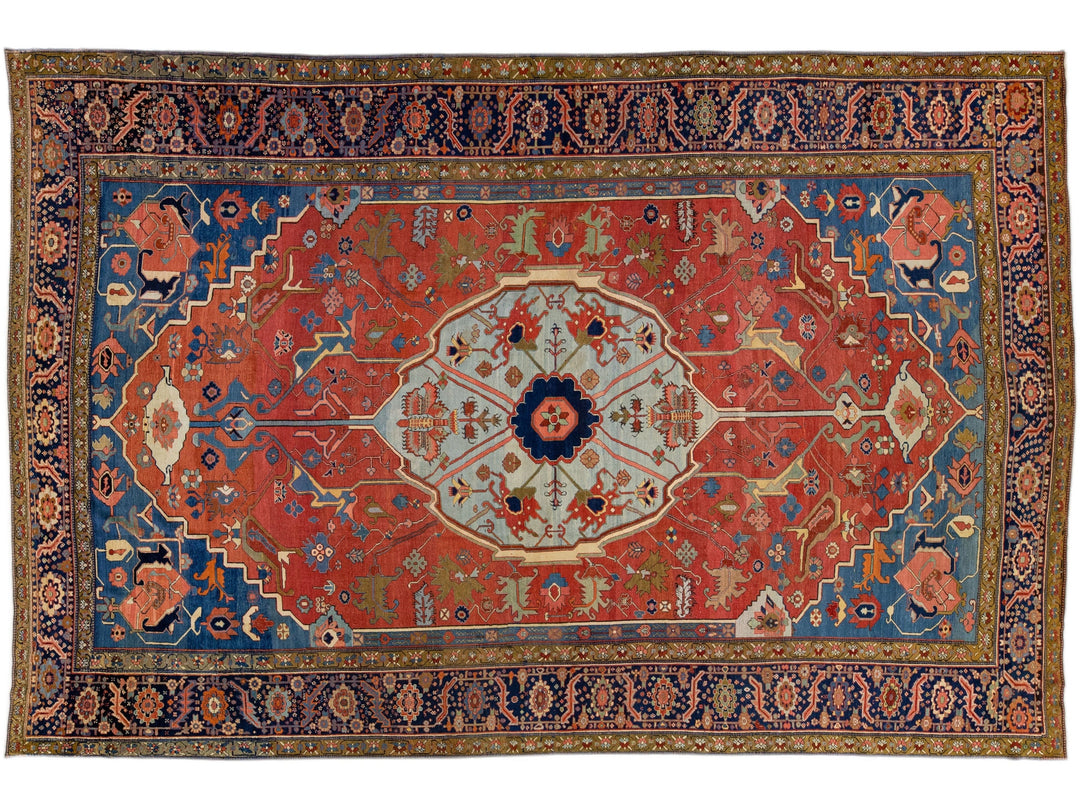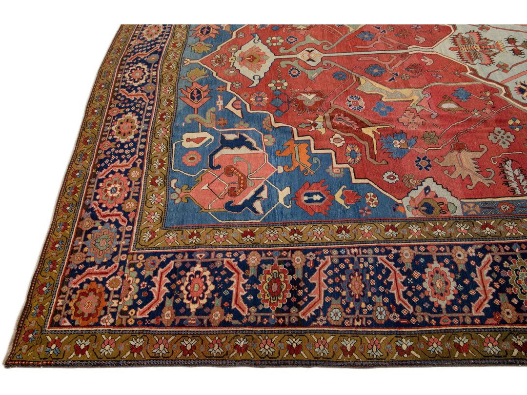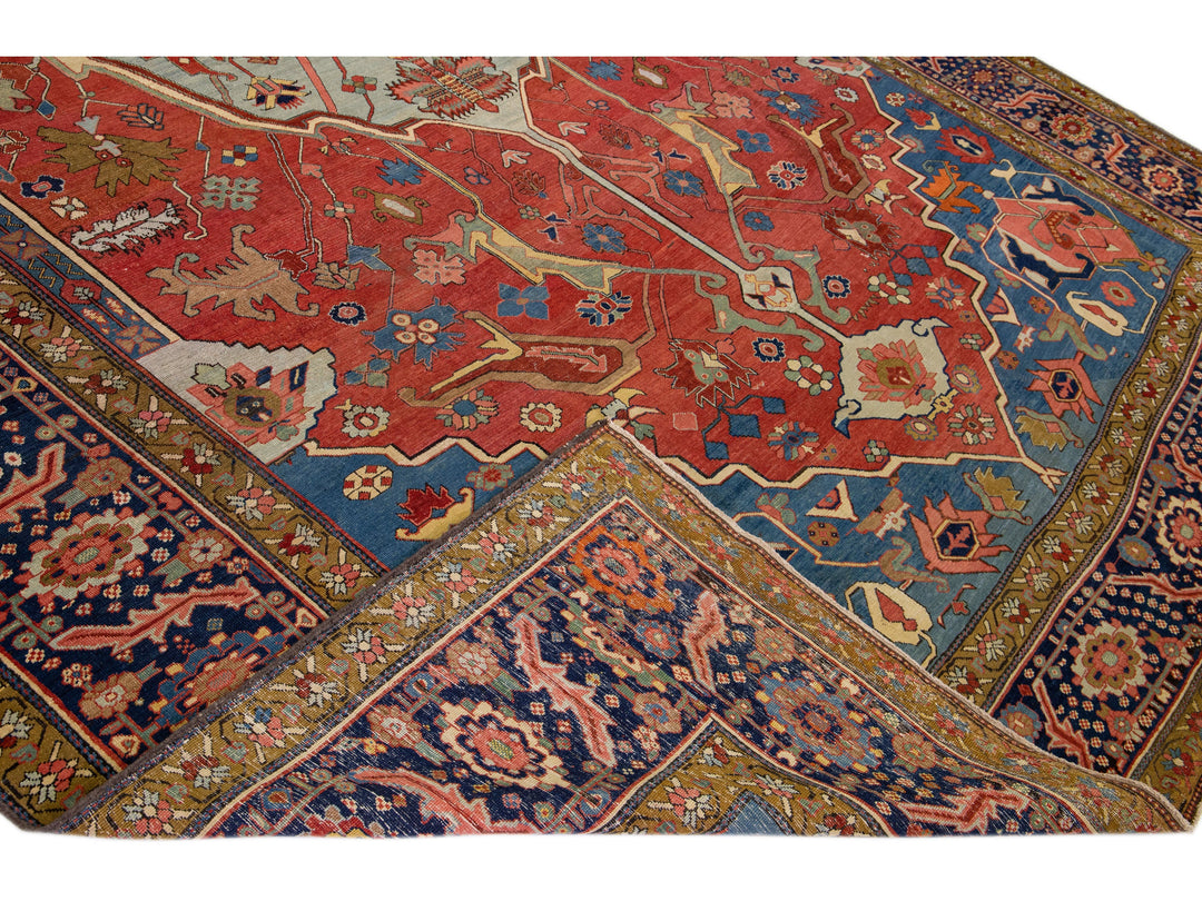 Antique Persian Serapi Red & Blue Handmade Wool Rug with Medallion Motif