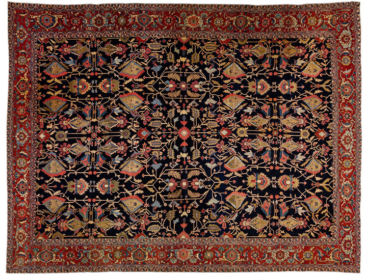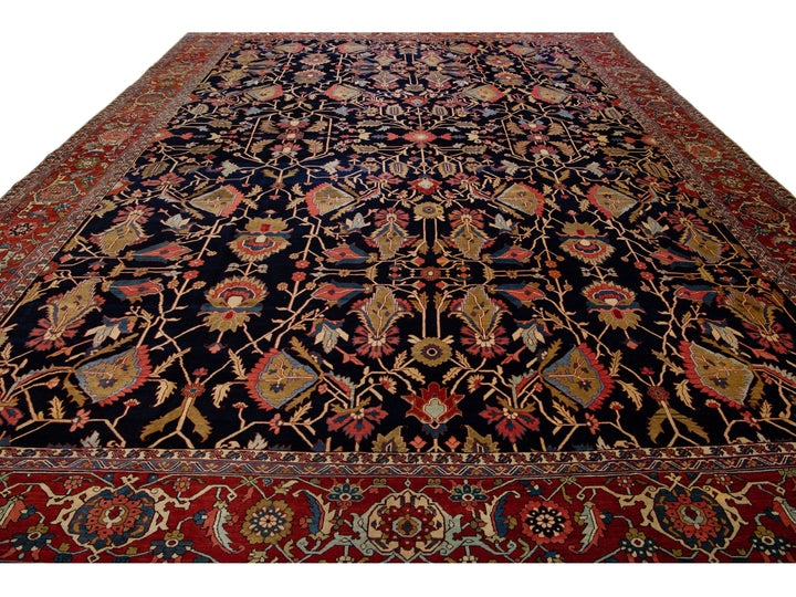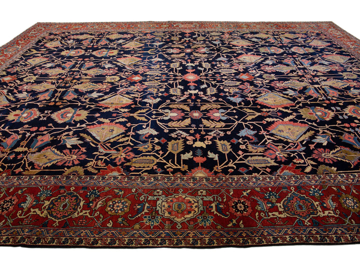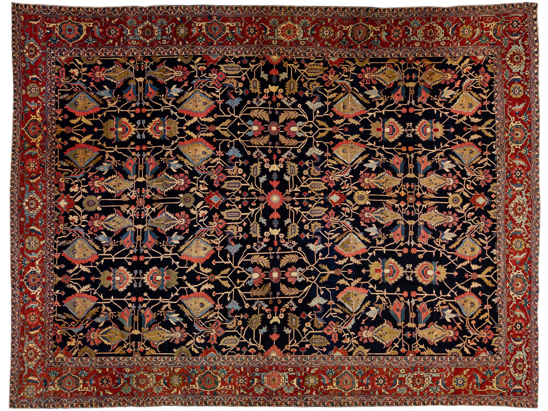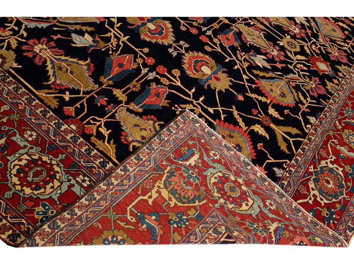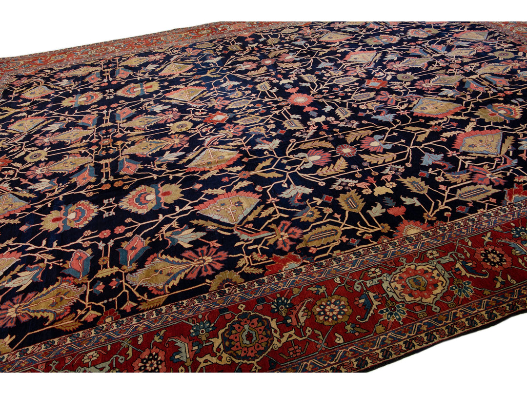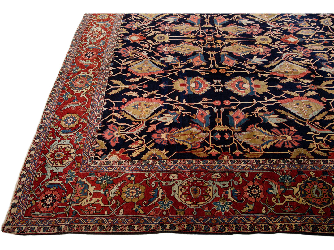 Beautiful Antique Serapi hand-knotted wool rug with a dark blue field. This Persian rug has a red frame and multi-color accents in a gorgeous all-over geometric floral design.