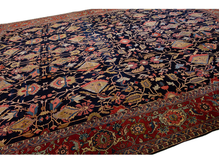 Dark Blue Antique Persian Serapi Handmade Allover Motif Wool Rug