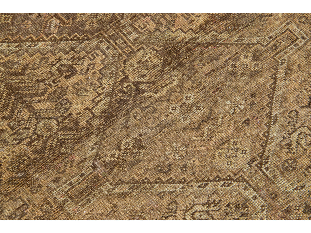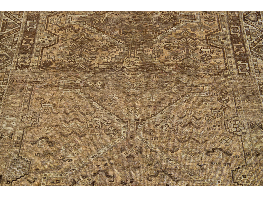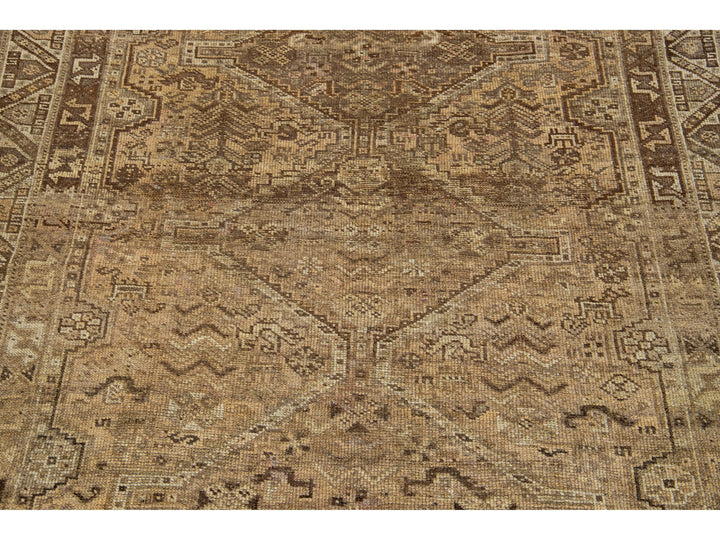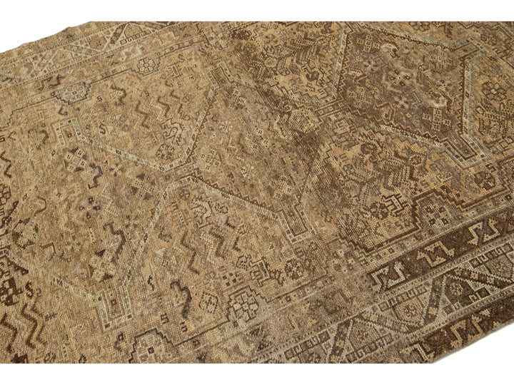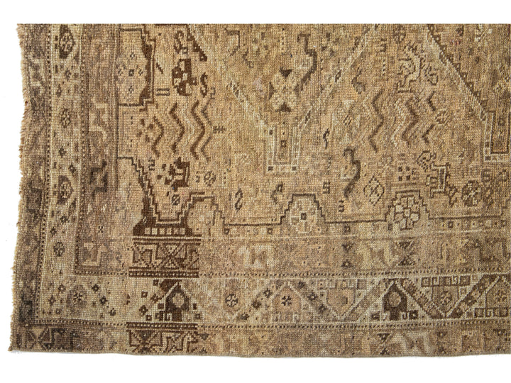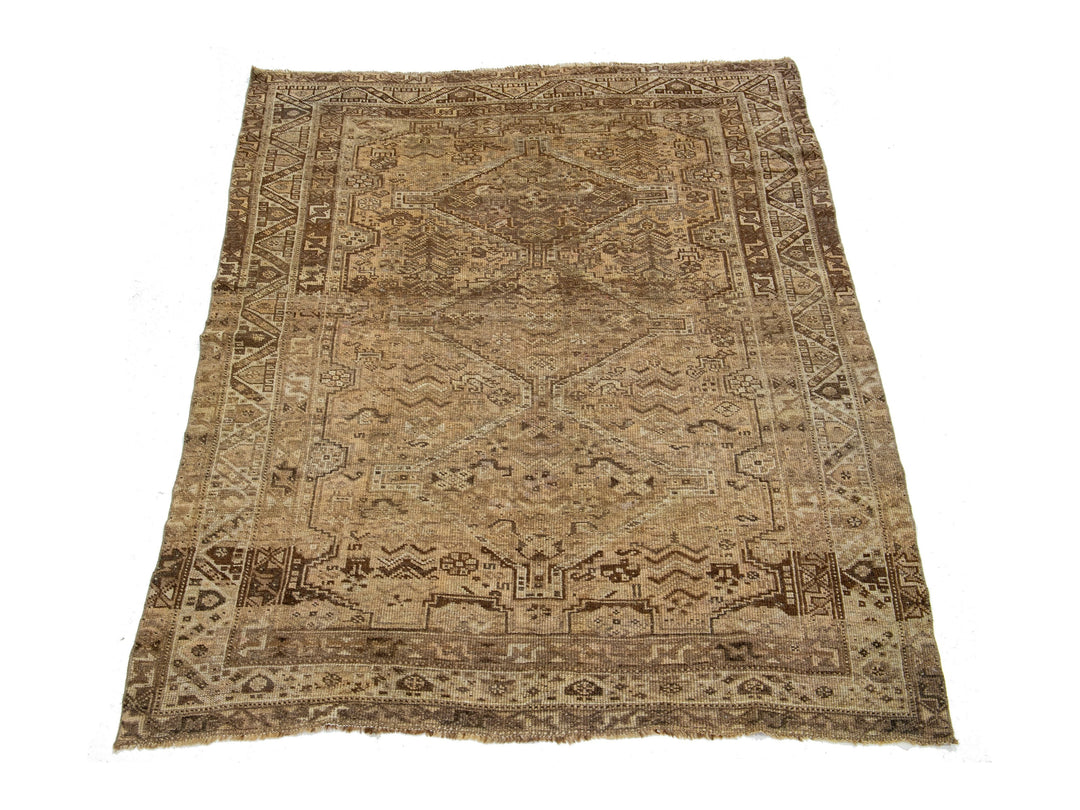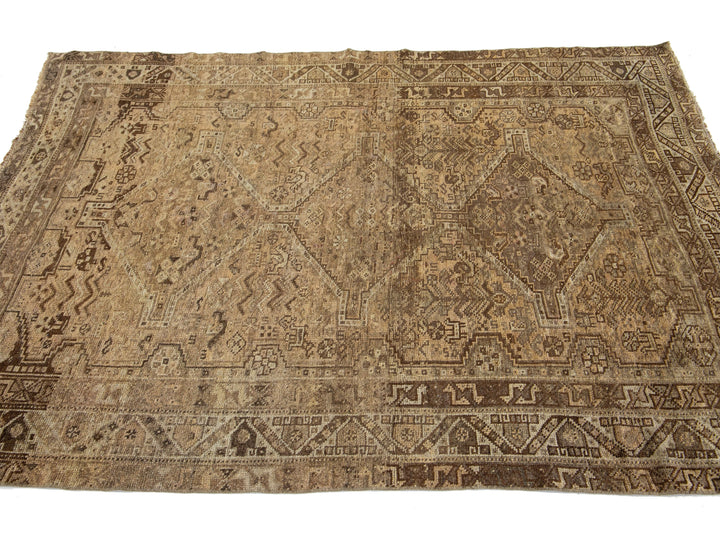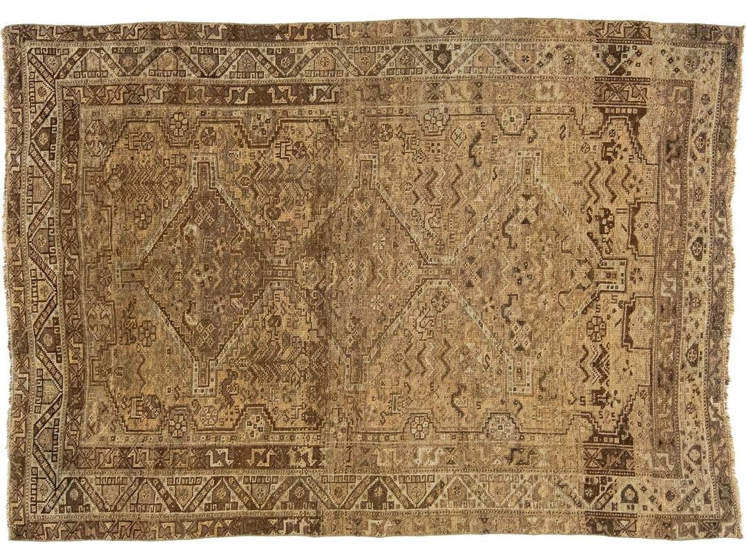 This Persian Shiraz wool rug showcases an exquisite traditional floral medallion design with striking beige and pink accents against a tan background. This rug measures 4'8" X 6'7".
