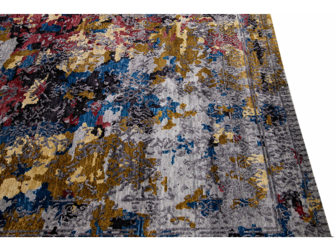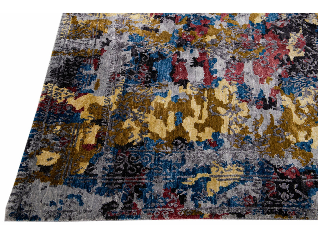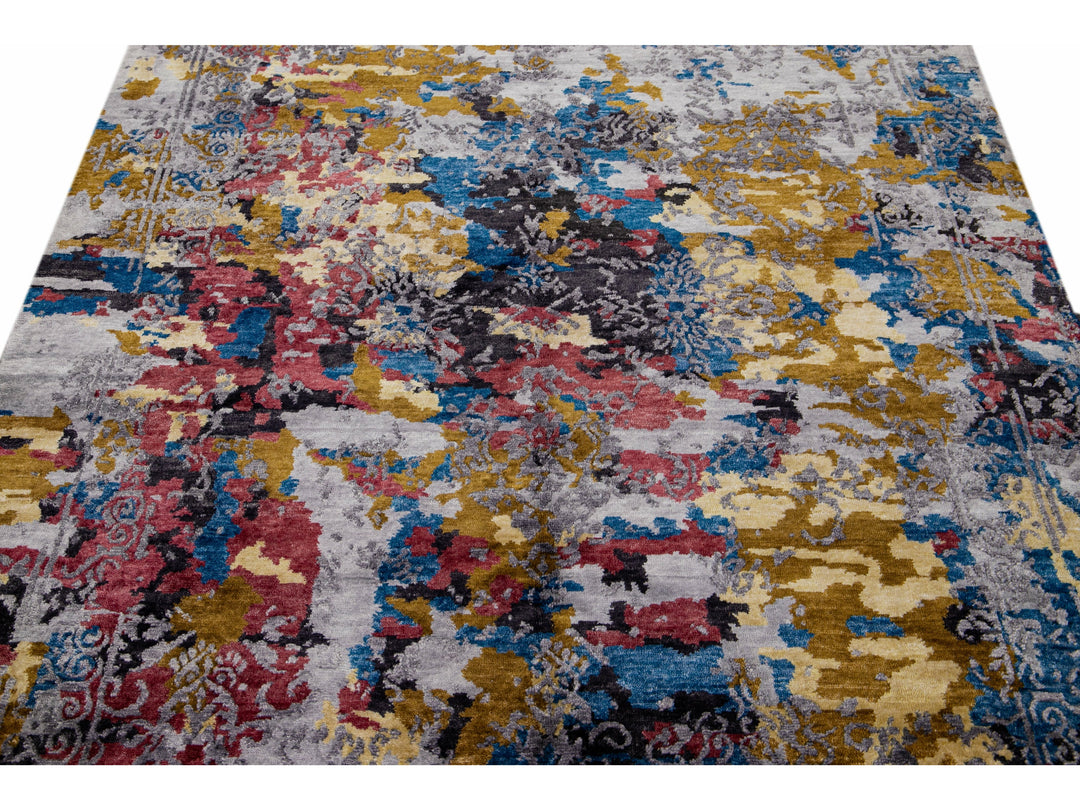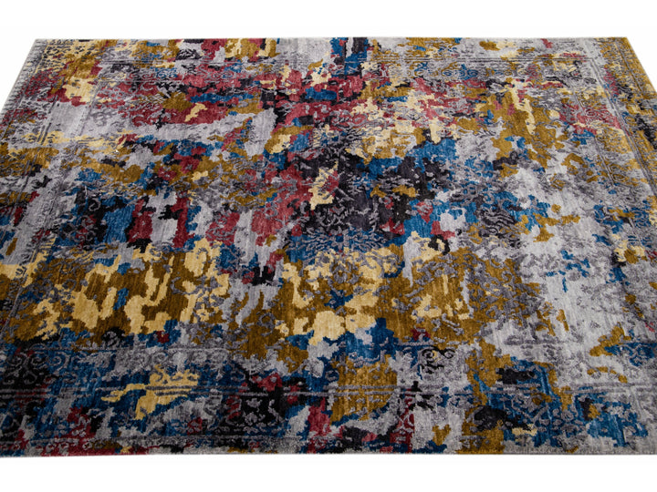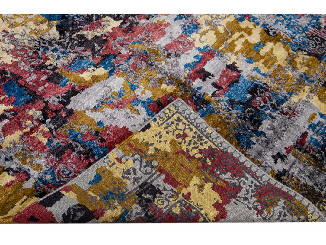 Modern Abstract Indian Handmade Multicolor Wool and Silk Rug