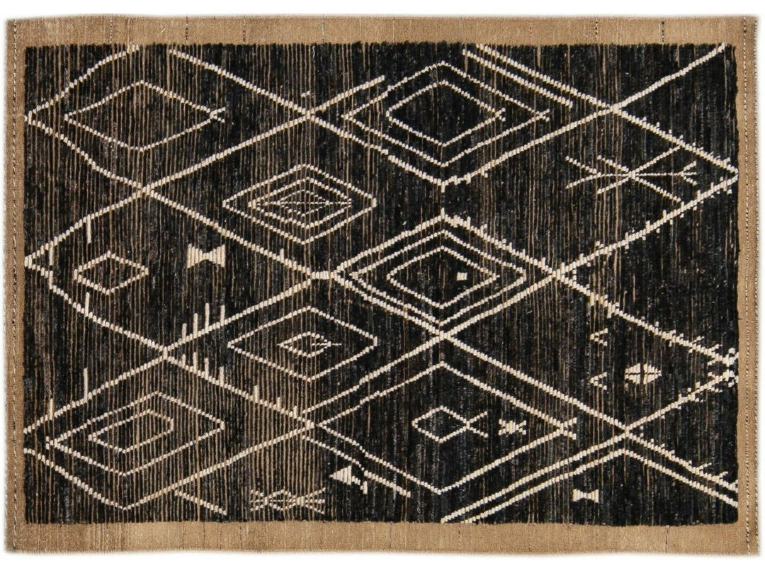 Beautiful Moroccan style handmade wool rug with a brown field. This Modern rug has tan accents featuring a gorgeous all-over geometric boho design.