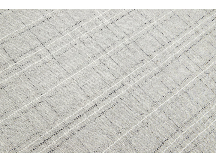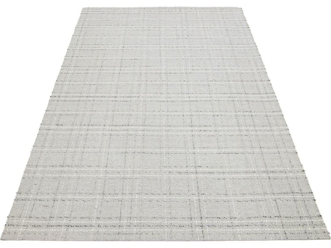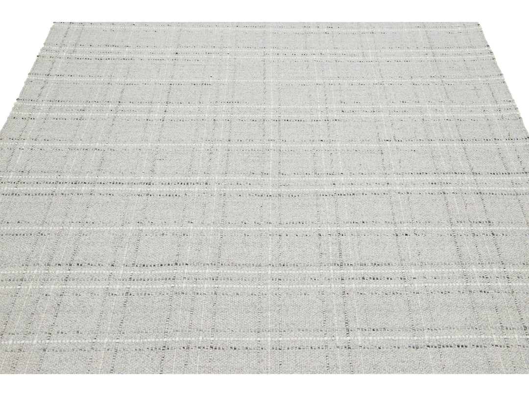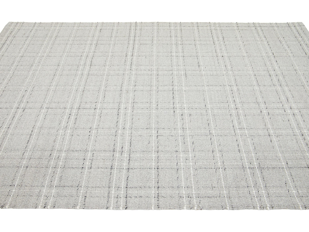 This is a beautiful kilim handmade wool rug with a beige field. This custom modern flatweave rug from our Nantucket collection has gray accents and a gorgeous, all-over geometric design. This rug measures 5' x 8'.