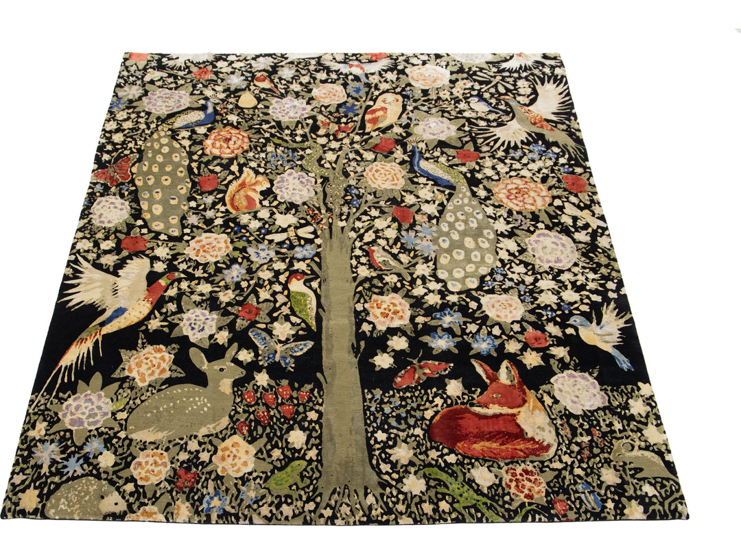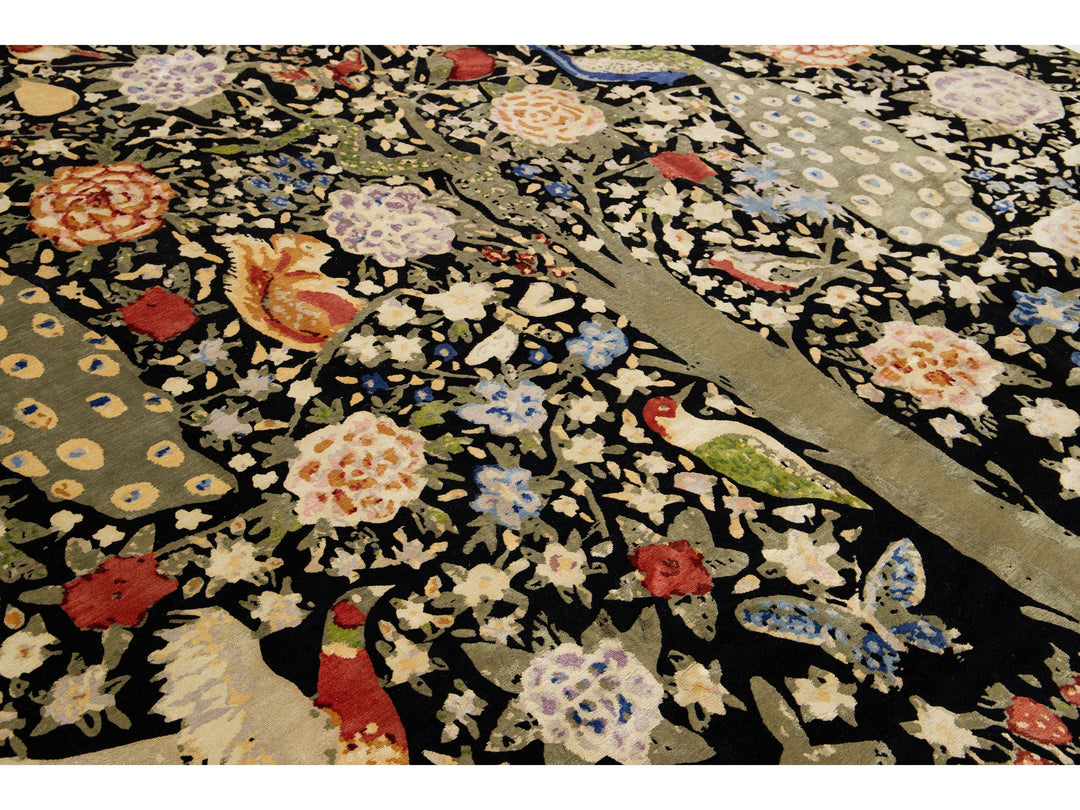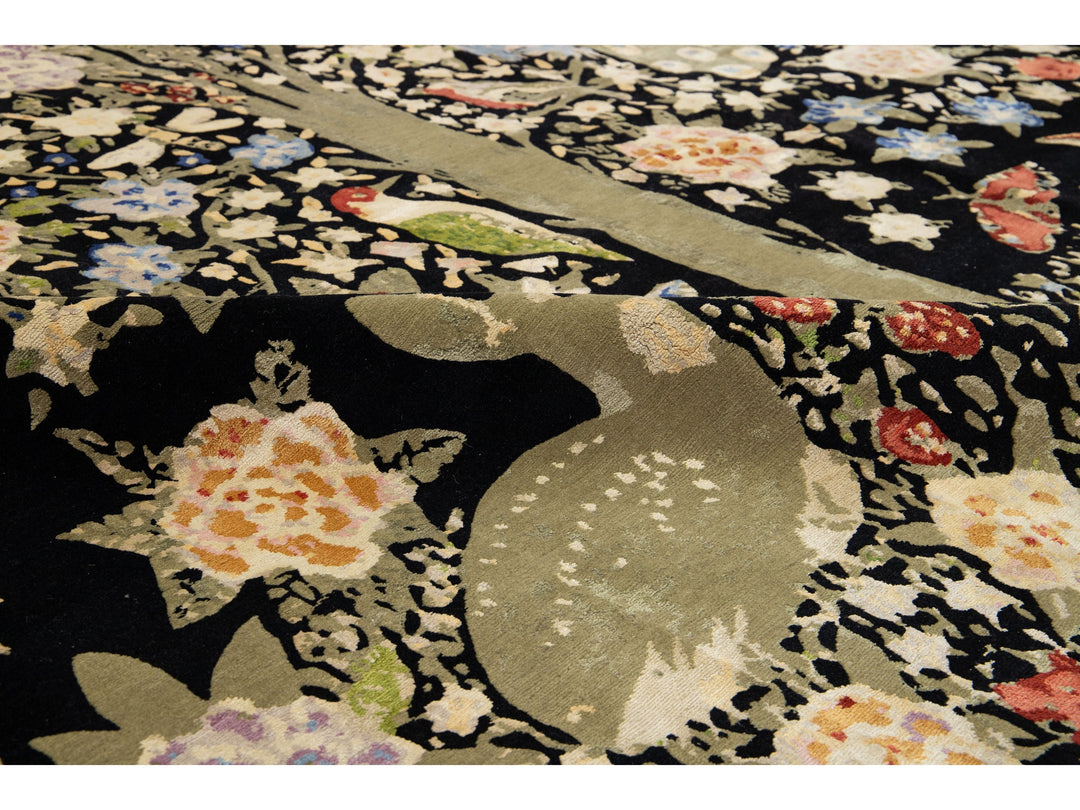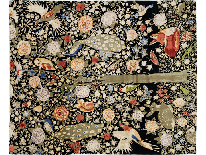 This modern One-of-a-kind Nepalese rug showcases a pictorial all-over design that depicts landscapes, nature, and scenes of daily animal life. It is typically made from Tibetan wool or silk, featuring fine details and vibrant colors. This rug's beautiful pattern makes it a perfect addition to any home. This rug measures 8'3'' x 10'.