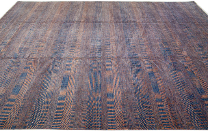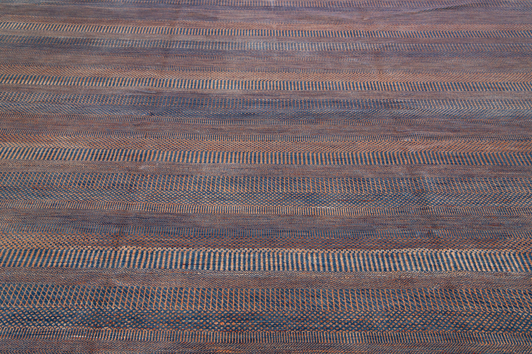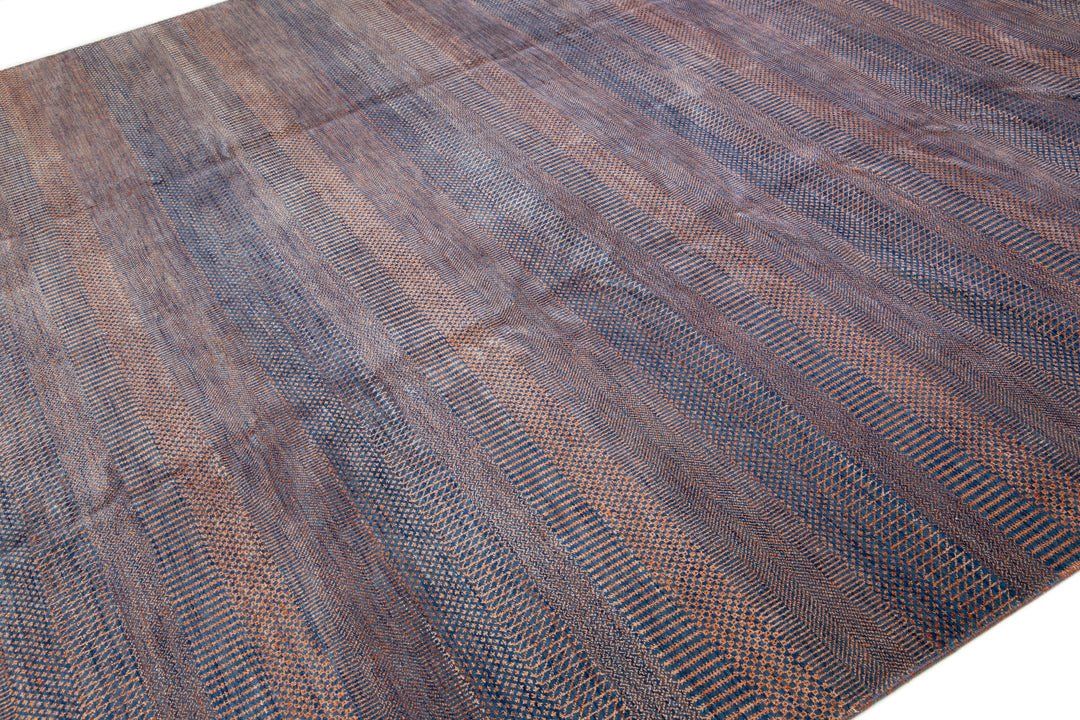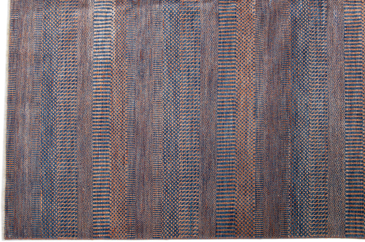 This elegant hand knotted rug is made of wool. It features a subtle orange and blue color scheme accented by an all-over geometric pattern—an ideal addition to any contemporary interior.