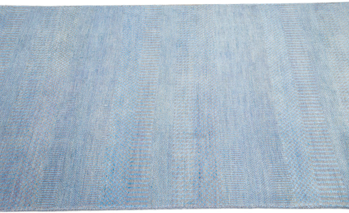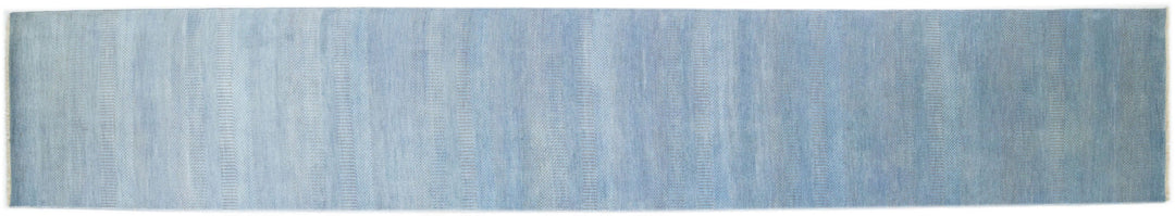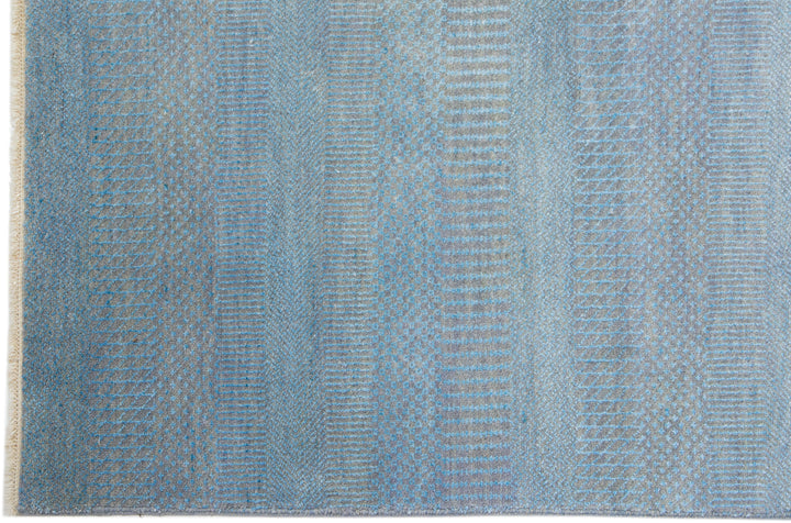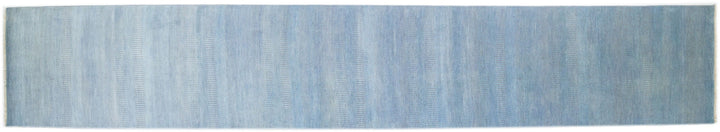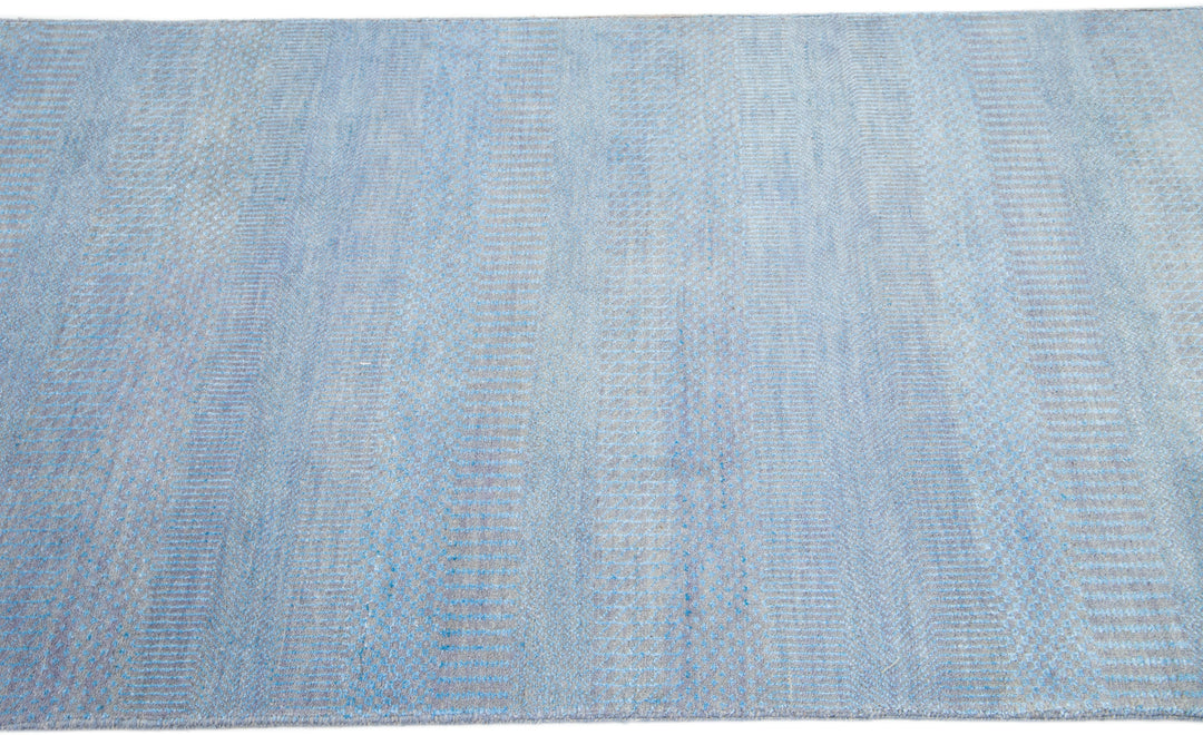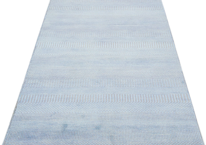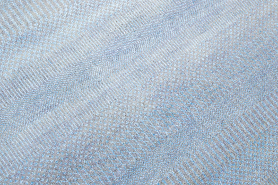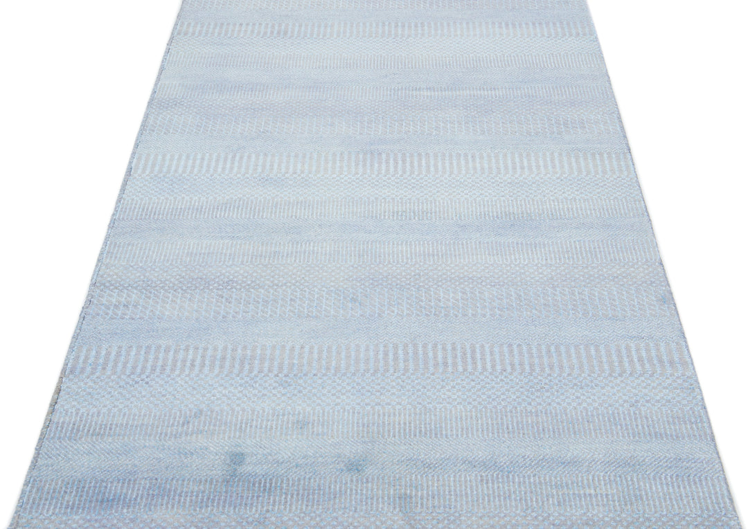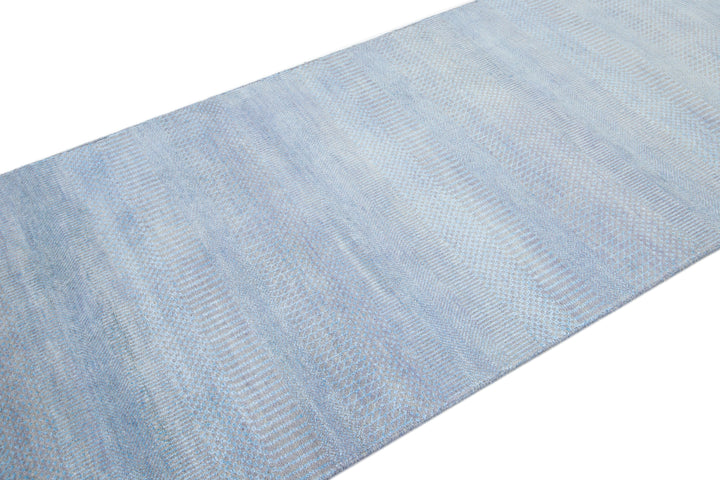 This long hand-knotted rug is made of wool. It features a subtle light blue color scheme accented by an all-over geometric pattern—an ideal addition to any contemporary interior.