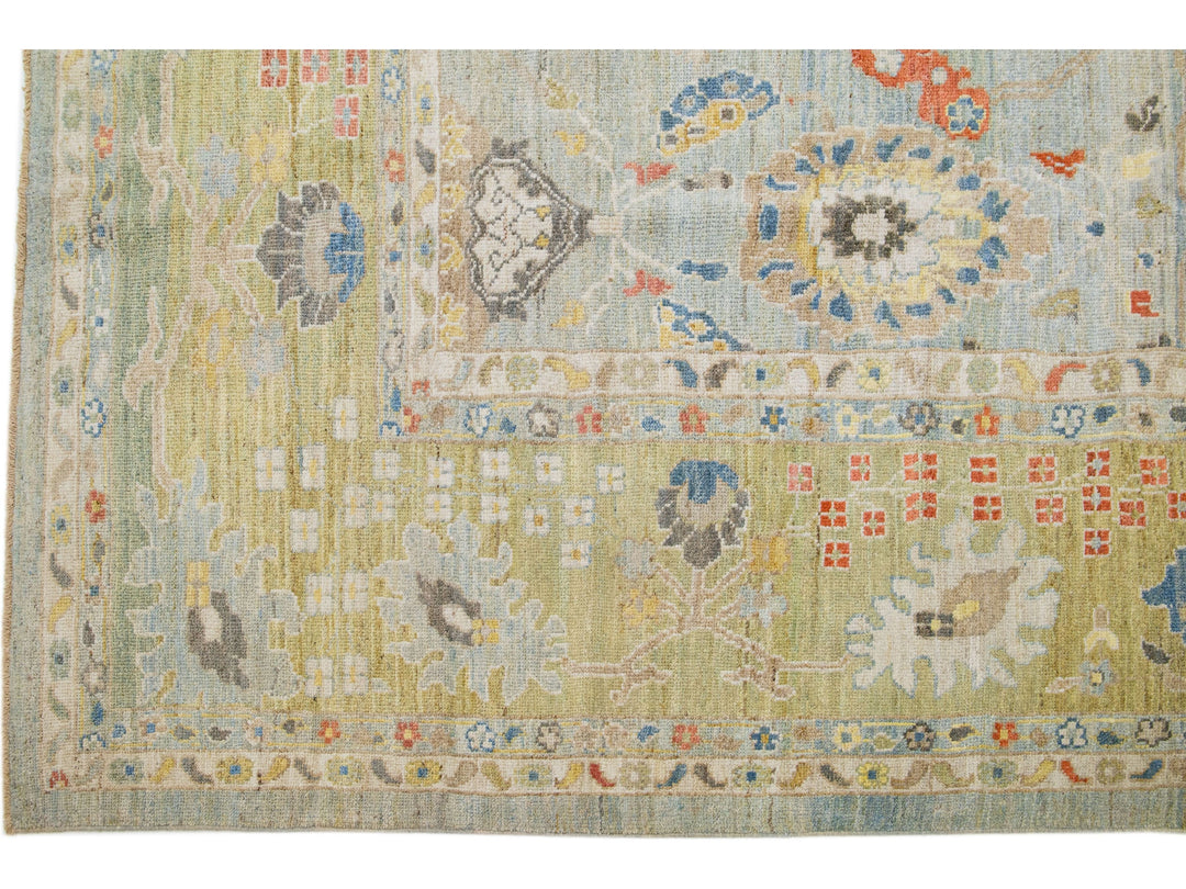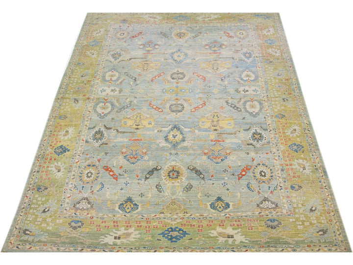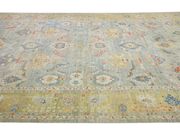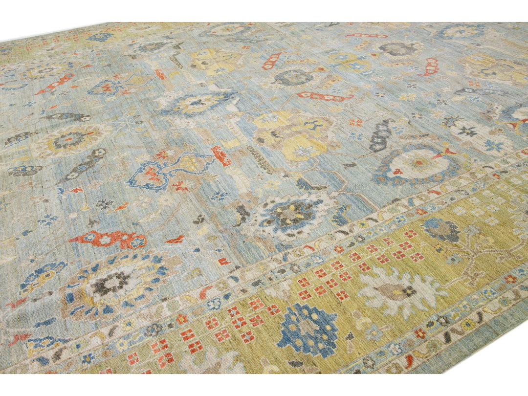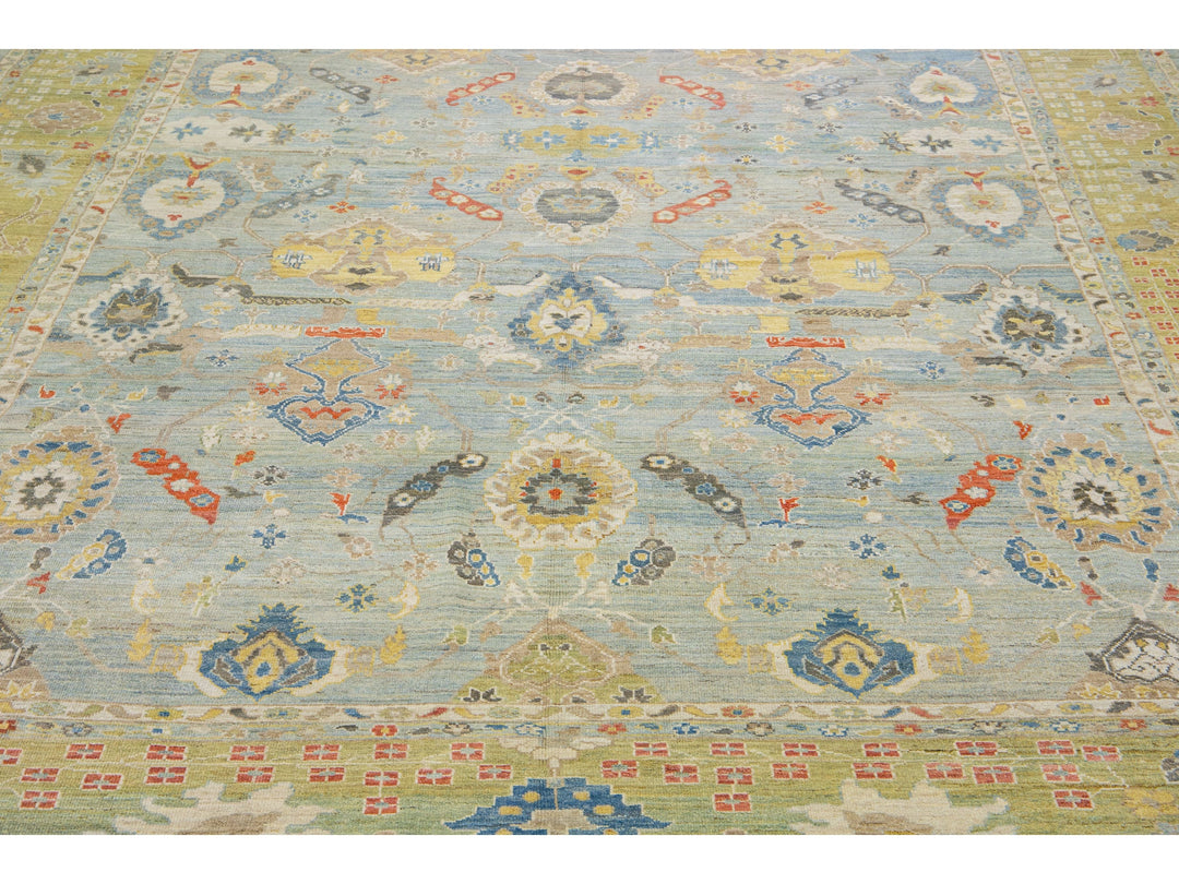 This contemporary take on the traditional Sultanabad style is showcased in an exquisite hand-knotted wool rug with a striking light blue color. An intricately designed frame accentuates its all-over floral motif, adorned with multicolored accents that enhance its charm.