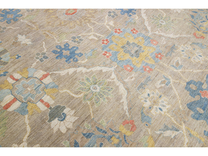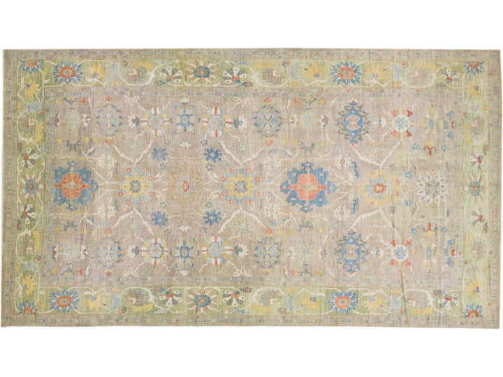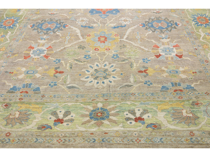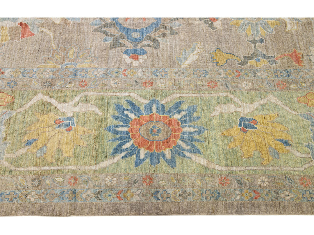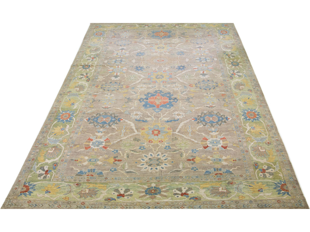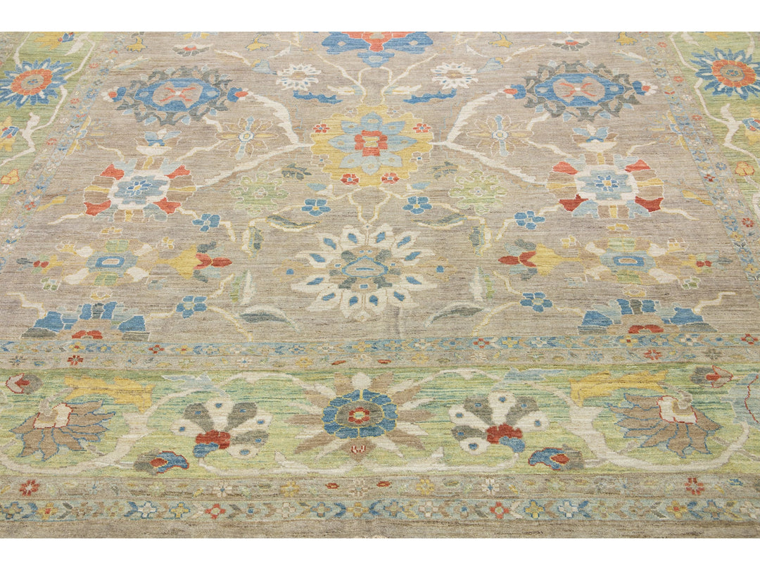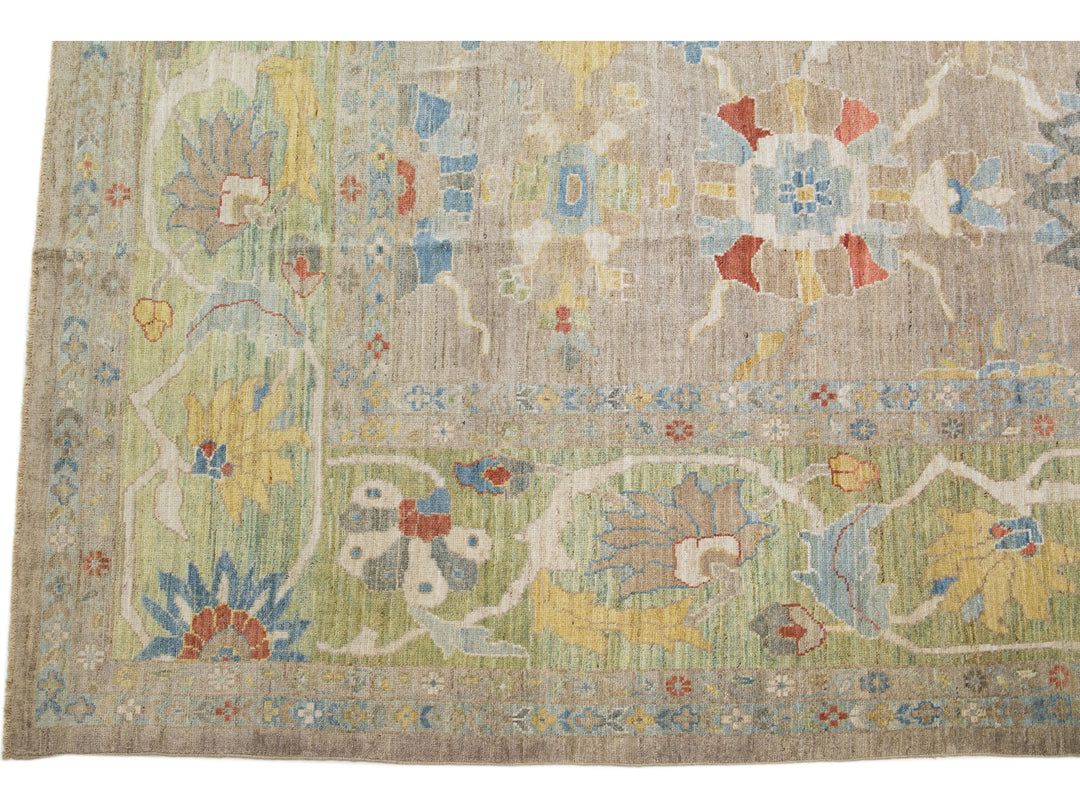 Beautiful modern Sultanabad hand-knotted wool rug with a tan color field. This rug has a green-designed frame with multicolor accents in a gorgeous all-over floral motif.