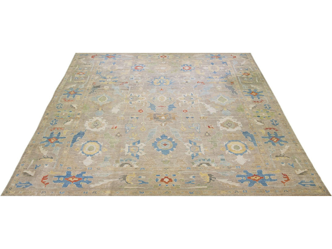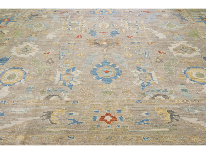 Beautiful modern sultanabad hand-knotted wool rug with a beige color field. This rug has a designed frame with multicolor accents in a gorgeous all-over floral design.