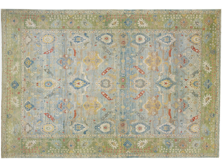 This contemporary take on the traditional Sultanabad style is showcased in an exquisite hand-knotted wool rug with a striking light blue color. An intricately designed frame accentuates its all-over floral motif, adorned with multicolored accents that enhance its charm.