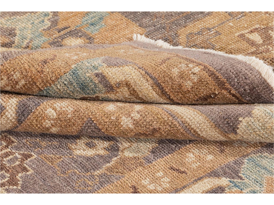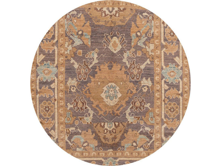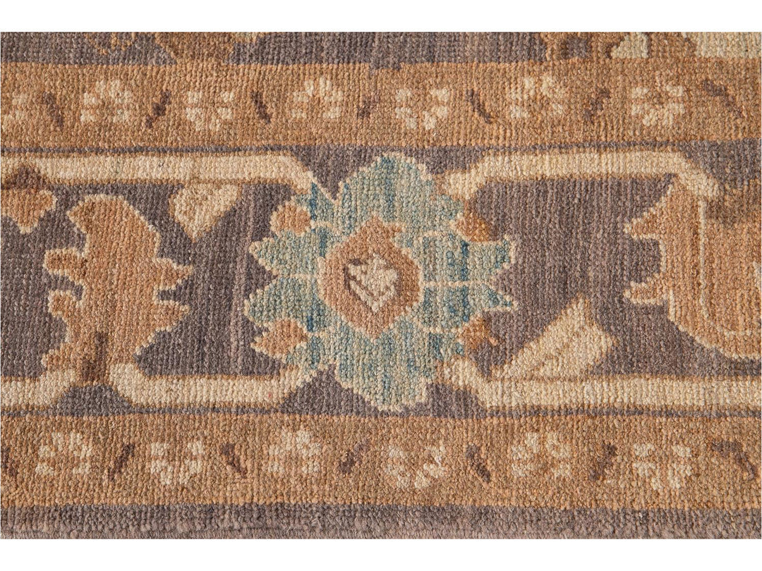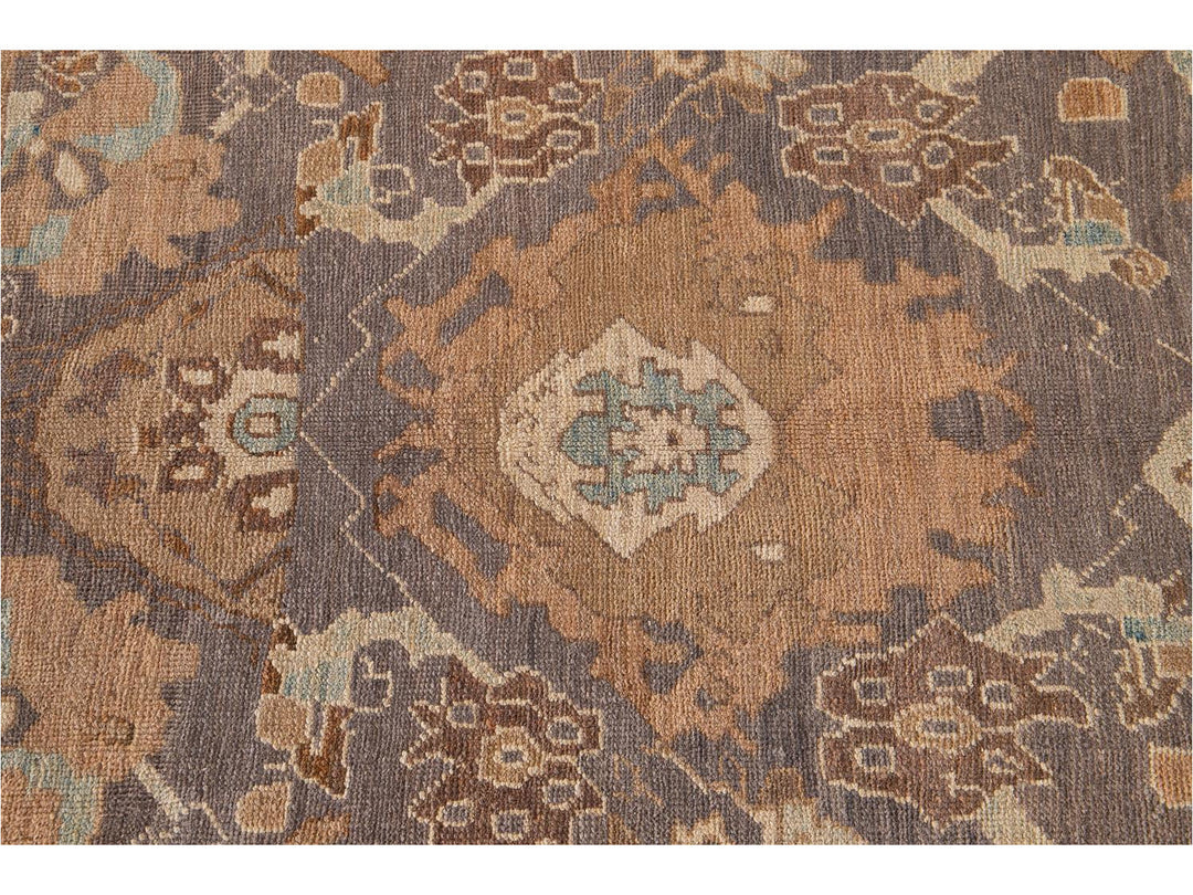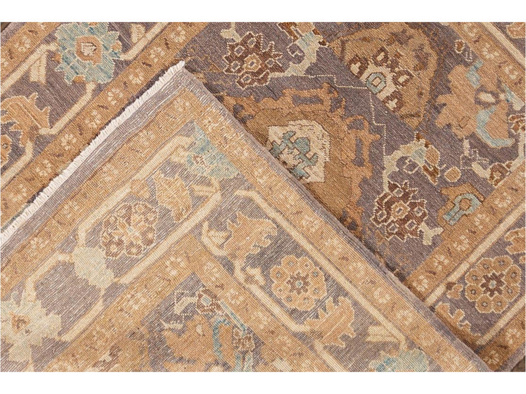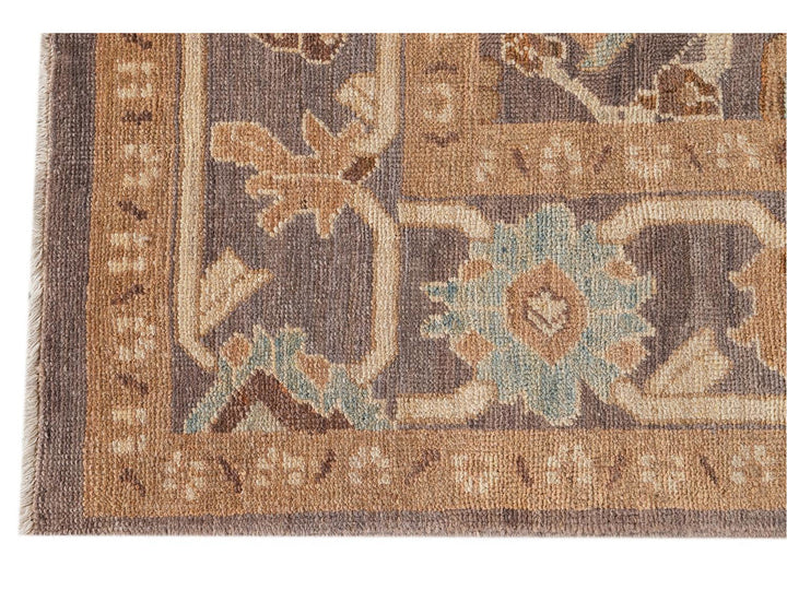 A beautifully designed hand knotted Sultanabad rug with an all-over brown motif with a border and a light blue field.