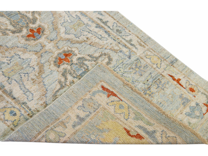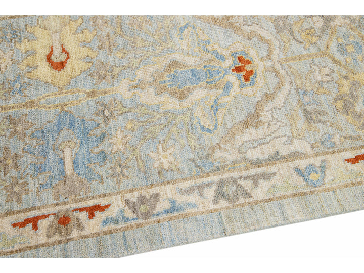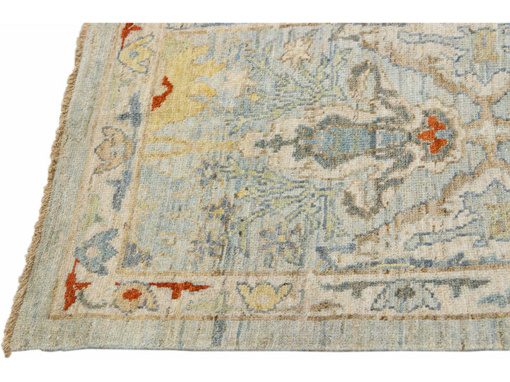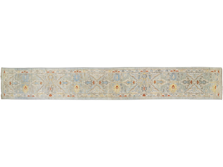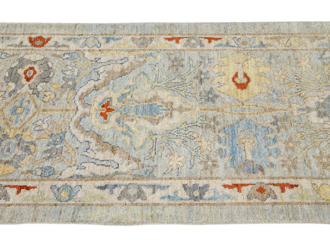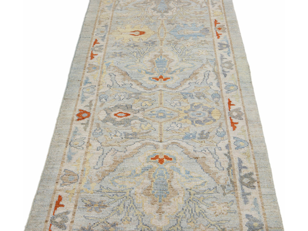 Beautiful modern Sultanabad hand-knotted wool runner with a light blue field. This Sultanabad runner has multi-color accents in a gorgeous all-over Classic floral design.
