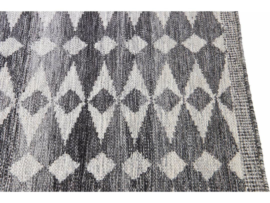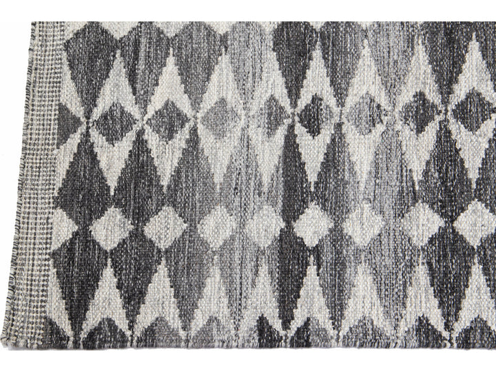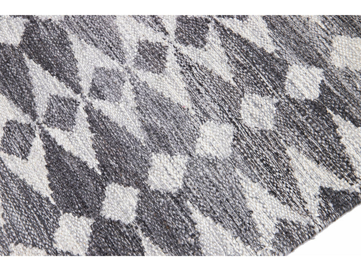 Beautiful modern Swedish-style wool rug with a gray field. This piece has white accents featuring a gorgeous all-over geometric abstract design.