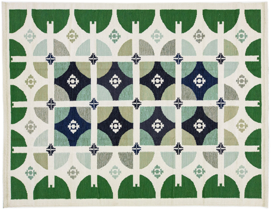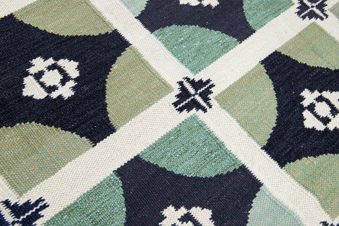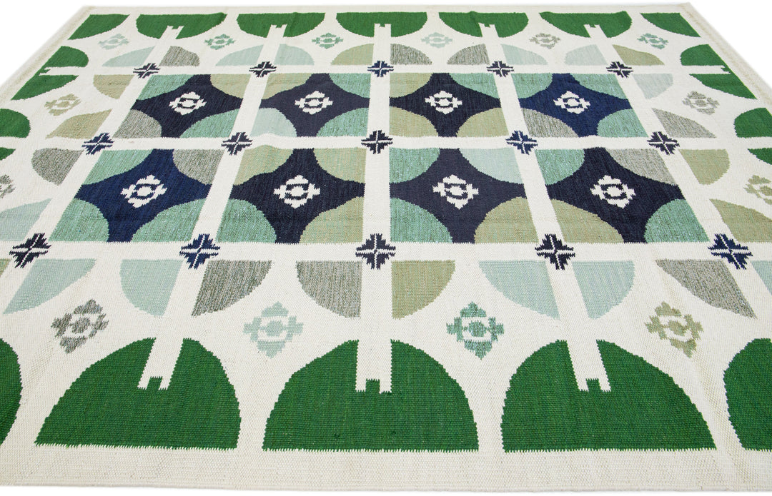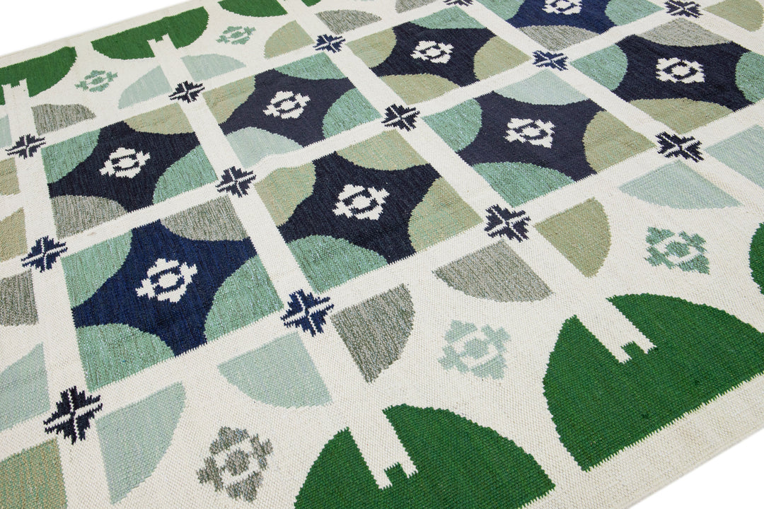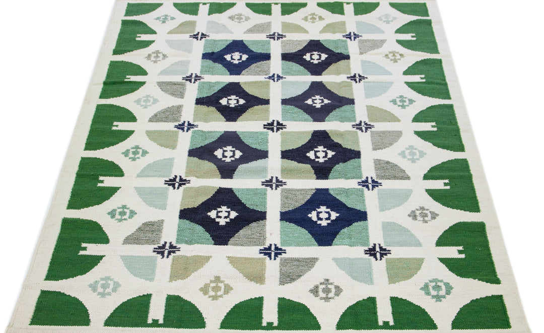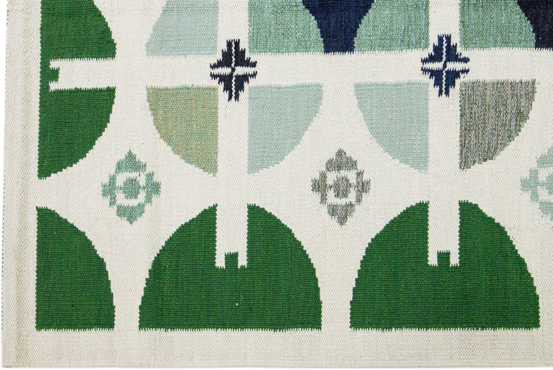 This contemporary wool rug, influenced by Swedish design, showcases an elegant ivory background. This Swedish-style rug is a true beauty, adorned with a stunning green geo abstract pattern.