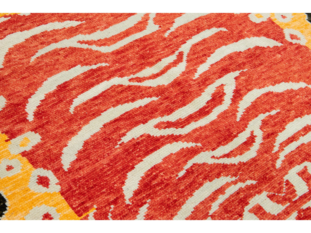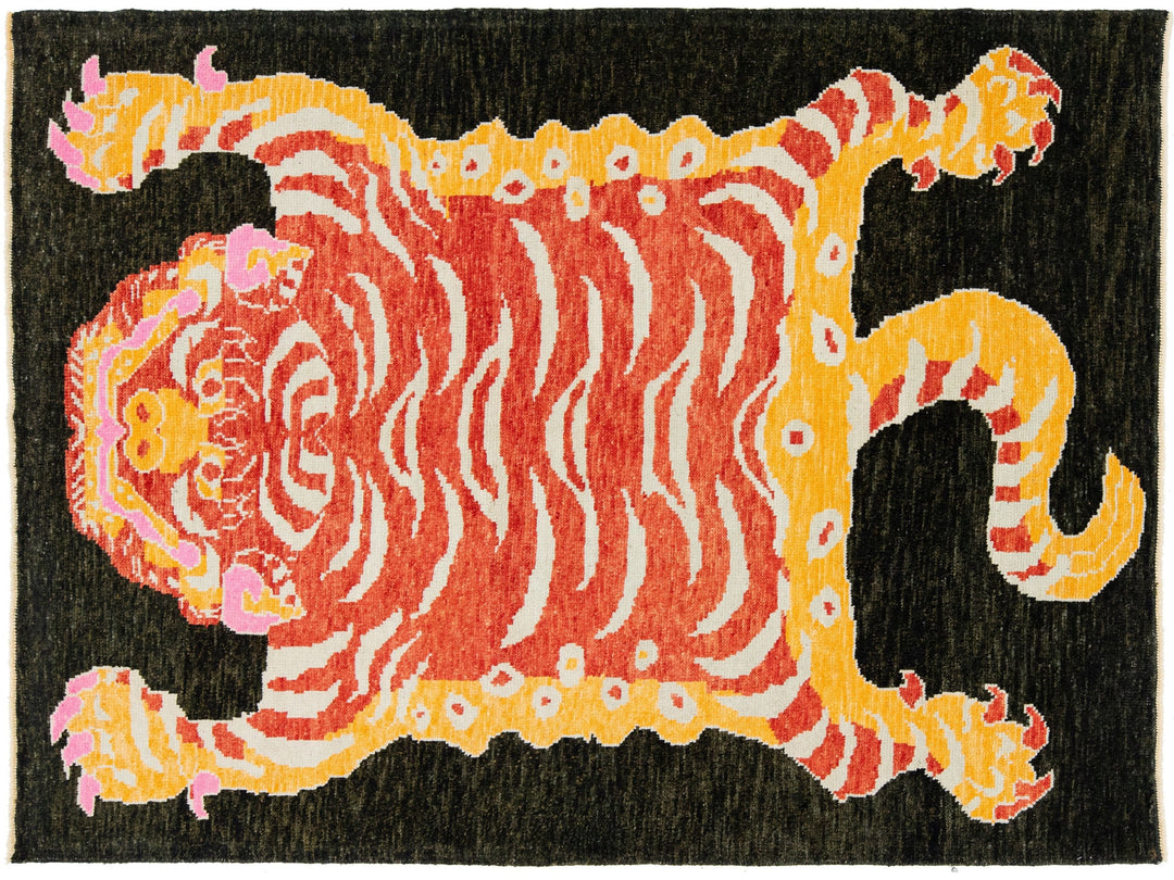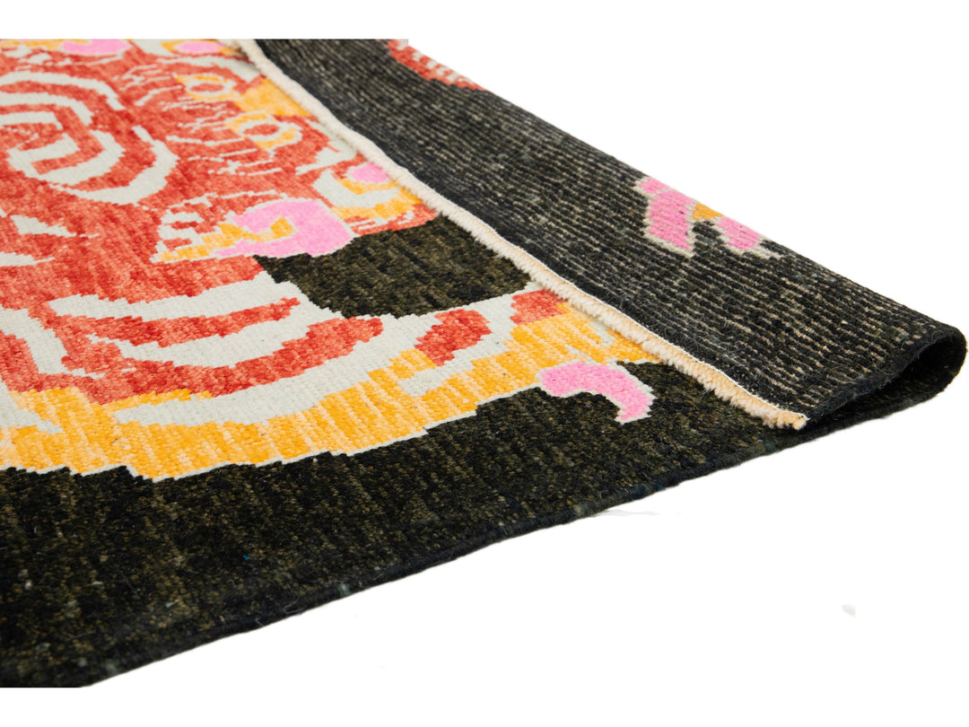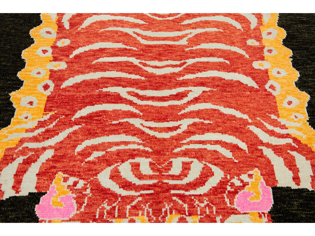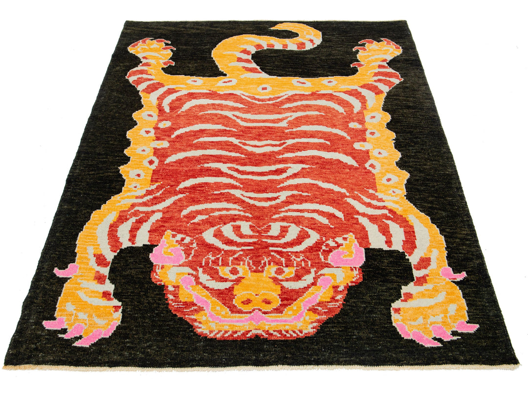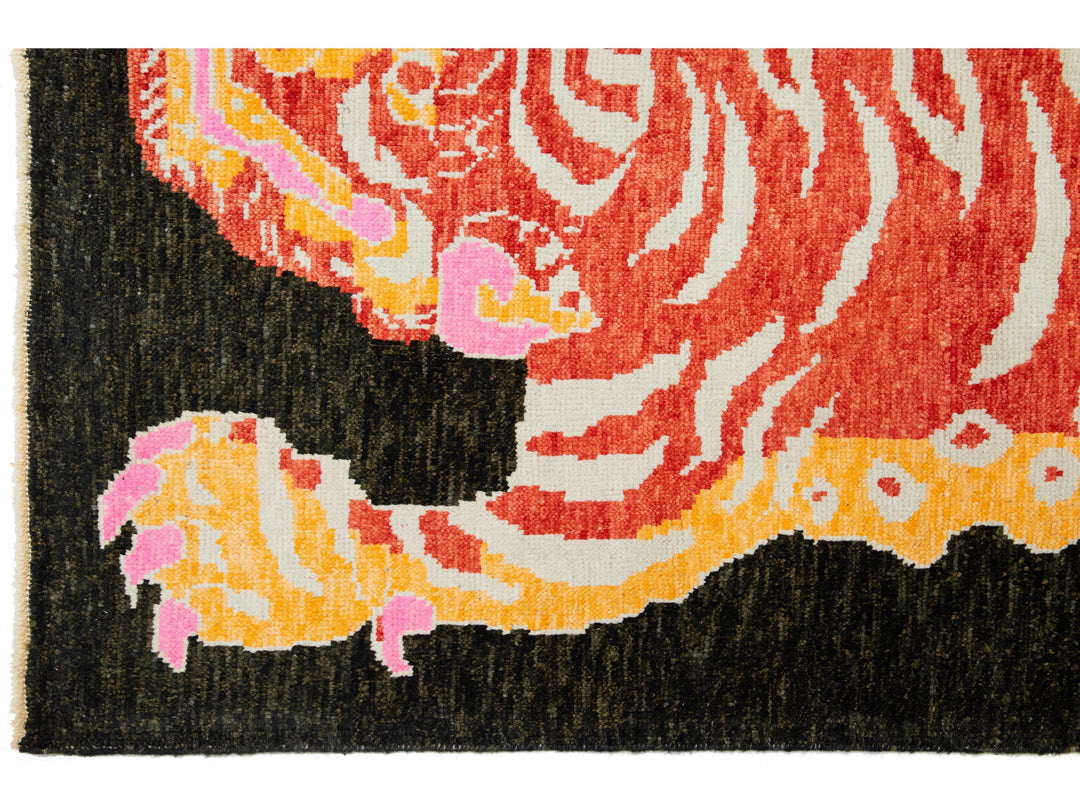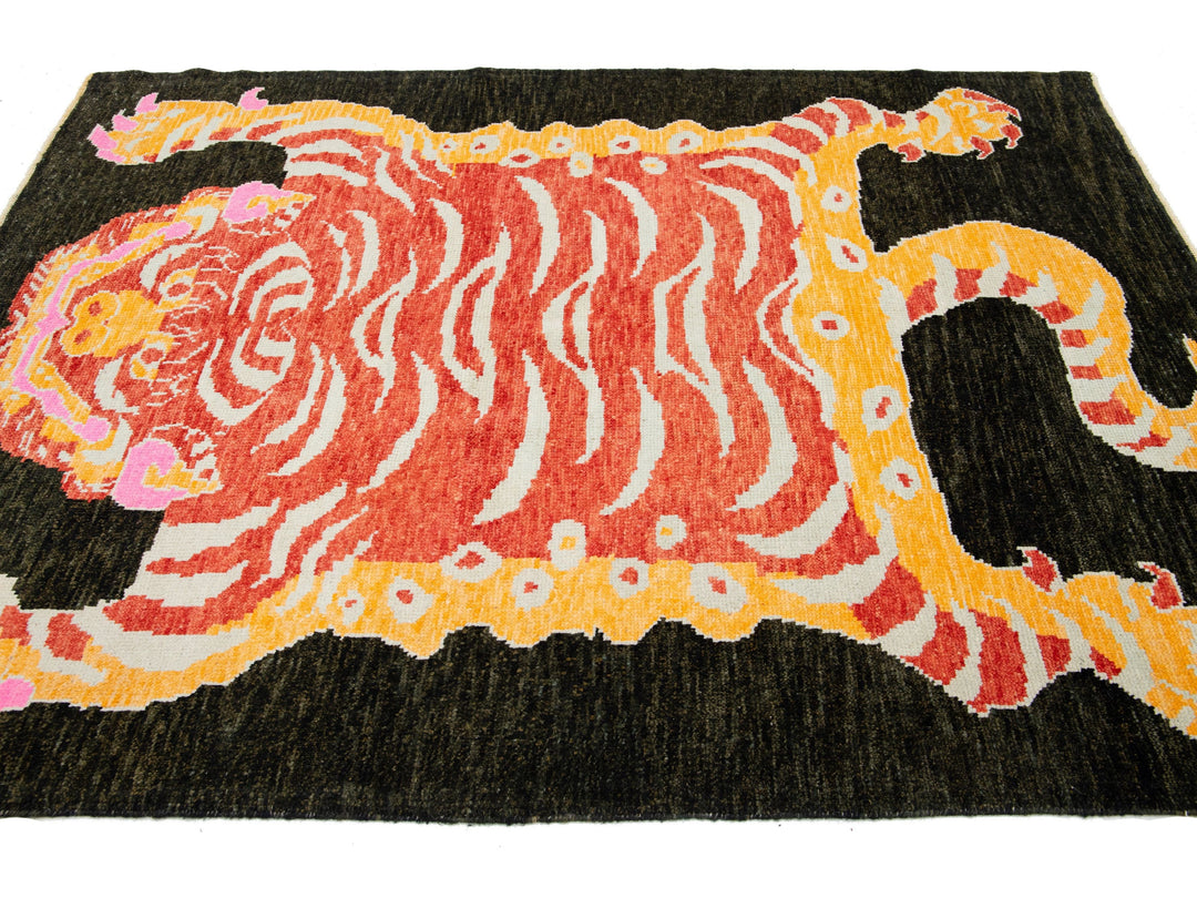 This beautiful Turkish Art Deco wool rug features a dark brown field with orange, red, beige, and pink accent colors and a stunning tiger pictorial design. This rug measures 5'5" x 7'4".